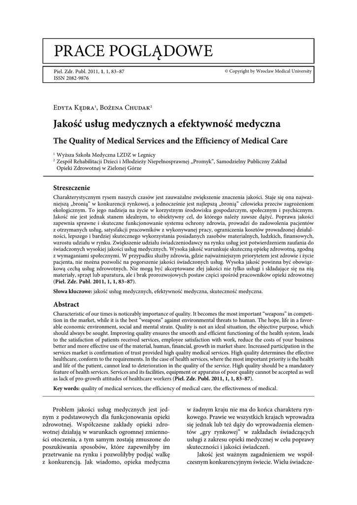prace poglądowe Piel. Zdr. Publ. 2011, 1, 1, 83–87 ISSN 2082-9876 © Copyright by Wroclaw Medical University Edyta Kędra1, Bożena Chudak2 Jakość usług medycznych a efektywność medyczna The Quality of Medical Services and the Efficiency of Medical Care Wyższa Szkoła Medyczna LZDZ w Legnicy Zespół Rehabilitacji Dzieci i Młodzieży Niepełnosprawnej „Promyk”, Samodzielny Publiczny Zakład Opieki Zdrowotnej w Zielonej Górze 1 2 Streszczenie Charakterystycznym rysem naszych czasów jest zauważalne zwiększenie znaczenia jakości. Staje się ona najważniejszą „bronią” w konkurencji rynkowej, a jednocześnie jest najlepszą „bronią” człowieka przeciw zagrożeniom ekologicznym. To jego nadzieja na życie w korzystnym środowisku gospodarczym, społecznym i psychicznym. Jakość nie jest jednak stanem idealnym, to obiektywny cel, do którego należy zawsze dążyć. Poprawa jakości zapewnia sprawne i skuteczne funkcjonowanie systemu ochrony zdrowia, prowadzi do zadowolenia pacjentów z otrzymanych usług, satysfakcji pracowników z wykonywanej pracy, ograniczenia kosztów prowadzonej działalności, lepszego i bardziej skutecznego wykorzystania posiadanych zasobów materialnych, ludzkich, finansowych, wzrostu udziału w rynku. Zwiększenie udziału świadczeniodawcy na rynku usług jest potwierdzeniem zaufania do świadczonych wysokiej jakości usług medycznych. Wysoka jakość warunkuje skuteczną opiekę zdrowotną, zgodną z wymaganiami społecznymi. W przypadku służby zdrowia, gdzie najważniejszym priorytetem jest zdrowie i życie pacjenta, nie można pozwolić na pogorszenie jakości świadczonych usług. Wysoka jakość powinna być obowiązkową cechą usług zdrowotnych. Nie mogą być akceptowane złej jakości nie tylko usługi i składające się na nią materiały, sprzęt lub aparatura, ale i brak prorozwojowych postaw części spośród pracowników opieki zdrowotnej (Piel. Zdr. Publ. 2011, 1, 1, 83–87). Słowa kluczowe: jakość usług medycznych, efektywność medyczna, skuteczność medyczna. Abstract Characteristic of our times is noticeably importance of quality. It becomes the most important “weapons” in competition in the market, while it is the best “weapons” against environmental threats to human. The hope, life in a favorable economic environment, social and mental strain. Quality is not an ideal situation, the objective purpose, which should always be sought. Improving quality ensures the smooth and efficient functioning of the health system, leads to the satisfaction of patients received services, employee satisfaction with work, reduce the costs of your business better and more effective use of the material, human, financial, growth in market share. Increased participation in the services market is confirmation of trust provided high quality medical services. High quality determines the effective healthcare, conform to the requirements. In the case of health services, where the most important priority is the health and life of the patient, cannot lead to deterioration in the quality of the service. High quality should be a mandatory feature of health services. Services and its facilities, equipment or apparatus of poor quality cannot be accepted as well as lack of pro-growth attitudes of healthcare workers (Piel. Zdr. Publ. 2011, 1, 1, 83–87). Key words: quality of medical services, the efficiency of medical care, the effectiveness of medical. Problem jakości usług medycznych jest jednym z podstawowych dla funkcjonowania opieki zdrowotnej. Współczesne zakłady opieki zdrowotnej działają w warunkach ogromnej zmienności otoczenia, a tym samym zostają zmuszone do poszukiwania sposobów, które zapewniłyby im przetrwanie na rynku i pozwoliłyby podjąć walkę z konkurencją. Jak wiadomo, opieka medyczna w żadnym kraju nie ma do końca charakteru rynkowego. Prawie we wszystkich krajach wprowadza się jednak lub też dąży do wprowadzenia elementów „gry rynkowej” w zakładach świadczących usługi z zakresu opieki medycznej w celu poprawy skuteczności i jakości świadczeń. Jakość jest ważnym zagadnieniem we współczesnym konkurencyjnym świecie. Wielu świadcze- 84 niodawców jednak nadal sobie tego nie uświadamia. Zakłady opieki zdrowotnej są organizacjami, które powinny być zainteresowane jakością świadczonych usług – gra toczy się o największą z możliwych stawek: życie i zdrowie człowieka. Wiele osób twierdzi, że trudno jest precyzyjnie określić, jaka powinna być jakość świadczonych usług zdrowotnych. Świadczeniodawcy często tłumaczą się skomplikowanym przypadkiem chorobowym, brakiem środków finansowych, brakiem motywacji, zmęczeniem. Często jako powód ogólnie panującego bezładu w organizacjach świadczących usługi zdrowotne podaje się „dobro pacjenta” [1]. Zdrowie jest specyficzną wartością o szczególnym wymiarze etycznym. Nie jest towarem, nie ma ceny – jest bezcenne. Definicja zdrowia w wymiarze ekonomicznym mówi, że „zdrowie jest szczególnym dobrem ekonomicznym, które ma dla pacjenta znaczną wartość, wynikającą zarówno z jego bezpośredniego, jak i pośredniego wpływu na osiągany przez pacjenta poziom zadowolenia, a tym samym na wartość jego funkcji użyteczności” [2]. W ocenie dokonanej przez Europejskie Forum Ochrony Zdrowia (Gastein European Health Forum, Health Accession Workshop, 2001) [3] państwa, które przystępują do Unii Europejskiej powinny dążyć do zapewnienia obywatelom dostępu do wysokiej jakości świadczeń zdrowotnych. W świadomości zarówno pracowników opieki zdrowotnej, jak i samych pacjentów powszechne jest przekonanie, że jakość jest wartością, która automatycznie wynika z określonej sytuacji oraz zależy od pewnych kluczowych warunków. Dotyczy to nie tylko usług ściśle zdrowotnych, ale także wszelkich innych usług zwanych usługami towarzyszącymi. Znaczenie właśnie tych usług 