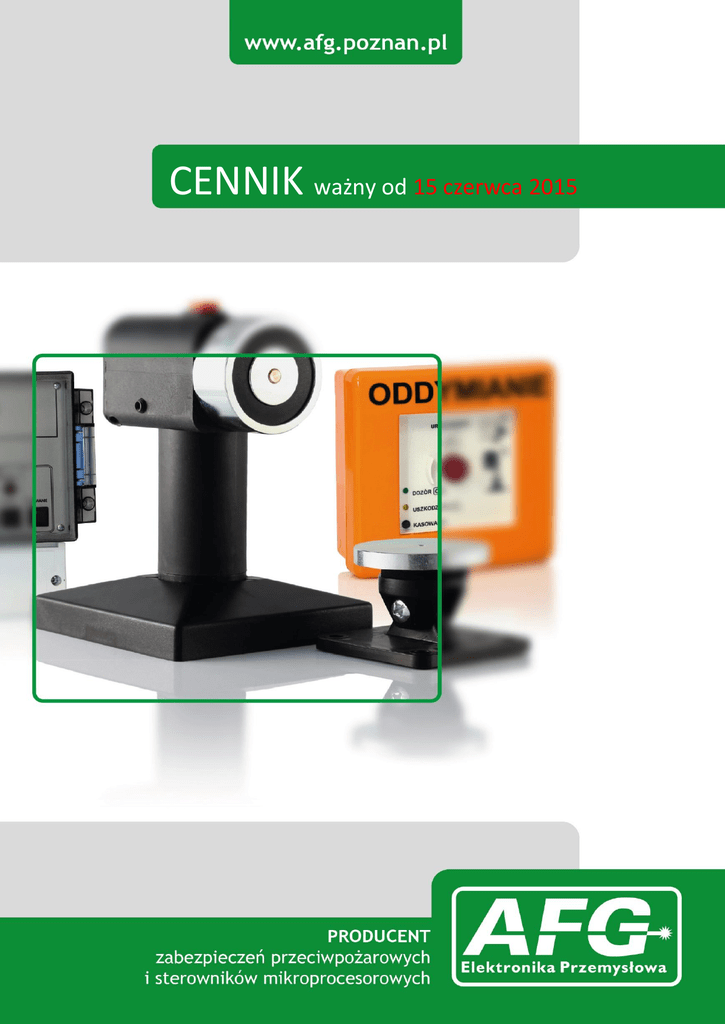 [Wpisz tekst] CENNIK ważny od 15 czerwca 2015 AFG Elektronika Przemysłowa ul. Krzywa 31 60-118 Poznań tel./fax: 61 866 98 20 www.afg.poznan.pl , [email protected] SYSTEMY ODDYMIANIA Lp.: Nazwa produktu: 1. 2. AFG-2004/2A 1L1G AFG-2004/2A 1L1G-ZE 3. 4. AFG-2004/8A 1L1G AFG-2004/8A 1L1G-ZE 5. AFG-2004/8A 1L1G-WEN 6. 7. AFG-2004/8A 1L2G AFG-2004/8A 1L1G+PP 8. AFG-2004/8A 1L2G-ZE 9. AFG-2004/8A 1L2G-WEN 10. AFG-2004/16A 1L2G 11. 12. 13. AFG-2004/16A 2L2G AFG-2004/24A 1L3G AFG-2004/24A 1L2G+PP 14. 15. 16. 17. AFG-2004/24A 2L3G AFG-2004/24A 3L3G AFG-2004/32A 1L4G AFG-2004/32A 1L3G+PP 18. 19. 20. 21. AFG-2004/32A 2L4G AFG-2004/32A 4L4G AFG-2004/40A 1L5G AFG-2004/40A 1L4G+PP 22. 23. 24. 25. AFG-2004/40A 3L5G AFG-2004/40A 5L5G AFG-2004/48A 1L6G AFG-2004/48A 1L5G+PP 26. 27. AFG-2004/48A 3L6G AFG-2004/48A 6L6G 28. RPO-01 29. 30. 31. RPO-01/SZYBKA PP-20 PP-40 N/T 32. CDW-03 33. 34. 35. 36. Akumulator 1,3Ah Akumulator 2,3Ah Akumulator 5,0Ah Akumulator 7,0Ah 37. 38. 39. 40. 41. 42. AFG-RS485/USB AFG-2004/10K REL-R4-24V REL-GZT-4 ZAS-24VDC/0,4A PIP-2AN/ROZ/3ZYŁ 43. 44. Micra25-szyb 20m Micra25-szyb 30m CENNIK ważny od 15 czerwca 2015 Opis / certyfikat: CENTRALE centrala oddymiania 2A, 1 linia-1 grupa, bez współpracy z SSP, obudowa stalowa / CNBOP (standard) centrala oddymiania 2A, 1 linia-1 grupa, bez współpracy z SSP, obudowa stalowa / CNBOP (ZE-sterowanie impulsem 24VDC 20 sek. np.: elektrowyzwalaczem) centrala oddymiania 8A, 1 linia-1 grupa, współpraca z SSP, obudowa stalowa / CNBOP (standard) centrala oddymiania 8A, 1 linia-1 grupa, współpraca z SSP, obudowa stalowa / CNBOP (ZE-sterowanie impulsem 24VDC 20 sek. np.: elektrowyzwalaczem) centrala oddymiania 8A, 1 linia-1 grupa, współpraca z SSP, obudowa stalowa / CNBOP (WEN-sterowanie napięciem 24VDC np.: stycznikiem wentylatora) centrala oddymiania 8A, 1 linia-2 grupy, współpraca z SSP, obudowa stalowa / CNBOP (standard) centrala oddymiania 8A, 1 linia-1 grupa +PP, współpraca z SSP, obudowa stalowa / CNBOP (standard) (PP-moduł przekaźników pomocniczych np.: do sterowania wentylatorami, trzymaczami) centrala oddymiania 8A, 1 linia-2 grupy, współpraca z SSP, obudowa stalowa / CNBOP (sterowanie: 1G-siłownikami, 2G- ZE-impulsem 24VDC 20 sek. np.: elektrowyzwalaczem) centrala oddymiania 8A, 1 linia-2 grupy, współpraca z SSP, obudowa stalowa / CNBOP (sterowanie: 1G-siłownikami, 2G- WEN-napięciem 24VDC np.: stycznikiem wentylatora) centrala oddymiania 16A (2x8A), 1 linia-2 grupy, współpraca z SSP, obudowa stalowa / CNBOP (standard) centrala oddymiania 16A (2x8A), 2 linie-2 grupy, współpraca z SSP, obudowa stalowa / CNBOP centrala oddymiania 24A (3x8A), 1 linia-3 grupy, współpraca z SSP, obudowa stalowa / CNBOP centrala oddymiania 24A (2x8A), 1 linia-2 grupy +PP, współpraca z SSP, obudowa stalowa / CNBOP (PP-moduł przekaźników pomocniczych np.: do sterowania wentylatorami, trzymaczami) centrala oddymiania 24A (3x8A), 2 linie-3 grupy, współpraca z SSP, obudowa stalowa / CNBOP centrala oddymiania 24A (3x8A), 3 linie-3 grupy, współpraca z SSP, obudowa stalowa / CNBOP centrala oddymiania 32A (4x8A), 1 linia-4 grupy, współpraca z SSP, obudowa stalowa / CNBOP centrala oddymiania 32A (3x8A), 1 linia-3 grupy +PP, współpraca z SSP, obudowa stalowa / CNBOP (PP-moduł przekaźników pomocniczych np.: do sterowania wentylatorami, trzymaczami) centrala oddymiania 32A (4x8A), 2 linie-4 grupy, współpraca z SSP, obudowa stalowa / CNBOP centrala oddymiania 32A (4x8A), 4 linie-4 grupy, współpraca z SSP, obudowa stalowa / CNBOP centrala oddymiania 40A (5x8A), 1 linia-5 grup, współpraca z SSP, obudowa stalowa / CNBOP centrala oddymiania 40A (4x8A), 1 linia-4 grupy +PP, współpraca z SSP, obudowa stalowa / CNBOP (PP-moduł przekaźników pomocniczych np.: do sterowania wentylatorami, trzymaczami) centrala oddymiania 40A (5x8A), 3 linie-5 grup, współpraca z SSP, obudowa stalowa / CNBOP centrala oddymiania 40A (5x8A), 5 linii-5 grup, współpraca z SSP, obudowa stalowa / CNBOP centrala oddymiania 48A (6x8A), 1 linia-6 grup, współpraca z SSP, obudowa stalowa / CNBOP centrala oddymiania 48A (5x8A), 1 linia-5 grup +PP, współpraca z SSP, obudowa stalowa / CNBOP (PP-moduł przekaźników pomocniczych np.: do sterowania wentylatorami, trzymaczami) centrala oddymiania 48A (6x8A), 3 linie-6 grup, współpraca z SSP, obudowa stalowa / CNBOP centrala oddymiania 48A (6x8A), 6 linii-6 grup, współpraca z SSP, obudowa stalowa / CNBOP PRZYCISKI ręczny przycisk oddymiania z sygnalizacją optyczno-akustyczną, natynkowy, kolor pomarańczowy / CNBOP szybka ręcznego przycisku oddymiania przycisk przewietrzania klawiaturowy z sygnalizacją diodową, natynkowy, 24VDC przełącznik przewietrzania kluczykowy 1-biegunowy zwierny, natynkowy CZUJKI POGODOWE czujka pogodowa deszcz–wiatr AKUMULATORY akumulator 1,3Ah/12V, bezobsługowy (2szt. centrala AFG-2004/2A oraz AFG-2) akumulator 2,3Ah/12V, bezobsługowy (2szt. centrala AFG-2004/8A) akumulator 5,0Ah/12V, bezobsługowy (2szt. centrala AFG-2004/8A 1L1G+PP, 1L2G oraz 16A1L2G) akumulator 7,0Ah/12V, bezobsługowy (4szt. centrala AFG-2004/24A i 32A, 6szt. 40A i 48A) AKCESORIA DODATKOWE konwerter RS485/USB-PC, moduł komunikacyjny centrali AFG-2004 + program wizualizacji parametr linii siłowników 2x10kΩ przekaźnik pomocniczy 4 styki przełączne 230VAC/6A podstawka przekaźnika R4, montaż na szynie TS35 zasilacz pomocniczy 24VDC/0,42A puszka instalacyjna rozgałęźna 3 żyły 4mm2, prostokątna / CNBOP ODDYMIANIE SZYBÓW WINDOWYCH - NOWOŚĆ zestaw do szybu windowego 20m, czujka zasysająca Micra 25, rurki PCV z osprzętem / CNBOP zestaw do szybu windowego 30m, czujka zasysająca Micra 25, rurki PCV z osprzętem / CNBOP Cena netto: 1 190 zł 1 190 zł 1 520 zł 1 520 zł 1 520 zł 2 050 zł 2 050 zł 2 050 zł 2 050 zł 2 150 zł 2 790 zł 4 250 zł 4 250 zł 4 450 zł 4 890 zł 4 750 zł 4 750 zł 4 950 zł 5 690 zł 6 450 zł 6 450 zł 6 850 zł 7 200 zł 6 990 zł 6 990 zł 7 390 zł