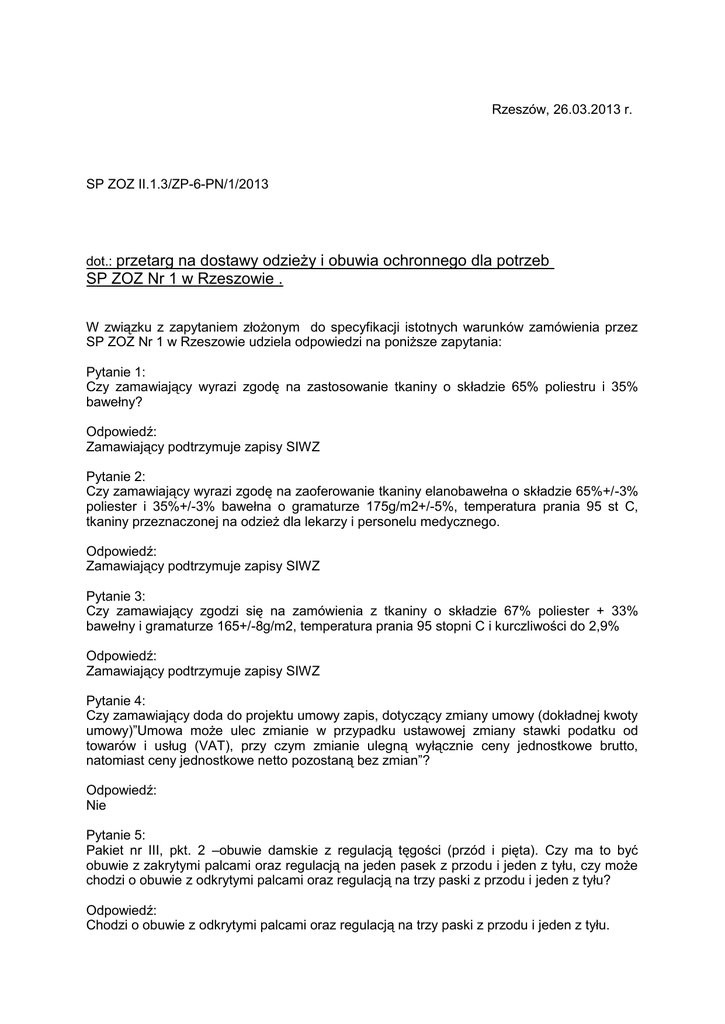 Rzeszów, 26.03.2013 r. SP ZOZ II.1.3/ZP-6-PN/1/2013 dot.: przetarg na dostawy odzieży i obuwia ochronnego dla potrzeb SP ZOZ Nr 1 w Rzeszowie . W związku z zapytaniem złożonym do specyfikacji istotnych warunków zamówienia przez SP ZOZ Nr 1 w Rzeszowie udziela odpowiedzi na poniższe zapytania: Pytanie 1: Czy zamawiający wyrazi zgodę na zastosowanie tkaniny o składzie 65% poliestru i 35% bawełny? Odpowiedź: Zamawiający podtrzymuje zapisy SIWZ Pytanie 2: Czy zamawiający wyrazi zgodę na zaoferowanie tkaniny elanobawełna o składzie 65%+/-3% poliester i 35%+/-3% bawełna o gramaturze 175g/m2+/-5%, temperatura prania 95 st C, tkaniny przeznaczonej na odzież dla lekarzy i personelu medycznego. Odpowiedź: Zamawiający podtrzymuje zapisy SIWZ Pytanie 3: Czy zamawiający zgodzi się na zamówienia z tkaniny o składzie 67% poliester + 33% bawełny i gramaturze 165+/-8g/m2, temperatura prania 95 stopni C i kurczliwości do 2,9% Odpowiedź: Zamawiający podtrzymuje zapisy SIWZ Pytanie 4: Czy zamawiający doda do projektu umowy zapis, dotyczący zmiany umowy (dokładnej kwoty umowy)”Umowa może ulec zmianie w przypadku ustawowej zmiany stawki podatku od towarów i usług (VAT), przy czym zmianie ulegną wyłącznie ceny jednostkowe brutto, natomiast ceny jednostkowe netto pozostaną bez zmian”? Odpowiedź: Nie Pytanie 5: Pakiet nr III, pkt. 2 –obuwie damskie z regulacją tęgości (przód i pięta). Czy ma to być obuwie z zakrytymi palcami oraz regulacją na jeden pasek z przodu i jeden z tyłu, czy może chodzi o obuwie z odkrytymi palcami oraz regulacją na trzy paski z przodu i jeden z tyłu? Odpowiedź: Chodzi o obuwie z odkrytymi palcami oraz regulacją na trzy paski z przodu i jeden z tyłu. Pytanie 6: Pakiet 1. Czy ubranie dwuczęściowe damskie ma być ze spodniami czy spódnicą z długim czy krótkim rękawem Odpowiedź: Ubranie dwuczęściowe ze spodniami lub spódnicą z krótkim lub długim rękawem Pytanie 7: Pakiet 1. Czy ubranie ma być z długim czy krótkim rękawem, spodnie bez rozporka, szlufek i kieszeni? Odpowiedź: Ubranie ma być z długim lub krótkim rękawem, spodnie z rozporkiem, kieszeniami i gumkami po bokach pasa. Pytanie 8: Fartuchy z krótkim czy długim rękawem? Odpowiedź: Fartuchy z krótkim lub długim rękawem Pytanie 9: Czy zamawiający żąda logo wykonane metodą haftu, które jest trwalsze od sitodruku? Odpowiedź: Nie Pytanie 9: Czy fartuch damski ma mieć zaszewki z przodu i z tyłu? Odpowiedź: Tak