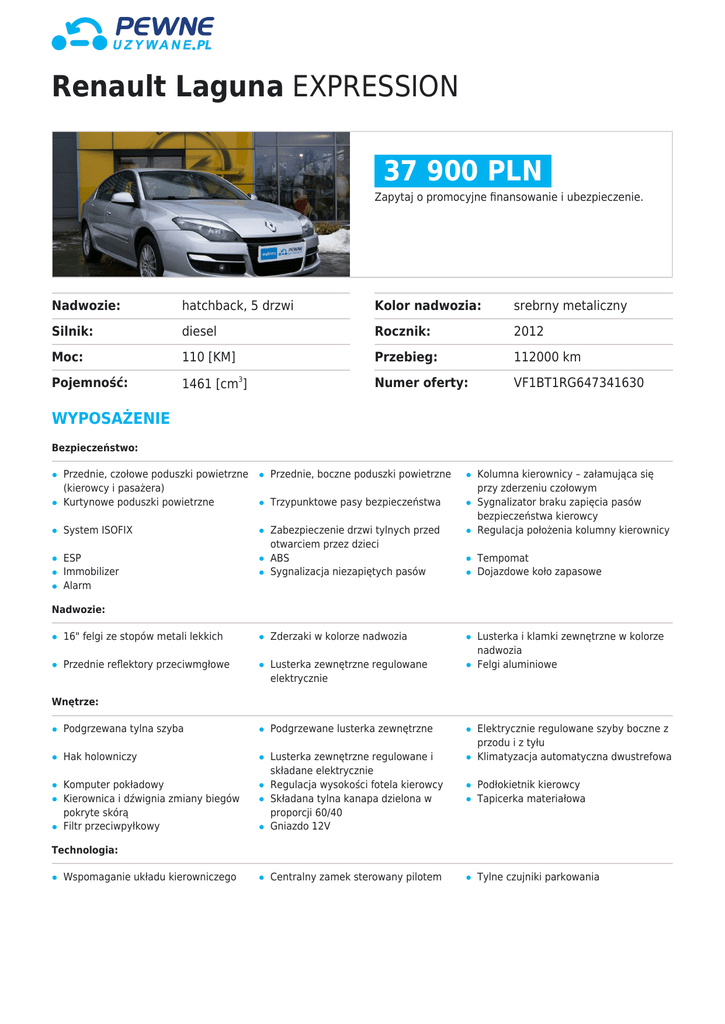 Renault Laguna EXPRESSION 37 900 PLN Zapytaj o promocyjne finansowanie i ubezpieczenie. Nadwozie: hatchback, 5 drzwi Kolor nadwozia: srebrny metaliczny Silnik: diesel Rocznik: 2012 Moc: 110 [KM] Przebieg: 112000 km Pojemność: 1461 [cm ] Numer oferty: VF1BT1RG647341630 3 WYPOSAŻENIE Bezpieczeństwo: Przednie, czołowe poduszki powietrzne (kierowcy i pasażera) Kurtynowe poduszki powietrzne Przednie, boczne poduszki powietrzne System ISOFIX Zabezpieczenie drzwi tylnych przed otwarciem przez dzieci ABS Sygnalizacja niezapiętych pasów ESP Immobilizer Alarm Trzypunktowe pasy bezpieczeństwa Kolumna kierownicy – załamująca się przy zderzeniu czołowym Sygnalizator braku zapięcia pasów bezpieczeństwa kierowcy Regulacja położenia kolumny kierownicy Tempomat Dojazdowe koło zapasowe Nadwozie: 16" felgi ze stopów metali lekkich Zderzaki w kolorze nadwozia Przednie reflektory przeciwmgłowe Lusterka zewnętrzne regulowane elektrycznie Lusterka i klamki zewnętrzne w kolorze nadwozia Felgi aluminiowe Wnętrze: Podgrzewana tylna szyba Podgrzewane lusterka zewnętrzne Hak holowniczy Lusterka zewnętrzne regulowane i składane elektrycznie Regulacja wysokości fotela kierowcy Składana tylna kanapa dzielona w proporcji 60/40 Gniazdo 12V Komputer pokładowy Kierownica i dźwignia zmiany biegów pokryte skórą Filtr przeciwpyłkowy Elektrycznie regulowane szyby boczne z przodu i z tyłu Klimatyzacja automatyczna dwustrefowa Podłokietnik kierowcy Tapicerka materiałowa Technologia: Wspomaganie układu kierowniczego Centralny zamek sterowany pilotem Tylne czujniki parkowania Renault Laguna EXPRESSION Radioodtwarzacz CD / MP3 Zestaw głośnomówiący Bluetooth Inteligentny kluczyk Sterowanie systemem audio przyciskami na kierownicy Automatyczne światła z funkcją follow me home Światła awaryjnego hamowania Czujnik deszczu Przycisk Start/Stop Nawigacja satelitarna GPS DODATKOWE INFORMACJE: WESTMOTOR GRUPA PGD Autoryzowany dealer marki Opel, wchodzący w skład sieci Pewne Używane. Renault Laguna III 1.5 DCi 110KM Oferujemy korzystne formy finansowania zakupu samochodu oraz ubezpieczenia komunikacyjne. Na samochód wystawiamy fakturę VAT 23%. Kupujący nie ponosi opłaty skarbowej. Możliwość odliczenia VAT przy zakupie na firmę. Zapraszamy do kontaktu z naszymi doradcami: +48 667 071 265 +48 667 071 266 +48 61 610 4102 Miejsce ekspozycji: Autoryzowany Dealer Opel WESTMOTOR Grupa PGD ul. Obornicka 125 62-002 Suchy Las GPS: 52°28'37.4"N 16°52'12.9"E Zapraszamy w godzinach: Pon. - Pt: 9:00 – 19:00 Sob.: 9:00 – 14:00 Niniejsze ogłoszenie jest wyłącznie informacją handlową i nie stanowi oferty w myśl art. 66, §1. Kodeksu cywilnego. Sprzedający nie odpowiada za ewentualne błędy lub nieaktualność ogłoszenia. Pewne Używane Poznań, Suchy Las ul. Obornicka 125, tel.:61 610 41 02 www.blog.pgd.pl Nota prawna Dane zawarte w niniejszej propozycji handlowej mają wyłącznie charakter informacyjny. Podane informacje nie stanowią oferty ani zapewnienia, w szczególności w rozumieniu art. 66 § 1 oraz art. 5561 Kodeksu cywilnego. Wiążące ustalenie ceny, wyposażenia oraz specyfikacji samochodu następuje w pisemnej umowie sprzedaży/zamówienia samochodu. Ze względu na ograniczenia techniczne (np. odwzorowanie kolorów przez monitor lub sposób wydruku), kolory przedstawione w niniejszej propozycji handlowej mogą się różnić od rzeczywistych kolorów nadwozia i tapicerki. Niniejsza propozycja handlowa oraz wszelkie załączniki z nią związane są poufne i nie mogą być przekazywane osobom trzecim. Prezentowane zdjęcia mogą zawierać wyposażenie opcjonalne (akcesoryjne), dodatkowo płatne. Warunki oferty maja charakter orientacyjny i mogą zostać zmienione w momencie uaktualnienia cen lub warunków promocji.
