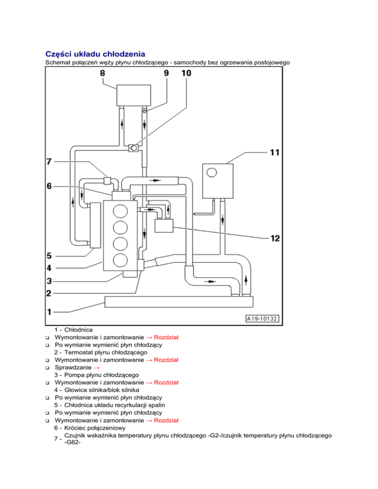 Części układu chłodzenia Schemat połączeń węży płynu chłodzącego - samochody bez ogrzewania postojowego 1 - Chłodnica Wymontowanie i zamontowanie → Rozdział Po wymianie wymienić płyn chłodzący 2 - Termostat płynu chłodzącego Wymontowanie i zamontowanie → Rozdział Sprawdzanie → 3 - Pompa płynu chłodzącego Wymontowanie i zamontowanie → Rozdział 4 - Głowica silnika/blok silnika Po wymianie wymienić płyn chłodzący 5 - Chłodnica układu recyrkulacji spalin Po wymianie wymienić płyn chłodzący Wymontowanie i zamontowanie → Rozdział 6 - Króciec połączeniowy Czujnik wskaźnika temperatury płynu chłodzącego -G2-/czujnik temperatury płynu chłodzącego 7-G62- 8 - Wymiennik ciepła układu ogrzewania Po wymianie wymienić płyn chłodzący 9 - Śruba odpowietrzająca 10 - Zawór zwrotny 11 - Zbiornik wyrównawczy płynu chłodzącego Z korkiem Sprawdzanie zaworu nadciśnieniowego w korku → 12 - Chłodnica oleju Po wymianie wymienić płyn chłodzący Wymontowanie i zamontowanie → Rozdział „Wymontowanie i zamontowanie wspornika filtra oleju z chłodnicą oleju“ Schemat połączeń węży płynu chłodzącego - samochody z ogrzewaniem postojowym 1 - Chłodnica Wymontowanie i zamontowanie → Rozdział Po wymianie wymienić płyn chłodzący 2 - Termostat płynu chłodzącego Wymontowanie i zamontowanie → Rozdział Sprawdzanie → 3 - Pompa płynu chłodzącego Wymontowanie i zamontowanie → Rozdział 4 - Głowica silnika/blok silnika Po wymianie wymienić płyn chłodzący 5 - Chłodnica układu recyrkulacji spalin Po wymianie wymienić płyn chłodzący Wymontowanie i zamontowanie → Rozdział 6 - Króciec połączeniowy Czujnik wskaźnika temperatury płynu chłodzącego -G2-/czujnik temperatury płynu chłodzącego 7-G628 - Wymiennik ciepła układu ogrzewania Po wymianie wymienić płyn chłodzący 9 - Śruba odpowietrzająca 10 - Zbiornik wyrównawczy płynu chłodzącego Z korkiem Sprawdzanie zaworu nadciśnieniowego w korku → 11 - Zawór odcinający płyn chłodzący układu ogrzewania -N27912 - Ogrzewanie postojowe 13 - Chłodnica oleju Po wymianie wymienić płyn chłodzący Wymontowanie i zamontowanie → Rozdział „Wymontowanie i zamontowanie wspornika filtra oleju z chłodnicą oleju“