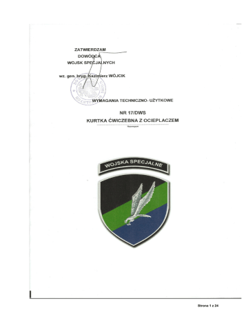 Strona 1 z 24 I. PRZEZNACZENIE: Kurtka przeznaczona jest do ochrony żołnierzy przed złymi warunkami atmosferycznymi. II. WYMAGANIA TECHNICZNE: 1. Kurtka ćwiczebna z ocieplaczem składa się z: a) Kurtki w kamuflażu typu MULTICAM; b) Ocieplacza polarowego; c) Ocieplacza kaptura – czapki 1. Kurtka wykonana z wysokogatunkowej tkaniny ZETA typu RIP-STOP lub równoważnej o parametrach równorzędnych lub wyższych, zapewniająca komfort użytkowania, wykonana z cienkich włókien nylonowych o gęstości liniowej 70DEN, bardzo lekka i wytrzymała, pozwalająca skórze oddychać, wodoodporna oraz posiadająca filtr IR (niewidzialna w świetle zbliżonym do podczerwieni) lub równoważny w kamuflażu typu MULTICAM. 2. Kurtka od spodu (wewnętrznej, bliższej ciału użytkownika) zabezpieczona cienką dzianiną siatkową, wykonaną z przędzy poliestrowej, pozwalającą skórze oddychać. Kolor: OLIWKOWY lub KHAKI 3. Kurtka zapinana z przodu, w centralnej części, na zamek błyskawiczny rozdzielny dwusuwakowy oraz usztywnioną fizeliną listwę z tkaniny zasadniczej zakrywającą w/w zamek i zabezpieczoną pięcioma napami nabitymi w równych odstępach na długości głównego zamka błyskawicznego na zakładce osłaniającej zamek. 4. Kurtka z naszytymi na piersi pod kątem (ułatwiającym dostęp do wnętrza) dwiema (po jednej z każdej ze stron) nakładanymi, dużymi kieszeniami z zakładkami powiększającymi ich objętość. Kieszenie od góry zamykane za pomocą dwuwarstwowej patki. Warstwa zewnętrzna patki ma za zadanie osłaniać warstwę wewnętrzną z oczkiem do zapinania guzika (guzik po zapięciu kieszeni powinien się znaleźć między obiema warstwami patki). Patka od strony otwarcia powinna mieć kształt trójkątny ułatwiający jej otwieranie. Obie warstwy tkaniny patki, w centralnej ich części, powinny być połączone 2 cm szwem ryglowym. Strona 2 z 24 5. Kurtka z dwiema płaskimi wewnętrznymi kieszeniami piersiowymi (po jednaj na każdej stronie) zamykanymi na zamki błyskawiczne. Długość zamka 20-21 cm. Od spodu kieszeń wykonana z dzianiny z zaznaczeniem, iż zamki błyskawiczne kieszeni w celu przenoszonych w niej powinny uniemożliwienia być wszyte przypadkowego powyżej wypadnięcia dna przedmiotów. 6. Z przodu, w dolnej części kurtki, po obu stronach powinny być naszyte dwie (po jednej z każdej strony) duże, nakładane kieszenie z zakładkami powiększającymi ich objętość. Kieszenie od góry powinny być zamykane za pomocą dwuwarstwowej patki. Warstwa zewnętrzna patki ma za zadanie osłaniać warstwę wewnętrzną z oczkiem do zapinania guzika (guzik po zapięciu kieszeni powinien się znaleźć między obiema warstwami patki. Patka od strony otwarcia powinna mieć kształt trójkątny ułatwiający jej otwieranie. Obie warstwy tkaniny patki, w centralnej ich części, powinny być połączone 2 cm szwem ryglowym. 7. Kieszenie dolne kurtki powinny być większe od kieszeni piersiowych nakładanych. 8. W tylnej części kurtki, na dole, po obu stronach (na bokach) w odległości ok. 5-6 cm od szwów bocznych powinny być wszyte zamki błyskawiczne umożliwiające korzystanie z wewnętrznej kieszeni (duża kieszeń, z zamkami po dwóch stronach). Od spodu kieszeń powinna być wykonana z dzianiny z zaznaczeniem, iż zamki błyskawiczne powinny być wszyte powyżej dna kieszeni w celu uniemożliwienia przypadkowego wypadnięcia przenoszonych w niej przedmiotów. 9. Pod pachami kurtki powinny znajdować się otwory wentylacyjne zamykane za pomocą zamków błyskawicznych. 10. Kurtka w pasie powinna mieć zakładkę z wszytą wewnątrz gumką okrągłą o regulowanej stoperami długości. 11. Rękawy kurtki powinny być zakończone mankietami regulowanymi za pomocą patek z taśmami samosczepnymi. 12. Na rękawie, od wszycia mankietu po łokcie powinny być naszyte dodatkowe „łaty” z tkaniny zasadniczej, mające na celu wzmocnienie tych okolic. 13. Na obu rękawach, w górnej ich części, powinny być naszyte nakładane kieszenie trójwarstwowe, z zakładkami powiększającymi ich objętość, zapinane od góry patkami zamykanymi za pomocą dwóch prostokątnych Strona 3 z 24 taśm samosczepnych. Wewnątrz kieszenie powinny posiadać dodatkowe, mniejsze kieszonki na długopisy lub światła chemiczne. Z boku kieszeni powinien być naszyty zamek błyskawiczny umożliwiający dostęp do spodniej (najbliższej ciału użytkownika) warstwy kieszeni. Na kieszeniach i ich patkach powinna być naszyta taśma samosczepna miękka (oczka) do mocowania naszywek rozpoznawczych. 14. Na dole kurtki powinna być wszyta w tunel z tkaniny zasadniczej guma okrągła zaopatrzona w stopery do regulacji. 15. Wszelkie otwory, przez które w kurtce wychodzą gumy ze stoperami powinny być zabezpieczone metalowymi oczkami. 16. Kurtka powinna posiadać wysoką, miękką stójkę. Stójka powinna posiadać możliwość schowania w jej wewnątrz kaptura. Miejsce w stójce na kaptur powinno być zamykane za pomocą taśm samosczepnych. 17. Kurtka powinna posiadać duży kaptur, wielkości regulowanej za pomocą pasa tkaniny zasadniczej z naszytym rzepem ostrym (haczyki) mocowanym do miękkiego pasa rzepa przyszytego do kaptura. Kaptur dodatkowo powinien posiadać usztywnienie z linki polipropylenowej oraz wszyty ściągacz z okrągłej gumy ze stoperami po obu stronach. Kaptur z przodu powinien być zapinany na szeroki pas tkaniny zasadniczej z naszytymi pasami taśmy samosczepnej. Pas ten po zapięciu powinien osłaniać twarz użytkownika do wysokości nosa. 18. Kurtka powinna mieć wszyte (obok zamka głównego) dodatkowe zamki błyskawiczne umożliwiające dopięcie ocieplacza. 19. Podpinka wykonana z materiału zasadniczego dzianina THERMO PILE seria 200 (280g/m2 ±5%) lub równoważnej o parametrach równorzędnych lub wyższych zapewniająca utrzymanie naturalnej temperatury ciała, przy jednocześnie niewielkiej wadze materiału, pozwalająca skórze swobodni