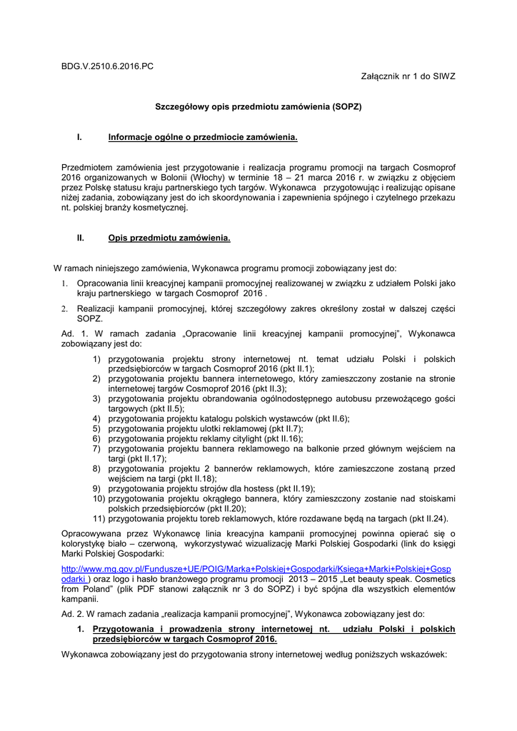 BDG.V.2510.6.2016.PC Załącznik nr 1 do SIWZ Szczegółowy opis przedmiotu zamówienia (SOPZ) I. Informacje ogólne o przedmiocie zamówienia. Przedmiotem zamówienia jest przygotowanie i realizacja programu promocji na targach Cosmoprof 2016 organizowanych w Bolonii (Włochy) w terminie 18 – 21 marca 2016 r. w związku z objęciem przez Polskę statusu kraju partnerskiego tych targów. Wykonawca przygotowując i realizując opisane niżej zadania, zobowiązany jest do ich skoordynowania i zapewnienia spójnego i czytelnego przekazu nt. polskiej branży kosmetycznej. II. Opis przedmiotu zamówienia. W ramach niniejszego zamówienia, Wykonawca programu promocji zobowiązany jest do: 1. Opracowania linii kreacyjnej kampanii promocyjnej realizowanej w związku z udziałem Polski jako kraju partnerskiego w targach Cosmoprof 2016 . 2. Realizacji kampanii promocyjnej, której szczegółowy zakres określony został w dalszej części SOPZ. Ad. 1. W ramach zadania „Opracowanie linii kreacyjnej kampanii promocyjnej”, Wykonawca zobowiązany jest do: 1) przygotowania projektu strony internetowej nt. temat udziału Polski i polskich przedsiębiorców w targach Cosmoprof 2016 (pkt II.1); 2) przygotowania projektu bannera internetowego, który zamieszczony zostanie na stronie internetowej targów Cosmoprof 2016 (pkt II.3); 3) przygotowania projektu obrandowania ogólnodostępnego autobusu przewożącego gości targowych (pkt II.5); 4) przygotowania projektu katalogu polskich wystawców (pkt II.6); 5) przygotowania projektu ulotki reklamowej (pkt II.7); 6) przygotowania projektu reklamy citylight (pkt II.16); 7) przygotowania projektu bannera reklamowego na balkonie przed głównym wejściem na targi (pkt II.17); 8) przygotowania projektu 2 bannerów reklamowych, które zamieszczone zostaną przed wejściem na targi (pkt II.18); 9) przygotowania projektu strojów dla hostess (pkt II.19); 10) przygotowania projektu okrągłego bannera, który zamieszczony zostanie nad stoiskami polskich przedsiębiorców (pkt II.20); 11) przygotowania projektu toreb reklamowych, które rozdawane będą na targach (pkt II.24). Opracowywana przez Wykonawcę linia kreacyjna kampanii promocyjnej powinna opierać się o kolorystykę biało – czerwoną, wykorzystywać wizualizację Marki Polskiej Gospodarki (link do księgi Marki Polskiej Gospodarki: http://www.mg.gov.pl/Fundusze+UE/POIG/Marka+Polskiej+Gospodarki/Ksiega+Marki+Polskiej+Gosp odarki ) oraz logo i hasło branżowego programu promocji 2013 – 2015 „Let beauty speak. Cosmetics from Poland” (plik PDF stanowi załącznik nr 3 do SOPZ) i być spójna dla wszystkich elementów kampanii. Ad. 2. W ramach zadania „realizacja kampanii promocyjnej”, Wykonawca zobowiązany jest do: 1. Przygotowania i prowadzenia strony internetowej nt. przedsiębiorców w targach Cosmoprof 2016. udziału Polski i polskich Wykonawca zobowiązany jest do przygotowania strony internetowej według poniższych wskazówek: 1) Strona internetowa powinna być estetyczna i spójna z linią kreacyjną kampanii. 2) Adres strony powinien być anglojęzyczny i nawiązywać do polskiej branży kosmetycznej. Strona może być osobną stroną lub dedykowaną podstroną, na stronie tematycznie związanej z polską branżą kosmetyczną, jeśli uatrakcyjni to jej zawartość. 3) Strona internetowa powinna informować użytkowników o możliwości elektronicznego umawiania spotkań z polskimi wystawcami oraz możliwości nawiązania bezpośredniego kontaktu z polskimi wystawcami na stronie organizatora targów. 4) Strona internetowa musi funkcjonować w językach: angielskim, włoskim i polskim. 5) Teksty publikowane na stronie muszą być przygotowywane przez profesjonalistów z dziedziny PR lub copywritingu. 6) Strona musi być pozycjonowana w wyszukiwarkach (SEO) pod kątem haseł kluczowych takich jak: polskie kosmetyki, polska branża kosmetyczna, polscy wystawcy Cosmoprof w 3 językach strony (j. polski, j. włoski, j. angielski). 7) Strona musi być wykonana w nowoczesnej technologii, zabezpieczona przed atakami typu SQL-injection i monitorowana pod kątem bezpieczeństwa. 8) Strona powinna zostać uruchomiona 1 marca 2016 r. i funkcjonować do 31 marca 2016 r. 9) Wykonawca zobowiązany jest do promocji strony, w taki sposób aby zapewnić minimum 10 000 odsłon indywidualnych użytkowników. 10) Wykonawca zobowiązany jest do archiwizacji i przekazania Zamawiającemu wszystkich plików i danych opracowanych na potrzeby funkcjonowania strony internetowej. Na stronie internetowej, w szczególności, powinny znaleźć się: • • • • • • • informacje nt. objęcia przez Polskę statusu kraju partnerskiego targów, zaproszenie do odwiedzenia polskiego stoiska informacyjnego znajdującego się na terenie polskiego Pawilonu Narodowego – hala nr 29 oraz stoisk polskich wystawców; lista wszystkich polskich wystawców obecnych na targach Cosmoprof wraz z opisem ich działalności, używanymi logotypami, informacją nt. lokalizacji stoisk - około 100 wystawców; informacje nt. sukcesów i osiągnięć polskiej branży kosmetycznej; kontakt do biura prasowego i koordynatora kampanii; publikowane w prasie komunikaty prasowe; link do profilu kampanii na Facebooku z podglądem postów. 2. Przygotowania i obsługi profilu promującego polską branżę kosmetyczną na portalu społecznościowym Facebook. Wykonawca zobowiązany jest do przygotowania treści na profil promujący udział Polski w targach Cosmoprof 2016 na portalu społecznościowym Facebook. Profil będzie założony i prowadzony przez Wydział Promocji Handlu i Inwestycji w Rzymie. Wykonawca zobowiązany jest do dostarczania treści na profil przez cały okres realizacji umowy oraz pomoc Wydziałowi Promocji Handlu i Inwestycji w Rzymie przy: zamieszczaniu postów, kontrolowaniu i odpowiadaniu na komentarze użytkowników oraz odpowiadaniu na wiadomości prywatne. Wykonawca zobowiązany jest przekazać do zamieszczania 
