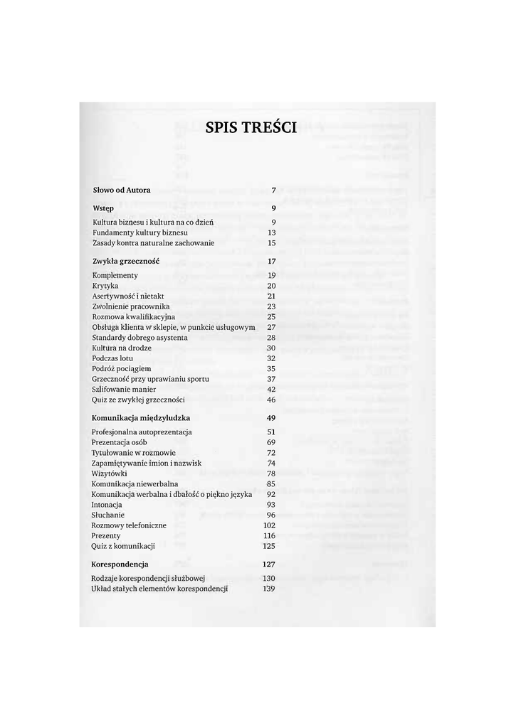 SPIS TREŚCI Słowo od Autora 7 Wstęp 9 Kultura biznesu i kultura na co dzień Fundamenty kultury biznesu Zasady kontra naturalne zachowanie 9 13 15 Zwykła grzeczność 17 Komplementy Krytyka Asertywność i nietakt Zwolnienie pracownika Rozmowa kwalifikacyjna Obsługa klienta w sklepie, w punkcie usługowym Standardy dobrego asystenta Kultura na drodze Podczas lotu Podróż pociągiem Grzeczność przy uprawianiu sportu Szlifowanie manier Quiz ze zwykłej grzeczności 19 20 21 23 25 27 28 30 32 35 37 42 46 Komunikacja międzyludzka 49 Profesjonalna autoprezentacja Prezentacja osób Tytułowanie w rozmowie Zapamiętywanie imion i nazwisk Wizytówki Komunikacja niewerbalna Komunikacja werbalna i dbałość o piękno języka Intonacja Słuchanie Rozmowy telefoniczne Prezenty Quiz z komunikacji 51 69 72 74 78 85 92 93 96 102 116 125 Korespondencja 127 Rodzaje korespondencji służbowej Układ stałych elementów korespondencji 130 139 SPIS TREŚCI Zasady prowadzenia korespondencji służbowej Reklamacje w korespondencji Koperty i papier firmowy Quiz z korespondencji 148 150 152 153 Precedencja 155 Zasady precedencji, czyli pierwszeństwa Precedencja w sytuacjach służbowych Quiz z precedencji 157 158 177 Wizerunek 179 Ubiór służbowy mężczyzny i kobiety Garderoba biznesmena Garderoba bizneswoman Dress code, czyli dostosowanie stroju do okazji Quiz z wizerunku 182 185 216 228 241 Przyjęcia 243 Przyjęcia na stojąco Przyjęcia przy stole Zaproszenie gościa do restauracji Przyjęcia herbatkowe Przyjęcia ogrodowe Quiz z przyjęć 245 268 313 318 320 323 Wystąpienia publiczne i organizacja spotkań 327 Błędy mówcy Radzenie sobie w trudnych sytuacjach Radzenie sobie z tremą Najlepszy mówca Przygotowanie treści wystąpienia Organizacja spotkań Negocjacje Quiz z wystąpień publicznych i organizacji spotkań służbowych 329 331 333 333 334 336 352 361 Jak osiągnąć sukces na arenie międzynarodowej 363 Systematyka różnic kulturowych Konsekwencje wynikające z nieznajomości różnic kulturowych Przyjmowanie zagranicznych gości Polska w kontekście różnic kulturowych Quiz z różnic kulturowych 367 372 375 376 377 Literatura 379