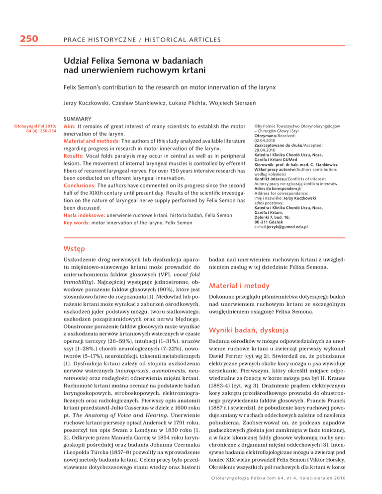 250 PRACE HISTORYCZNE / HISTORICAL ARTICLES 8G]LDï)HOL[D6HPRQDZEDGDQLDFK QDGXQHUZLHQLHPUXFKRZ\PNUWDQL Felix Semon’s contribution to the research on motor innervation of the larynx -HU]\.XF]NRZVNL&]HVïDZ6WDQNLHZLF]XNDV]3OLFKWD:RMFLHFK6LHUV]Hñ 2WRODU\QJRO3RO 6800$5< $LP It remains of great interest of many scientists to establish the motor innervation of the larynx. 0DWHULDODQGPHWKRGV The authors of this study analyzed available literature regarding progress in research in motor innervation of the larynx. 5HVXOWV Vocal folds paralysis may occur in central as well as in peripheral lesions. The movement of internal laryngeal muscles is controlled by efferent ğEHUVRIUHFXUUHQWODU\QJHDOQHUYHV)RURYHU\HDUVLQWHQVLYHUHVHDUFKKDV been conducted on efferent laryngeal innervation. &RQFOXVLRQV The authors have commented on its progress since the second KDOIRIWKH;,;WKFHQWXU\XQWLOSUHVHQWGD\5HVXOWVRIWKHVFLHQWLğFLQYHVWLJDtion on the nature of laryngeal nerve supply performed by Felix Semon has been discussed. +DVïDLQGHNVRZHXQHUZLHQLHUXFKRZHNUWDQLKLVWRULDEDGDñ)HOL[6HPRQ .H\ZRUGV motor innervation of the larynx, Felix Semon ©by Polskie Towarzystwo Otorynolaryngologów ļ&KLUXUJöZ*ïRZ\Lb6]\L 2WU]\PDQR5HFHLYHG =DDNFHSWRZDQRGRGUXNX$FFHSWHG .DWHGUDLb.OLQLND&KRUöE8V]X1RVD *DUGïDLb.UWDQL*80HG .LHURZQLNSURIGUKDEPHG&6WDQNLHZLF] :NïDGSUDF\DXWRUöZ$XWKRUVFRQWULEXWLRQ ZHGïXJNROHMQRĂFL .RQIOLNWLQWHUHVX&RQIOLFWVRILQWHUHVW $XWRU]\SUDF\QLH]JïDV]DMÈNRQIOLNWXLQWHUHVöZ $GUHVGRNRUHVSRQGHQFML/ $GGUHVVIRUFRUUHVSRQGHQFH LPLÚLbQD]ZLVNR-HU]\.XF]NRZVNL DGUHVSRF]WRZ\ .DWHGUDLb.OLQLND&KRUöE8V]X1RVD *DUGïDLb.UWDQL 'ÚELQNLEXG *GDñVN e-mail MHU]\N#JXPHGHGXSO :VWÚS Uszkodzenie dróg nerwowych lub dysfunkcja aparatu mięśniowo-stawowego krtani może prowadzić do unieruchomienia fałdów głosowych (VFI, vocal fold immobility). Najczęściej występuje jednostronne, obwodowe porażenie fałdów głosowych (90%), które jest stosunkowo łatwe do rozpoznania [1]. Niedowład lub porażenie krtani może wynikać z zaburzeń ośrodkowych, uszkodzeń jąder podstawy mózgu, tworu siatkowatego, uszkodzeń pozapiramidowych oraz nerwu błędnego. Obustronne porażenie fałdów głosowych może wynikać z uszkodzenia nerwów krtaniowych wstecznych w czasie operacji tarczycy (26–59%), intubacji (1–31%), urazów szyi (1–28%,) chorób neurologicznych (7–22%), nowotworów (5–17%), neuroinfekcji, toksemii metabolicznych [1]. Dysfunkcja krtani zależy od stopnia uszkodzenia nerwów wstecznych (neuropraxis, axonotmesis, neurotmesis) oraz rozległości odnerwienia mięśni krtani. Ruchomość krtani można oceniać na podstawie badań laryngoskopowych, stroboskopowych, elektromiograficznych oraz radiologicznych. Pierwszy opis anatomii krtani przedstawił Julio Casserius w dziele z 1600 roku pt. The Anatomy of Voice and Hearing. Unerwienie ruchowe krtani pierwszy opisał Andersch w 1791 roku, poszerzył ten opis Swam z Londynu w 1830 roku [1, 2]. Odkrycie przez Manuela Garcię w 1854 roku laryngoskopii pośredniej oraz badania Johanna Czermaka i Leopolda Türcka (1857–8) pozwoliły na wprowadzenie nowej metody badania krtani. Celem pracy było przedstawienie dotychczasowego stanu wiedzy oraz historii badań nad unerwieniem ruchowym krtani z uwzględnieniem zasług w tej dziedzinie Felixa Semona. 0DWHULDïLbPHWRG\ Dokonano przeglądu piśmiennictwa dotyczącego badań nad unerwieniem ruchowym krtani ze szczególnym uwzględnieniem osiągnięć Felixa Semona. :\QLNLEDGDñG\VNXVMD Badania ośrodków w mózgu odpowiedzialnych za unerwienie ruchowe krtani u zwierząt pierwszy wykonał David Ferrier [cyt wg 2]. Stwierdził on, że pobudzanie elektryczne pewnych okolic kory mózgu u psa wywołuje szczekanie. Pierwszym, który określił miejsce odpowiedzialne za fonację w korze mózgu psa był H. Krause (1883-4) [cyt. wg 3]. Drażnienie prądem elektrycznym kory zakrętu przedśrodkowego prowadzi do obustronnego przywiedzenia fałdów głosowych. Francis Franck (1887 r.) stwierdził, że pobudzenie kory ruchowej powoduje zmiany w ruchach oddechowych zależne od nasilenia pobudzenia. Zaobserwował on, że podczas napadów padaczkowych głośnia jest zamknięta w fazie tonicznej, a w fazie klonicznej fałdy głosowe wykonują ruchy synchroniczne z drganiami mięśni oddechowych [3]. Intensywne badania elektrofizjologiczne mózgu u zwierząt pod koniec XIX wieku prowadził Felix Semon i Viktor Horsley. Określenie wszystkich pól ruchowych dla krtani w korze 2 WRODU \QJRORJLD3ROVNDWRP QUOLSLHFVLHUSLHñ PRACE HISTORYCZNE / HISTORICAL ARTICLES Ryc. 1 %6FKHPDWRĂURGNöZSRGNRURZ\FKNUWDQL )LJ% Diagram of laryngeal subcortical centres Ryc. 1A6FKHPDWORNDOL]DFMLRĂURGNöZNRURZ\FKRGG\ FKDQLD$IRQDFML%SRï\NDQLD&XbF]ïRZLHNDI05, 'RGDWNRZDNRUDUXFKRZD60$SU]HGQLDNRUDREUÚF]\ $&&SROHSU]HGUXFKRZH30NRUDUXFKRZDGODSU]HSRQ\ 0NRUDUXFKRZDNUWDQL/[PöĝGĝHN&%/NRUDUXFKR ZDSU]HSRQ\LbPPNODWNLSLHUVLRZHM0&NRUDUXFKRZD ĝXFKZ\MÚ]\NDLbXVW60&SROHVïXFKRZH7&SROH%URFD %$UG]HñSU]HGïXĝRQ\0SROHVPDNRZHLbUXFKRZH MÚ]\ND06Z\VSD,QW\OQDNRUDFLHPLHQLRZD3$ >]PRG\ğNRZDQR]bSUDF\/XGORZ&/&HQWUDOQHUYRXVV\VWHP FRQWURORIWKHODU\QJHDOPXVFOHVLQKXPDQ5HVSLU3K\VLRO 1HXURELRO@ )LJ$ Diagram of breathing (A), voluntary speech (B), swallowing (C) cerebral centres in human (fMRI). Suplementary motor area (SMA), anterior cingulate cortex (ACC), pre-motor area 30GLDSKUDJPPRWRUFRUWH[0ODU\QJHDOPRWRUFRUWH[ (Lx), cerebellum (CBL), diaphragm and thoracic muscles cortex 0&PRWRUFRUWH[RIWKHMDZWRQJXHDQGPRXWK60& auditory cortex (TC), Broca’s area (BA), medulla oblongata 0JXVWDWRU\DQGOLQJXDOFRUWH[06LQVXOD,QSRVWHULRU SDULHWDODUHD3$>PRGLğHGIURP/XGORZ&/Central nervous system control of the laryngeal muscles in human. Respir Physiol 1HXURELRO@ u człowieka okazało się być trudniejsze do ustalenia. W latach 30. XX wieku wykazano, że ośrodki korowe dla mięśni krtani u człowieka są zlokalizowane w dolnej części zakrętu przedśrodkowego płata czołowego (PcG, precentral gyrus). W ostatnich l