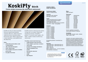 KoskiPly birch Cienka sklejka brzozowa dla wielorakich zastosowań 02102015 KOSKIPLY BIRCH DANE TECHNICZNE Podstawowa sklejka Okleina z fińskiej brzozy Waga Około 700 kg/m3 Łączenie Zewnętrzne jako standard Wewnątrz na życzenie Pakowanie Grubość 0,4 mm 0,6 mm 0,8 mm 1,0 mm 1,5 mm 2,0 mm 2,5 mm 3,0 mm 3,5 mm 4,0 mm 4,5 mm 5,0 mm Cechy Jakość standardowa AB / B okleina brzozowa cięta obrotowo stopnia meblowego; bez spoin. Inne cechy strony wierzchniej na życzenie: cechy GL1 - i GL2 – na życzenie KoskiPly jest silną, ale elastyczną sklejką brzozową z poprzecznymi pasmami wykonaną całkowicie z okleiny brzozowej i pokrytą na stronie wierzchniej okleiną brzozową bez spoin. Okleiny mogą pozostać w stanie naturalnym, zostać palakierowane lub zabejcowane. Zalety • jednorodna powierzchnia o stale wysokiej jakości • silna, doskonała siła gięcia • lekka i dekoracyjna • łatwa obróbka maszynowa i obróbka powierzchni • bez plam i bezwonna KoskiPly może być wykorzystywana zarówno wewnątrz jak i na zewnątrz. Elastyczność materiału jest tak duża, iż KoskiPly o grubości 1,5 mm może zostać wygięta o 180 stopni, co bardzo zwiększa mozliwości jej zastosowania. Przykłady zastosowania końcowego • szafki kuchenne, lustra drzwiowe • ściany działowe, parawany wzrokowe • części mebli • przepierzenia izolujące dźwiekowo • zabawki, pamiątki, karty • modele • iinstrumenty muzyczne • wnętrza • siodła • kije hokejowe Grubości 0,4 mm 3 warstwy 0,6 mm 3 warstwy 0,8 mm 3 warstwy 1,0 mm 3 warstwy 1,5 mm 3 warstwy 2,0 mm 4 warstwy 2,5 mm 5 warstw 3,0 mm 6 warstw 3,5 mm 7 warstw 4,0 mm 8 warstw 4,5 mm 9 warstw 5,0 mm 10 warstw Na żądanie grubości i konstrukcja wg klienta Rozmiary 1200/1220/1270 x 1200/1220/1270 mm 1500/1525/1550 x 1500/1525/1550 mm 1820 x 910 mm 2400 x 1200 mm Maks. rozmiar 0,4 mm – 1,0 mm 3 warstwy Inne rozmiary na życzenie sztuk/paczka 25 sztuk 25 sztuk 50 sztuk 100 sztuk 100 sztuk 100 sztuk 100 sztuk 50 sztuk 50 sztuk 50 sztuk 50 sztuk 50 sztuk 5,5 mm i grubsze na życzenie Jedna paleta zawiera 4-6 paczek Certyfikaty EN ISO 9001, EN ISO 14001, OHSAS 18001, PEFC i FSC Informacje te, choć oparte na dokładnych testach, mają tylko na celu opisanie ogólnych wytycznych i są podawane bez gwarancji. Zastrzegamy sobie prawo do dokonania zmianw specyfikacji technicznej bez wczesniejszego powiadomienia. Jakiekolwiek skazy inne niż te spwodowane przez jasno zweryfikowane wady produkcyjne lub dotyczące obsługi ze strony dostawcy są na odpowiedzialność użytkownika. Jakiekolwiek roszczenia co do form rekompensaty są ograniczone do wartości wybrakowanych produktów. KOSKISEN BIRCH PRODUCT INDUSTRY Otavantie 395, 52550 Hirvensalmi, Finlandia tel. +358 20 553 41, faks +358 15 340 920 www.koskisen.com PEFC/02-34-12