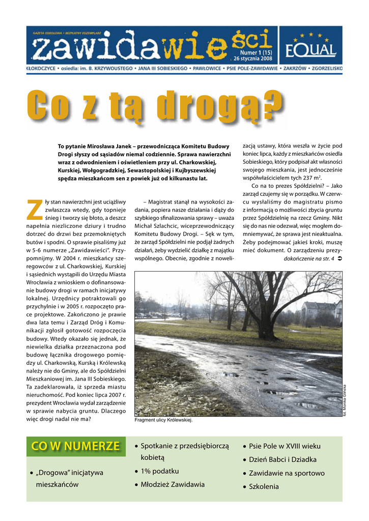 Numer 1 (15) 26 stycznia 2008 Co z tą drogą? To pytanie Mirosława Janek – przewodnicząca Komitetu Budowy Drogi słyszy od sąsiadów niemal codziennie. Sprawa nawierzchni wraz z odwodnieniem i oświetleniem przy ul. Charkowskiej, Kurskiej, Wołgogradzkiej, Sewastopolskiej i Kujbyszewskiej spędza mieszkańcom sen z powiek już od kilkunastu lat. CO W NUMERZE – Magistrat stanął na wysokości zadania, popiera nasze działania i dąży do szybkiego sfinalizowania sprawy – uważa Michał Szlachcic, wiceprzewodniczący Komitetu Budowy Drogi. – Sęk w tym, że zarząd Spółdzielni nie podjął żadnych działań, żeby wydzielić działkę z majątku wspólnego. Obecnie, zgodnie z noweli- fot. Monika Glińska Z ły stan nawierzchni jest uciążliwy zwłaszcza wtedy, gdy topnieje śnieg i tworzy się błoto, a deszcz napełnia niezliczone dziury i trudno dotrzeć do drzwi bez przemokniętych butów i spodni. O sprawie pisaliśmy już w 5-6 numerze „Zawidawieści”. Przypomnijmy. W 2004 r. mieszkańcy szeregowców z ul. Charkowskiej, Kurskiej i sąsiednich wystąpili do Urzędu Miasta Wrocławia z wnioskiem o dofinansowanie budowy drogi w ramach inicjatywy lokalnej. Urzędnicy potraktowali go przychylnie i w 2005 r. rozpoczęto prace projektowe. Zakończono je prawie dwa lata temu i Zarząd Dróg i Komunikacji zgłosił gotowość rozpoczęcia budowy. Wtedy okazało się jednak, że niewielka działka przeznaczona pod budowę łącznika drogowego pomiędzy ul. Charkowską, Kurską i Królewską należy nie do Gminy, ale do Spółdzielni Mieszkaniowej im. Jana III Sobieskiego. Ta zadeklarowała, iż sprzeda miastu nieruchomość. Pod koniec lipca 2007 r. prezydent Wrocławia wydał zarządzenie w sprawie nabycia gruntu. Dlaczego więc drogi nadal nie ma? Fragment ulicy Królewskiej. • Spotkanie z przedsiębiorczą kobietą • „Drogowa” inicjatywa mieszkańców zacją ustawy, która weszła w życie pod koniec lipca, każdy z mieszkańców osiedla Sobieskiego, który podpisał akt własności swojego mieszkania, jest jednocześnie współwłaścicielem tych 237 m2. Co na to prezes Spółdzielni? – Jako zarząd czujemy się w porządku. W czerwcu wysłaliśmy do magistratu pismo z informacją o możliwości zbycia gruntu przez Spółdzielnię na rzecz Gminy. Nikt się do nas nie odezwał, więc mogłem domniemywać, że sprawa jest nieaktualna. Żeby podejmować jakieś kroki, muszę mieć dokument. O zarządzeniu prezydokończenie na str. 4 • Psie Pole w XVIII wieku • Dzień Babci i Dziadka • 1% podatku • Zawidawie na sportowo • Młodzież Zawidawia • Szkolenia Skąd biorą się anioły? PARTNERSTWO DLA ZAWIDAWIA 1. Punkt Informacyjny Partnerstwa dla Zawidawia Kilka lat temu Dorota Bukowa-Czerek była na wakacjach nad morzem. Spacerując brzegiem, schylała się po „skarby” wyrzucone przez fale na piasek. Wśród szkiełek, kamieni i muszelek wypatrzyła kawałek drewienka wygładzony przez wodę. Potem jeszcze jeden i kolejny. Dorzuciła drewienka do „skarbów” i przywiozła do domu. Budynek „Avii”, ul. Bierutowska 2, pokój 105, pn.– pt. w godz. 900–1700 tel.: 071 796 37 87, e-mail: [email protected]; K 2 www.fdps.pl 2. Punkt Aktywności Społecznej Budynek Społecznej Szkoły Podstawowej, ul. Zatorska 11. Godziny otwarcia: w poniedziałki 900–1300; we wtorki 900–1100; w środy 1600–1800; fot. Dorota Szadejko tóregoś dnia rozłożyła wakacyjne pamiątki na stole. – Przymierzyłam jedno drewienko do drugiego i w wyobraźni zobaczyłam anioła ze skrzydłami – wspomina. Zabrała się do pracy – połączyła deseczki, pomalowała i tak powstał pierwszy anioł. Po materiał na kolejne wybrała się do tartaku. – Spacerowałam między odpadami. Robotnicy patrzyli podejrzliwie – proponowali najładniejsze deseczki, ale mi zależało na resztkach z przebarwieniami i sękami – śmieje się artystka. Anioły Dorota tworzy w pracowni w podwrocławskich Wójcicach. Są bardzo różne. Niektóre uduchowione – z przymkniętymi oczami, pochłonięte grą na instrumencie, ubrane w suknie z pejzażem. Niektóre „niegrzeczne”, jak np. punki ze sterczącymi włosami. W sukni mają kieszonkę, a w niej... innego – miniaturowego anioła lub kota. Czasem na głowie drewnianej postaci przysiądzie ptak. Dorota: – Lubię tworzyć anioły w podarunku dla przyjaciół, dopasowywać je do konkretnych osobowości. I tak np. koleżanka, która zajmuje się choreoterapią, dostała roztańczonego ekstatycznie anioła w sukni z falbankami. Inna, która lubi konie ma anioła w kapeluszu i bryczesach. Z zawodu Dorota jest projektantem architektonicznym. Przez dwa lata pracowała jako scenograf we wrocławskiej Wytwórni Filmów Fabularnych, potem całkowicie oddała się rzemiosłu artystycznemu – tworzyła z m.in. ceramiki, metaloplastyki, projektowała świece. Robiła też biżuterię i ilustrowała książeczki dla dzieci. Wystawiała swoje prace na wernisażach we Wrocławiu i Berlinie. Jej dzieła można obejrzeć (albo kupić) we wrocławskich galeriach Manufaktura i Szyfoniera. Spośród wszystkich rzeczy w domu najtrudniej jest zatrzymać właśnie anioła. – Czasem powieszę jakiegoś na ścianie „na stałe”. Patrzę na niego z przy- jemnością - wypełnia sobą całą przestrzeń, ma niesamowitą energię. Najwyraźniej to samo czują znajomi – przyjeżdżają i tak cudownie się zachwycają, że anioł raz dwa znika ze ściany... Najważniejsze jednak, że rodzą się następne. – Pomagają mi w życiu. Może to zasługa tej szczególnej mantry – słowo „anioły” właściwie nie schodzi mi z ust. I czuję się trochę pod ich opieką – mówi Dorota. bs Spotkanie z przedsiębiorczą Dorotą W piątek 1 lutego Dorota Bukowa-Czerek spotka się z zawidawianami w Avii przy ul. Bierutowskiej. Pokaże swoje dzieła i opowie o tym, jak założyć własny biznes. W imieniu organizatora spotkania – Stowarzyszenia „
