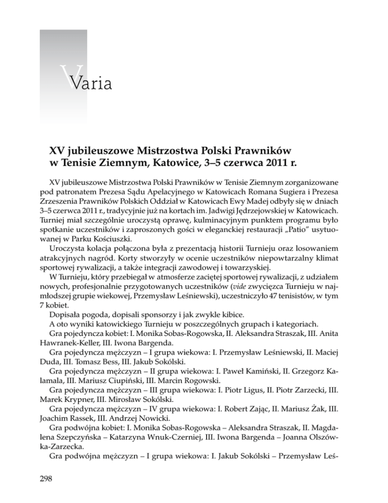 VVaria XV jubileuszowe Mistrzostwa Polski Prawników w Tenisie Ziemnym, Katowice, 3–5 czerwca 2011 r. XV jubileuszowe Mistrzostwa Polski Prawników w Tenisie Ziemnym zorganizowane pod patronatem Prezesa Sądu Apelacyjnego w Katowicach Romana Sugiera i Prezesa Zrzeszenia Prawników Polskich Oddział w Katowicach Ewy Madej odbyły się w dniach 3–5 czerwca 2011 r., tradycyjnie już na kortach im. Jadwigi Jędrzejowskiej w Katowicach. Turniej miał szczególnie uroczystą oprawę, kulminacyjnym punktem programu było spotkanie uczestników i zaproszonych gości w eleganckiej restauracji „Patio” usytuowanej w Parku Kościuszki. Uroczysta kolacja połączona była z prezentacją historii Turnieju oraz losowaniem atrakcyjnych nagród. Korty stworzyły w ocenie uczestników niepowtarzalny klimat sportowej rywalizacji, a także integracji zawodowej i towarzyskiej. W Turnieju, który przebiegał w atmosferze zaciętej sportowej rywalizacji, z udziałem nowych, profesjonalnie przygotowanych uczestników (vide zwycięzca Turnieju w najmłodszej grupie wiekowej, Przemysław Leśniewski), uczestniczyło 47 tenisistów, w tym 7 kobiet. Dopisała pogoda, dopisali sponsorzy i jak zwykle kibice. A oto wyniki katowickiego Turnieju w poszczególnych grupach i kategoriach. Gra pojedyncza kobiet: I. Monika Sobas-Rogowska, II. Aleksandra Straszak, III. Anita Hawranek-Keller, III. Iwona Bargenda. Gra pojedyncza mężczyzn – I grupa wiekowa: I. Przemysław Leśniewski, II. Maciej Duda, III. Tomasz Bess, III. Jakub Sokólski. Gra pojedyncza mężczyzn – II grupa wiekowa: I. Paweł Kamiński, II. Grzegorz Kalamala, III. Mariusz Ciupiński, III. Marcin Rogowski. Gra pojedyncza mężczyzn – III grupa wiekowa: I. Piotr Ligus, II. Piotr Zarzecki, III. Marek Krypner, III. Mirosław Sokólski. Gra pojedyncza mężczyzn – IV grupa wiekowa: I. Robert Zając, II. Mariusz Żak, III. Joachim Rassek, III. Andrzej Nowicki. Gra podwójna kobiet: I. Monika Sobas-Rogowska – Aleksandra Straszak, II. Magdalena Szepczyńska – Katarzyna Wnuk-Czerniej, III. Iwona Bargenda – Joanna Olszówka-Zarzecka. Gra podwójna mężczyzn – I grupa wiekowa: I. Jakub Sokólski – Przemysław Leś- 298 9–10/2011 Varia niewski, II. Maciej Duda – Maciej Gacoń, III. Grzegorz Kalamala – Piotr Zarzecki, III. Krzysztof Długi – Krystian Mularczyk. Gra podwójna mężczyzn – II grupa wiekowa: I. Piotr Ligus – Marek Krypner, II. Dariusz Biel – Robert Zając, III. Mariusz Żak – Ireneusz Ćwiląg, III. Sławomir Leśniewski – Mirosław Sokólski. Gra pocieszenia mężczyzn: I. Bartłomiej Witucki, II. Przemysław Nowakowski. Gra mieszana: I. Aleksandra Straszak – Tomasz Bess, II. Monika Sobas-Rogowska – Marcin Rogowski, III. Katarzyna Wnuk-Czerniej – Maciej Duda, III. Iwona Bargenda – Sławomir Leśniewski. Uczestnicy Turnieju reprezentowali niemal wszystkie zawody prawnicze. Szefowie poszczególnych korporacji ufundowali okolicznościowe puchary dla najlepszych zawodników: sędziego, prokuratora, adwokata i radcy prawnego. Puchar Prezesa Sądu Apelacyjnego w Katowicach dla najlepszego zawodnika-sędziego otrzymała Monika Sobas-Rogowska, Puchar Dziekana Okręgowej Rady Adwokackiej w Katowicach dla najlepszego zawodnika-adwokata – Robert Zając, Puchar Dziekana Izby Radców Prawnych w Katowicach dla najlepszego zawodnika-radcy prawnego – Piotr Ligus, Puchar Prokuratora Apelacyjnego w Katowicach dla najlepszego zawodnika-prokuratora – Krzysztof Zawadzki. Ryszard Kurnik Prezes NRA adw. Joanna Agacka-Indecka patronką placu przed łódzkimi sądami Łódzki plac u zbiegu ulic Uniwersyteckiej i Narutowicza, nieopodal Sądu Apelacyjnego i Okręgowego, zyskał nową patronkę – adw. Joannę Agacką-Indecką. Na wniosek łódzkiej adwokatury prezydent miasta Hanna Zdanowska wystąpiła do Rady Miasta z inicjatywą upamiętnienia prezes NRA poprzez nadanie jednemu z łódzkich placów jej imienia. 27 kwietnia br. radni przyjęli wniosek jednogłośnie. Uroczystość nadania placowi imienia zmarłej w wyniku ubiegłorocznej katastrofy lotniczej pod Smoleńskiem prezes NRA odbyła się 18 września. Tablicę z nową nazwą placu odsłoniły matka i córka Pani Mecenas – adw. Elżbieta Agacka-Gajdowska i Katarzyna Indecka. W spotkaniu udział wzięli rodzina i przyjaciele tragicznie zmarłej, licznie przybyli przedstawiciele zawodów prawniczych, w tym Michał Kłos, prezes Sądu Apelacyjnego w Łodzi i Sławomir Wlazło, prezes 299 Varia PALESTRA tamtejszego Sądu Okręgowego. Nie zabrakło przedstawicieli władz samorządowych, rządowych i kościelnych: Joanny Chełmińskiej – wojewody łódzkiego, Hanny Zdanowskiej – prezydent Łodzi, Tomasza Kacprzyka – przewodniczącego Rady Miejskiej w Łodzi, Krzysztofa Kwiatkowskiego – ministra sprawiedliwości, Cezarego Grabarczyka – ministra infrastruktury, ks. Zbigniewa Tracza – wicekanclerza archidiecezji łódzkiej. Na uroczystość przybyły także Bożena Mikke, Małgorzata Wypych oraz Jolanta Przewoźnik, wdowy po ofiarach katastrofy smoleńskiej. Adwokaturę licznie reprezentowali dziekani okręgowych rad adwokackich, członkowie Naczelnej Rady Adwokackiej oraz łódzcy adwokaci. Obowiązki gospodarzy spotkania wzięli na siebie adw. Andrzej Zwara, prezes NRA oraz adw. Zbigniew Wodo, dziekan ORA w Łodzi. Hanna Zdanowska, prezydent Łodzi, podkreśliła, że plac przy Sądzie Okręgowym i Apelacyjnym to najlepsze miejsce, jakie można było wybrać, by oddać hołd Joannie Agackiej-Indeckiej. Miejsce to symbolizuje bowiem przemiany polskiego wymiaru sprawiedliwości, na rzecz których pracowała patronka placu. Krzysztof Kwiatkowski, szef resortu sprawiedliwości, wspominał doskonałą współpracę ze zmarłą prezes NRA. Podkreślił, że zawsze mógł liczyć na jej pomoc. Przypomniał również, że Joanna Agacka-Indecka była adwokatem, który pracował w komisji kodyfikacyjnej prawa karnego. Znalazła się ona w gronie naukowców, którz