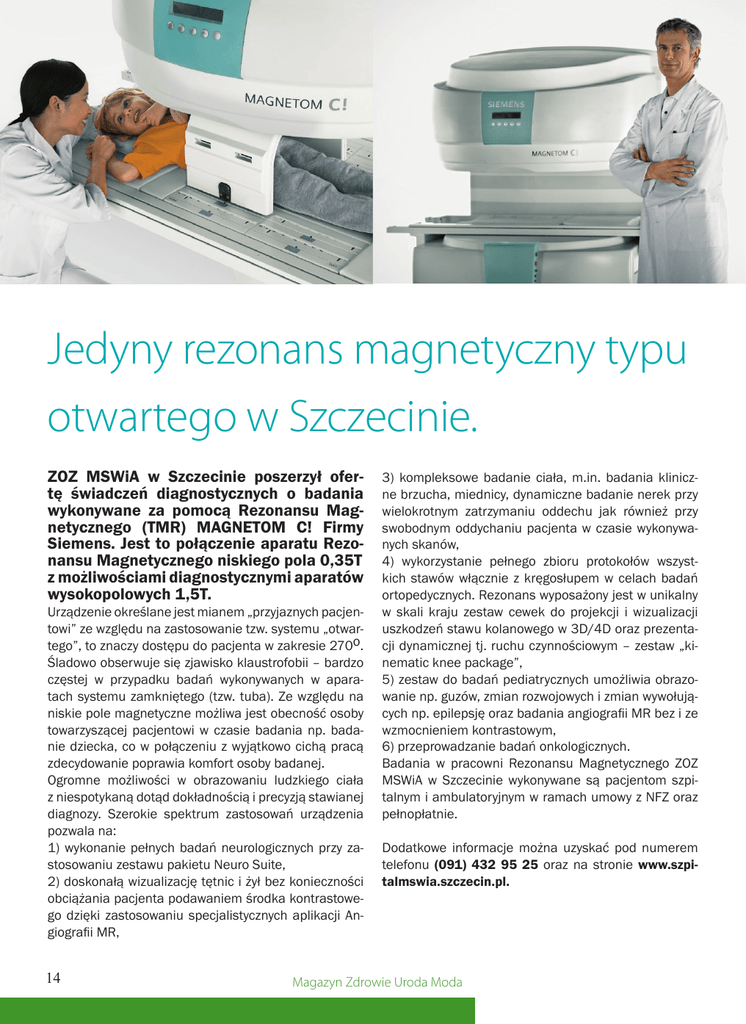 Jedyny rezonans magnetyczny typu otwartego w Szczecinie. ZOZ MSWiA w Szczecinie poszerzył ofertę świadczeń diagnostycznych o badania wykonywane za pomocą Rezonansu Magnetycznego (TMR) MAGNETOM C! Firmy Siemens. Jest to połączenie aparatu Rezonansu Magnetycznego niskiego pola 0,35T z możliwościami diagnostycznymi aparatów wysokopolowych 1,5T. Urządzenie określane jest mianem „przyjaznych pacjentowi” ze względu na zastosowanie tzw. systemu „otwartego”, to znaczy dostępu do pacjenta w zakresie 270o. Śladowo obserwuje się zjawisko klaustrofobii – bardzo częstej w przypadku badań wykonywanych w aparatach systemu zamkniętego (tzw. tuba). Ze względu na niskie pole magnetyczne możliwa jest obecność osoby towarzyszącej pacjentowi w czasie badania np. badanie dziecka, co w połączeniu z wyjątkowo cichą pracą zdecydowanie poprawia komfort osoby badanej. Ogromne możliwości w obrazowaniu ludzkiego ciała z niespotykaną dotąd dokładnością i precyzją stawianej diagnozy. Szerokie spektrum zastosowań urządzenia pozwala na: 1) wykonanie pełnych badań neurologicznych przy zastosowaniu zestawu pakietu Neuro Suite, 2) doskonałą wizualizację tętnic i żył bez konieczności obciążania pacjenta podawaniem środka kontrastowego dzięki zastosowaniu specjalistycznych aplikacji Angiografii MR, 14 3) kompleksowe badanie ciała, m.in. badania kliniczne brzucha, miednicy, dynamiczne badanie nerek przy wielokrotnym zatrzymaniu oddechu jak również przy swobodnym oddychaniu pacjenta w czasie wykonywanych skanów, 4) wykorzystanie pełnego zbioru protokołów wszystkich stawów włącznie z kręgosłupem w celach badań ortopedycznych. Rezonans wyposażony jest w unikalny w skali kraju zestaw cewek do projekcji i wizualizacji uszkodzeń stawu kolanowego w 3D/4D oraz prezentacji dynamicznej tj. ruchu czynnościowym – zestaw „kinematic knee package”, 5) zestaw do badań pediatrycznych umożliwia obrazowanie np. guzów, zmian rozwojowych i zmian wywołujących np. epilepsję oraz badania angiografii MR bez i ze wzmocnieniem kontrastowym, 6) przeprowadzanie badań onkologicznych. Badania w pracowni Rezonansu Magnetycznego ZOZ MSWiA w Szczecinie wykonywane są pacjentom szpitalnym i ambulatoryjnym w ramach umowy z NFZ oraz pełnopłatnie. Dodatkowe informacje można uzyskać pod numerem telefonu (091) 432 95 25 oraz na stronie www.szpitalmswia.szczecin.pl. Magazyn Zdrowie Uroda Moda