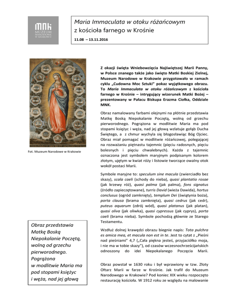 Maria Immaculata w otoku różańcowym z kościoła farnego w Krośnie 11.08 – 13.11.2016 Z okazji święta Wniebowzięcia Najświętszej Marii Panny, w Polsce znanego także jako święto Matki Boskiej Zielnej, Muzeum Narodowe w Krakowie przygotowało w ramach cyklu „Cudowna Moc Sztuki” pokaz wyjątkowego obrazu. To Maria Immaculata w otoku różańcowym z kościoła farnego w Krośnie – intrygujący wizerunek Matki Bożej – prezentowany w Pałacu Biskupa Erazma Ciołka, Oddziale MNK. Fot. Muzeum Narodowe w Krakowie Obraz przedstawia Matkę Boską Niepokalanie Poczętą, wolną od grzechu pierworodnego. Pogrążona w modlitwie Maria ma pod stopami księżyc i węża, nad jej głową wzlatuje gołąb Ducha Świętego Obraz namalowany farbami olejnymi na płótnie przedstawia Matkę Boską Niepokalanie Poczętą, wolną od grzechu pierworodnego. Pogrążona w modlitwie Maria ma pod stopami księżyc i węża, nad jej głową wzlatuje gołąb Ducha Świętego, a z chmur wychyla się błogosławiąc Bóg Ojciec. Obraz miał pomagać w modlitwie różańcowej, polegającej na rozważaniu piętnastu tajemnic (pięciu radosnych, pięciu bolesnych i pięciu chwalebnych). Każda z tajemnic oznaczona jest symbolem maryjnym podpisanym kolorem złotym, ujętym w kwiat róży i listowie tworzące owalny otok wokół postaci Marii. Symbole maryjne to: speculum sine macula (zwierciadło bez skazy), scala caeli (schody do nieba), quasi plantatio rosae (jak krzewy róż), quasi palma (jak palma), fons signatus (źródło zapieczętowane), turris David (wieża Dawida), hortus conclusus (ogród zamknięty), templum Dei (świątynia boża), porta clausa (brama zamknięta), quasi cedrus (jak cedr), puteus aquarum (zdrój wód), quasi platanus (jak platan), quasi oliva (jak oliwka), quasi cypressus (jak cyprys), porta caeli (brama nieba). Symbole pochodzą głównie ze Starego Testamentu. Wzdłuż dolnej krawędzi obrazu biegnie napis: Tota pulchra es amica mea, et macula non est in te. Jest to cytat z „Pieśni nad pieśniami” 4,7 („Cała piękna jesteś, przyjaciółko moja, i nie ma w tobie skazy”), od czasów wczesnochrześcijańskich odnoszony do idei Niepokalanego Poczęcia Marii. Obraz powstał w 1630 roku i był wprawiony w tzw. Złoty Ołtarz Marii w farze w Krośnie. Jak trafił do Muzeum Narodowego w Krakowie? Pod koniec XIX wieku rozpoczęto restaurację kościoła. W 1912 roku ze względu na malowanie 1 Maria Immaculata w otoku różańcowym z kościoła farnego w Krośnie 11.08 – 13.11.2016 prezbiterium usunięto z kościoła większość wyposażenia, w tym Złoty Ołtarz Marii, który uległ zniszczeniu. „Ks. Koleński kazał zerwać dawną posadzkę, a dał nową płytkową, robotnicy wtedy siekierami poczęli rozbierać wiekowe ołtarzyki tak, że misterne rzeźby uległy zniszczeniu, próchniejące części odpadły” – pisał dwa lata później, w liście do Dyrektora Muzeum Narodowego w Krakowie Feliksa Kopery Władysław Antoniewicz – nauczyciel i badacz historii Krosna. To dzięki jego interwencji do Krosna przyjechał dyrektor Kopera, by obejrzeć wycofane z kultu skarby. W liście do księdza proboszcza Antoniego Koleńskiego zaproponował przekazanie Muzeum „niektórych starych zabytków” ze skarbca, zapewniając, że będą eksponowane jako zabytki fary krośnieńskiej i że muzeum pokryje wszelkie koszty ich konserwacji. Wybuch I wojny światowej wstrzymał negocjacje w tej sprawie, lecz w liście z 21 września 1915 roku proboszcz, mając na względzie krytyczną sytuację kościoła podczas działań wojennych, sam proponuje oddanie zabytków muzeum. W nocy z 3 na 4 października Maria Immaculata w otoku różańcowym (wraz z innymi dziełami i przedmiotami) zostaje pociągiem przewieziona do Krakowa. Zabytki z fary krośnieńskiej zakupiło Muzeum Narodowe w Krakowie za kwotę 1500 koron i wiele z nich jest eksponowanych w Pałacu Biskupa Erazma Ciołka. Oprac. KB 2 Maria Immaculata w otoku różańcowym z kościoła farnego w Krośnie 11.08 – 13.11.2016 Informacje dla zwiedzających: Wystawa Maria Immaculata w otoku różańcowym z kościoła farnego w Krośnie Pałac Biskupa Erazma Ciołka Ul. Kanonicza 17 MNK Media: KATARZYNA BIK (695 981 817) [email protected] MARTA BOSAK (606 207 728) [email protected] 11.08 – 13.11.2016 Pliki do pobrania: Pon.: nieczynne Wt. – sob.: 10.00–18.00 Niedz.: 10.00–16.00 SERWER ftp.mnk.pl UŻYTKOWNIK: media HASŁO: fCZRRtme6w Bilet normalny – 9 zł Bilet ulgowy – 5 zł Bilet rodzinny (maks. 5 osób) – 19 zł Bilet grupowy normalny (min. 15 osób) – 7 zł Bilet grupowy ulgowy (min. 15 osób) – 4 zł Dzieci do 7 lat – wstęp bezpłatny Dzieci i młodzież do 16 lat – 1 zł Uczniowie i studenci do 26 lat – 1 zł Niedziela – wstęp wolny Organizatorzy: Muzeum Narodowe w Krakowie, Stowarzyszenie Instytut Dziedzictwa Projekt realizowany przy wsparciu finansowym Województwa Małopolskiego Dofinansowano w ramach programu Narodowego Centrum Kultury – Chrzest 966 Mecenas Muzeum Narodowego w Krakowie: PZU 3