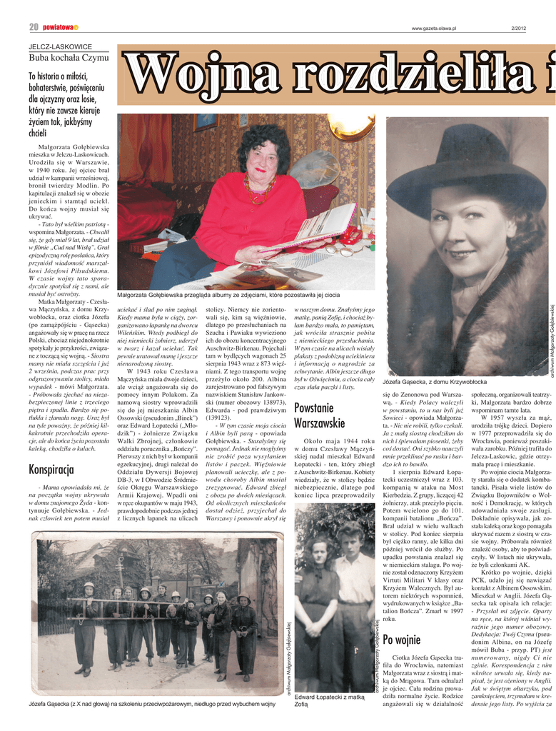 20 To historia o miłości, bohaterstwie, poświęceniu dla ojczyzny oraz losie, który nie zawsze kieruje życiem tak, jakbyśmy chcieli Małgorzata Gołębiewska mieszka w Jelczu-Laskowicach. Urodziła się w Warszawie, w 1940 roku. Jej ojciec brał udział w kampanii wrześniowej, bronił twierdzy Modlin. Po kapitulacji znalazł się w obozie jenieckim i stamtąd uciekł. Do końca wojny musiał się ukrywać. - Tato był wielkim patriotą wspomina Małgorzata. - Chwalił się, że gdy miał 9 lat, brał udział w filmie „Cud nad Wisłą”. Grał epizodyczną rolę posłańca, który przyniósł wiadomość marszałkowi Józefowi Piłsudskiemu. W czasie wojny tato sporadycznie spotykał się z nami, ale musiał być ostrożny. Matka Małgorzaty - Czesława Mączyńska, z domu Krzywobłocka, oraz ciotka Józefa (po zamążpójściu - Gąsecka) angażowały się w pracę na rzecz Polski, chociaż niejednokrotnie spotykały je przykrości, związane z toczącą się wojną. - Siostra mamy nie miała szczęścia i już 2 września, podczas prac przy odgruzowywaniu stolicy, miała wypadek - mówi Małgorzata. - Próbowała zjechać na niezabezpieczonej linie z trzeciego piętra i spadła. Bardzo się potłukła i złamała nogę. Uraz był na tyle poważny, że później kilkakrotnie przechodziła operacje, ale do końca życia pozostała kaleką, chodziła o kulach. Konspiracja Wojna rozdzieliła i Małgorzata Gołębiewska przegląda albumy ze zdjęciami, które pozostawiła jej ciocia uciekać i ślad po nim zaginął. Kiedy mama była w ciąży, zorganizowano łapankę na dworcu Wileńskim. Wtedy podbiegł do niej niemiecki żołnierz, uderzył w twarz i kazał uciekać. Tak pewnie uratował mamę i jeszcze nienarodzoną siostrę. W 1943 roku Czesława Mączyńska miała dwoje dzieci, ale wciąż angażowała się do pomocy innym Polakom. Za namową siostry wprowadzili się do jej mieszkania Albin Ossowski (pseudonim „Binek”) oraz Edward Łopatecki („Młodzik”) - żołnierze Związku Walki Zbrojnej, członkowie oddziału porucznika „Bończy”. Pierwszy z nich był w kompanii egzekucyjnej, drugi należał do Oddziału Dywersji Bojowej DB-3, w I Obwodzie Śródmieście Okręgu Warszawskiego Armii Krajowej. Wpadli oni w ręce okupantów w maju 1943, prawdopodobnie podczas jednej z licznych łapanek na ulicach stolicy. Niemcy nie zorientowali się, kim są więźniowie, dlatego po przesłuchaniach na Szucha i Pawiaku wywieziono ich do obozu koncentracyjnego Auschwitz-Birkenau. Pojechali tam w bydlęcych wagonach 25 sierpnia 1943 wraz z 873 więźniami. Z tego transportu wojnę przeżyło około 200. Albina zarejestrowano pod fałszywym nazwiskiem Stanisław Jankowski (numer obozowy 138973), Edwarda - pod prawdziwym (139123). - W tym czasie moja ciocia i Albin byli parą - opowiada Gołębiewska. - Starałyśmy się pomagać. Jednak nie mogłyśmy nic zrobić poza wysyłaniem listów i paczek. Więźniowie planowali ucieczkę, ale z powodu choroby Albin musiał zrezygnować. Edward zbiegł z obozu po dwóch miesiącach. Od okolicznych mieszkańców dostał odzież, przyjechał do Warszawy i ponownie ukrył się archiwum Małgorzaty Gołębiewskiej - Mama opowiadała mi, że na początku wojny ukrywała w domu znajomego Żyda - kontynuuje Gołębiewska. - Jednak człowiek ten potem musiał 2/2012 Józefa Gąsecka (z X nad głową) na szkoleniu przeciwpożarowym, niedługo przed wybuchem wojny w naszym domu. Znałyśmy jego matkę, panią Zofię, i chociaż byłam bardzo mała, to pamiętam, jak wróciła strasznie pobita z niemieckiego przesłuchania. W tym czasie na ulicach wisiały plakaty z podobizną uciekiniera i informacją o nagrodzie za schwytanie. Albin jeszcze długo był w Oświęcimiu, a ciocia cały czas słała paczki i listy. Powstanie Warszawskie Około maja 1944 roku w domu Czesławy Mączyńskiej nadal mieszkał Edward Łopatecki - ten, który zbiegł z Auschwitz-Birkenau. Kobiety wiedziały, że w stolicy będzie niebezpiecznie, dlatego pod koniec lipca przeprowadziły Edward Łopatecki z matką Zofią archiwum Małgorzaty Gołębiewskiej Buba kochała Czymu archiwum Małgorzaty Gołębiewskiej JELCZ-LASKOWICE www.gazeta.olawa.pl Józefa Gąsecka, z domu Krzywobłocka się do Zenonowa pod Warszawą. - Kiedy Polacy walczyli w powstaniu, to u nas byli już Sowieci - opowiada Małgorzata. - Nic nie robili, tylko czekali. Ja z małą siostrą chodziłam do nich i śpiewałam piosenki, żeby coś dostać. Oni szybko nauczyli mnie przeklinać po rusku i bardzo ich to bawiło. 1 sierpnia Edward Łopatecki uczestniczył wraz z 103. kompanią w ataku na Most Kierbedzia. Z grupy, liczącej 42 żołnierzy, atak przeżyło pięciu. Potem wcielono go do 101. kompanii batalionu „Bończa”. Brał udział w wielu walkach w stolicy. Pod koniec sierpnia był ciężko ranny, ale kilka dni później wrócił do służby. Po upadku powstania znalazł się w niemieckim stalagu. Po wojnie został odznaczony Krzyżem Virtuti Militari V klasy oraz Krzyżem Walecznych. Był autorem niektórych wspomnień, wydrukowanych w książce „Batalion Bończa”. Zmarł w 1997 roku. Po wojnie Ciotka Józefa Gąsecka trafiła do Wrocławia, natomiast Małgorzata wraz z siostrą i matką do Mrągowa. Tam odnalazł je ojciec. Cała rodzina prowadziła normalne życie. Rodzice angażowali się w działalność społeczną, organizowali teatrzyki, Małgorzata bardzo dobrze wspominam tamte lata. W 1957 wyszła za mąż, urodziła trójkę dzieci. Dopiero w 1977 przeprowadziła się do Wrocławia, ponieważ poszukiwała zarobku. Później trafiła do Jelcza-Laskowic, gdzie otrzymała pracę i mieszkanie. Po wojnie ciocia Małgorzaty starała się o dodatek kombatancki. Pisała wiele listów do Związku Bojowników o Wolność i Demokrację, w których udowadniała swoje zasługi. Dokładnie opisywała, jak została kaleką oraz kogo pomagała ukrywać razem z siostrą w czasie wojny. Próbowała r