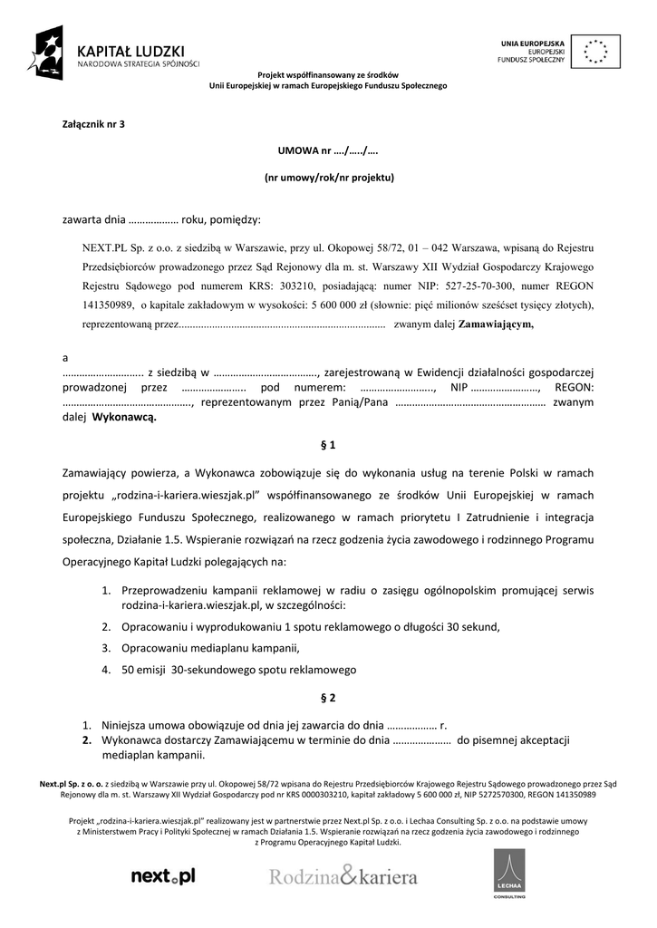 Projekt współfinansowany ze środków Unii Europejskiej w ramach Europejskiego Funduszu Społecznego Załącznik nr 3 UMOWA nr …./…../…. (nr umowy/rok/nr projektu) zawarta dnia ……………… roku, pomiędzy: NEXT.PL Sp. z o.o. z siedzibą w Warszawie, przy ul. Okopowej 58/72, 01 – 042 Warszawa, wpisaną do Rejestru Przedsiębiorców prowadzonego przez Sąd Rejonowy dla m. st. Warszawy XII Wydział Gospodarczy Krajowego Rejestru Sądowego pod numerem KRS: 303210, posiadającą: numer NIP: 527-25-70-300, numer REGON 141350989, o kapitale zakładowym w wysokości: 5 600 000 zł (słownie: pięć milionów sześćset tysięcy złotych), reprezentowaną przez........................................................................... zwanym dalej Zamawiającym, a ……………………….. z siedzibą w ………………………………., zarejestrowaną w Ewidencji działalności gospodarczej prowadzonej przez ………………….. pod numerem: …………………….., NIP ……………………, REGON: ………………………………………., reprezentowanym przez Panią/Pana ……………………………………………… zwanym dalej Wykonawcą. §1 Zamawiający powierza, a Wykonawca zobowiązuje się do wykonania usług na terenie Polski w ramach projektu „rodzina-i-kariera.wieszjak.pl” współfinansowanego ze środków Unii Europejskiej w ramach Europejskiego Funduszu Społecznego, realizowanego w ramach priorytetu I Zatrudnienie i integracja społeczna, Działanie 1.5. Wspieranie rozwiązań na rzecz godzenia życia zawodowego i rodzinnego Programu Operacyjnego Kapitał Ludzki polegających na: 1. Przeprowadzeniu kampanii reklamowej w radiu o zasięgu ogólnopolskim promującej serwis rodzina-i-kariera.wieszjak.pl, w szczególności: 2. Opracowaniu i wyprodukowaniu 1 spotu reklamowego o długości 30 sekund, 3. Opracowaniu mediaplanu kampanii, 4. 50 emisji 30-sekundowego spotu reklamowego §2 1. Niniejsza umowa obowiązuje od dnia jej zawarcia do dnia ……………… r. 2. Wykonawca dostarczy Zamawiającemu w terminie do dnia ………………… do pisemnej akceptacji mediaplan kampanii. Next.pl Sp. z o. o. z siedzibą w Warszawie przy ul. Okopowej 58/72 wpisana do Rejestru Przedsiębiorców Krajowego Rejestru Sądowego prowadzonego przez Sąd Rejonowy dla m. st. Warszawy XII Wydział Gospodarczy pod nr KRS 0000303210, kapitał zakładowy 5 600 000 zł, NIP 5272570300, REGON 141350989 Projekt „rodzina-i-kariera.wieszjak.pl” realizowany jest w partnerstwie przez Next.pl Sp. z o.o. i Lechaa Consulting Sp. z o.o. na podstawie umowy z Ministerstwem Pracy i Polityki Społecznej w ramach Działania 1.5. Wspieranie rozwiązań na rzecz godzenia życia zawodowego i rodzinnego z Programu Operacyjnego Kapitał Ludzki. Projekt współfinansowany ze środków Unii Europejskiej w ramach Europejskiego Funduszu Społecznego §3 1. Zamawiający zastrzega sobie na każdym etapie realizacji umowy prawo do kontroli poprawności wykonania zamówienia. 2. W celu umożliwienia kontroli, o której mowa w ust. 1 Wykonawca udostępni Zamawiającemu wgląd we wszystkie dokumenty związane z realizacją zamówienia, w tym dokumenty finansowe i elektroniczne. 3. Prawo kontroli prawidłowości wykonania zamówienia, o którym mowa w ust. 1 oraz prawo wglądu we wszystkie dokumenty, związane z realizacją usługi przysługuje także wszystkim podmiotom upoważnionym do kontroli projektu „rodzina-i-kariera.wieszjak.pl”. 4. Kontrola może zostać przeprowadzona w siedzibie Wykonawcy. 5. Wykonawca zobowiązuje się do przedstawiania na pisemne wezwanie Zamawiającego i innych uprawnionych podmiotów wszelkich informacji i wyjaśnień związanych z realizacją Projektu, w terminie określonym w wezwaniu. 6. Wykonawca zobowiązuje się do przechowywania kompletnej dokumentacji do 31.12.2020 związanej z realizacją zamówienia w sposób zapewniający dostępność, poufność i bezpieczeństwo oraz do informowania Zamawiającego o miejscu archiwizacji dokumentów związanych z realizowanym zamówieniem. 7. W przypadku zmiany miejsca archiwizacji dokumentów oraz w przypadku zawieszenia lub zaprzestania przez wykonawcę działalności przed terminem, o którym mowa w ust. 6, wykonawca zobowiązuje się pisemnie poinformować zamawiającego o miejscu archiwizacji dokumentów związanych z realizowanym zamówieniem. 8. W przypadku konieczności przedłużenia terminu, o którym mowa w ust. ..., zamawiający powiadomi o tym pisemnie wykonawcę przed upływem terminu określonego w ust. ...... 9. W całym okresie, o którym mowa w ust. 6 zamawiającemu i innym uprawnionym podmiotom przysługuje prawo do kontroli, o której mowa w ust. 1, 2, 3, 4 oraz prawo do żądania wyjaśnień i dostępu do dokumentacji, o którym mowa w ust. 6. §4 1. Za prawidłowo wykonanie usługi w całym okresie jej świadczenia, Zmawiający zapłaci Wykonawcy na podstawie prawidłowo wystawionych faktur z 14 dniowym terminem płatności kwotę: a) Za wyprodukowanie spotu reklamowego o długości 30 sekund kwotę ……… zł. brutto ( słownie …………….....................................zł. brutto ), b) Za 50 emisji spotu reklamowego, zgodnie z zatwierdzonym mediaplanem, kwotę ……… zł. brutto ( słownie …………….....................................zł. brutto ). Wynagrodzenie będzie płacone przelewem na rachunek bankowy wskazany przez Wykonawcę. Next.pl Sp. z o. o. z siedzibą w Warszawie przy ul. Okopowej 58/72 wpisana do Rejestru Przedsiębiorców Krajowego Rejestru Sądowego prowadzonego przez Sąd Rejonowy dla m. st. Warszawy XII Wydział Gospodarczy pod nr KRS 0000303210, kapitał zakładowy 5 600 000 zł, NIP 5272570300, REGON 141350989 Projekt „rodzina-i-kariera.wieszjak.pl” realizowany jest w partnerstwie przez Next.pl Sp. z o.o. i Lechaa Consulting Sp. z o.o. na podstawie umowy z Ministerstwem Pracy i Polityki Społecznej w ramach Działania 1.5. Wsp