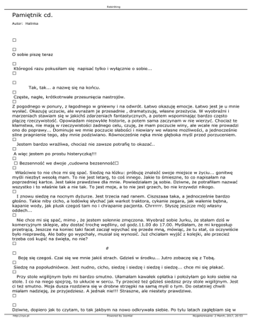 Rebirthing Pamiętnik cd. Autor: Halinka O sobie piszę teraz Któregoś razu pokusiłam się napisać tylko i wyłącznie o sobie... Tak, tak... a nazwę się na końcu. Częste, nagłe, krótkotrwałe przesunięcia nastrojów. Z pogodnego w ponury, z łagodnego w gniewny i na odwrót. Łatwo okazuję emocje. Łatwo jest je u mnie wysłać. Okazuję uczucie, ale wyrażam je przesadnie , dramatyzuję, własne przeżycia. W wyobraźni i marzeniach stawiam się w jakichś zdarzeniach fantastycznych, a potem wspominając bardzo często plączę rzeczywistość. Opowiadam niezwykłe historie, a potem sama zaczynam w nie wierzyć. Chociaż te kłamstwa, nie mają w rzeczywistości żadnego celu, czuję, że mam poczucie winy, ale wcale nie prowadzi ono do poprawy... Dominuje we mnie poczucie słabości i niewiary we własne możliwości, a jednocześnie silne pragnienie tego, aby mnie podziwiano. Równocześnie nęka mnie głęboka myśl przed porzuceniem. Jestem bardzo wrażliwa, chociaż nie zawsze potrafię to okazać.. A więc jestem po prostu histeryczką!!! Bezsenność we dwoje ,cudowna bezsenność Właściwie to nie chce mi się spać. Siedzę na łóżku: próbuję znaleźć swoje miejsce w życiu... gonitwę myśli niezbyt wesołą mam. To nie jest letarg, to coś innego. Jakie to śmieszne, to co napisałam na poprzedniej kartce. Jest takie prawdziwe dla mnie. Powiedziałam ją sobie. Dziwne, że potrafiłam nazwać wszystko i to właśnie tak a nie tak. To jest moje, a to nie jest grzech, bo nie krzywdzi nikogo. I znowu siedzę na nocnym dyżurze. Jest trzecia nad ranem. Ciszszaaa taka, a jednocześnie bardzo głośno. Takie niby cicho, a lodówkę słychać jak warkot traktora, cykanie zegara, jak walenie bębna, kapanie wody, jak plusk czegoś tam no i chrapanie pacjenta. Chrrrrrr. Słyszę jeszcze mój własny oddech... Nie chce mi się spać, mimo , że jestem solennie zmęczona. Wyobraź sobie Jurku, że stałam dziś w komercyjnym sklepie, aby dostać trochę wędliny, od godz.11.00 do 17.00. Myślałam, że mi kręgosłup przetrącą. Jeszcze na koniec taki facet zaczął wpychać się przede mną, mówiąc, że tu stał, co oczywiście było nieprawdą. Ale baby go wypchały, musiał się wynosić. Już chciałam wyjść z kolejki, ale przecież trzeba coś kupić na święta, no nie? # Boję się czegoś. Czai się we mnie jakiś strach. Gdzieś w środku... Jutro zobaczę się z Tobą. Siedzę na popołudniówce. Jest nudno, cicho, siedzę i siedzę i siedzę i siedzę... chce mi się płakać. Przy stole wigilijnym było mi bardzo smutno. Ułamałam kawałek opłatka i położyłam go koło siebie na stole. I co na niego spojrzę, to ukłucie w sercu. Ty przecież też gdzieś siedzisz przy stole wigilijnym. Jest ci też smutno. Moja dusza rozdziera się w drobne strzępki na samą myśl o tym. Do ostatniej chwili miałam nadzieję, że przyjedziesz. A jednak nie!!! Straszne, ale niestety prawdziwe. Dziwne, dopiero jak to czytam, to tak jakbym na nowo odkrywała siebie. Po tylu latach zagłębiam się w http://cyo.pl Powered by Joomla! Wygenerowano: 2 March, 2017, 20:53 Rebirthing tę moją pisaninę i zastanawiam, ile z tamtej Halinki zostało obecnie we mnie... Bardzo podoba mi się ten fragment: Tak, tak brak mi konsekwencji w moim postępowaniu, chociaż ona jest gdzieś koło mnie... Robię nadzieję i rezygnuję. Tak to dziwnie ze mną jest. Najpierw coś strzelę, a potem te konsekwencje tego strzału mnie dobijają. One kiedyś mnie dobiją i to tak, że nie będę spodziewać się nawet z której strony. Tak jest cały czas. Nie mogę się tego pozbyć, to jest to moje drugie ja (niedobre). Jestem niekonsekwentna i to na każdym kroku. A już jak wyrwę się z tą konsekwencją, to akurat jest ona nie na miejscu. Może dlatego wokół mnie rodzi się tyle konfliktów. Nawet Ty wyczułeś tę moją smutną słabość, bo ona jest dla mnie bardzo przykra... Cały czas w myślach odsuwam ją od siebie, żeby tylko dziś o niej nie myśleć. Co ja zrobię? Całe wnętrze moje ściska mi żałość, oczy mnie szczypią. Nie myślałam o niej, bo się jej wstydziłam, nawet w myśli. TA KONSEKWENCJA! Postępowania. Ja ją niewątpliwie posiadam tylko nie na miejscu. Jest ona jak to słowo, które z chwilą, gdy zostanie wypowiedziane przez usta, już się nie cofnie. Np. teraz żałuję, że nie pojechałam z tobą... Więc jak to jest w końcu ze mną: I chcę i jednocześnie nie chcę. Jem i nie jem, sram i nie sram, płaczę i nie płaczę... Tylko gdzieś tak głęboko we mnie w środku coś się czai. Jak o tym pomyślę , to aż mnie zatyka. http://cyo.pl Powered by Joomla! Wygenerowano: 2 March, 2017, 20:53