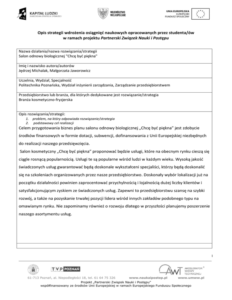Opis strategii wdrożenia osiągnięć naukowych opracowanych przez studenta/ów w ramach projektu Partnerski Związek Nauki i Postępu Nazwa działania/nazwa rozwiązania/strategii Salon odnowy biologicznej "Chcę byd piękna" Imię i nazwisko autora/autorów Jędrzej Michalak, Małgorzata Jaworowicz Uczelnia, Wydział, Specjalnośd Politechnika Poznaoska, Wydział inżynierii zarządzania, Zarządzanie przedsiębiorstwem Przedsiębiorstwo lub branża, dla których dedykowane jest rozwiązanie/strategia Branża kosmetyczno-fryzjerska Opis rozwiązania/strategii: 1. problem, na który odpowiada rozwiązanie/strategia 2. podstawowy cel realizacji Celem przygotowania biznes planu salonu odnowy biologicznej „Chcę byd piękna” jest zdobycie środków finansowych w formie dotacji, subwencji, dofinansowania z Unii Europejskiej niezbędnych do realizacji naszego przedsięwzięcia. Salon kosmetyczny „Chcę byd piękna” proponowad będzie usługi, które na obecnym rynku cieszą się ciągle rosnącą popularnością. Usługi te są popularne wśród ludzi w każdym wieku. Wysoką jakośd świadczonych usług gwarantowad będą doskonale wykształceni specjaliści, którzy będą doskonalid się na szkoleniach organizowanych przez nasze przedsiębiorstwo. Doskonały wybór lokalizacji już na początku działalności powinien zaprocentowad przychylnością i lojalnością dużej liczby klientów i satysfakcjonującym zyskiem ze świadczonych usług. Zapewni to przedsiębiorstwu szansę na szybki rozwój, a także na pozyskanie trwałej pozycji lidera wśród innych zakładów podobnego typu na omawianym rynku. Nie zapominamy również o rozwoju dlatego w przyszłości planujemy poszerzenie naszego asortymentu usług. 1 61-713 Poznań, al. Niepodległości 18, tel. 61 64 75 326 www.naukaipostep.pl www.umww.pl Projekt „Partnerski Związek Nauki i Postępu” współfinansowany ze środków Unii Europejskiej w ramach Europejskiego Funduszu Społecznego "wyrażam zgodę na przetwarzanie danych osobowych zgodnie z ustawą z dnia 29 sierpnia 1997 r. o ochronie danych osobowych z późn. zmianami przez Samorząd Województwa Wielkopolskiego i Politechnikę Poznaoską w celu umieszczenia opisów osiągnięd naukowych na stronie www.naukaipostep.pl." Elementy innowacyjne rozwiązania/strategii (jeśli istnieją) Naszym głównym założeniem jest oferowanie szerszej gamy usług niż konkurencja, w ten sposób chcemy przyciągnąd do siebie liczbę klientów większą niż u konkurentów a tym samym uzyskad przewagę nad potencjalnymi rywalami. Planujemy również zatrudniad pracowników którzy swoimi umiejętnościami i profesjonalizmem przewyższad będą kadrę konkurencyjnych firm. Spodziewane korzyści dla przedsiębiorstwa wdrażającego rozwiązanie/strategię Strategia sprzedaży W pierwszym okresie działalności prowadzid będziemy sprzedaż usług na poziomie minimalnym: koszty + 5 % zysku. W dalszym okresie, po uzyskaniu odpowiedniej pozycji na rynku i obniżaniu stopniowym kosztów stałych zamierzamy utrzymywad świadczenie usług na poziomie 10% zysku. Docelowo zamierzamy doprowadzid zysk ze sprzedaży do poziomu 30 % (netto). Dla stałych odbiorców zamierzamy wprowadzid specjalne preferencje cenowe, które będą polegały na obniżaniu cen w zależności od systematyczności korzystania z naszych usług. Ponadto zamierzamy wprowadzid promocje sezonowe (np. w okresie Świąt Bożego Narodzenia. Wielkiej nocy czy Dnia Kobiet). Strategia Promocji W pierwszym okresie przeznaczymy znaczną kwotę zasobów finansowych przedsiębiorstwa na reklamę poprzez dostarczanie ulotek reklamowych na terenie całej okolicy. Materiały te zostaną rozniesione do poszczególnych gospodarstw domowych. Będą charakteryzowad się one wysokim poziomem poligraficznym i merytorycznym. Dodatkowo przez pierwszy tydzieo działania przedsiębiorstwa przewidziane będą 20% zniżki dla wszystkich klientów, którzy skorzystają z naszych usług w tym okresie. Zamierzamy przeznaczad na promocję i reklamę 10 % zysku ze sprzedaży naszych usług. "wyrażam zgodę na przetwarzanie danych osobowych zgodnie z ustawą z dnia 29 sierpnia 1997 r. o ochronie danych osobowych z późn. zmianami przez Samorząd Województwa Wielkopolskiego i Politechnikę Poznaoską w celu umieszczenia opisów osiągnięd naukowych na stronie www.naukaipostep.pl." 2 61-713 Poznań, al. Niepodległości 18, tel. 61 64 75 326 www.naukaipostep.pl www.umww.pl Projekt „Partnerski Związek Nauki i Postępu” współfinansowany ze środków Unii Europejskiej w ramach Europejskiego Funduszu Społecznego