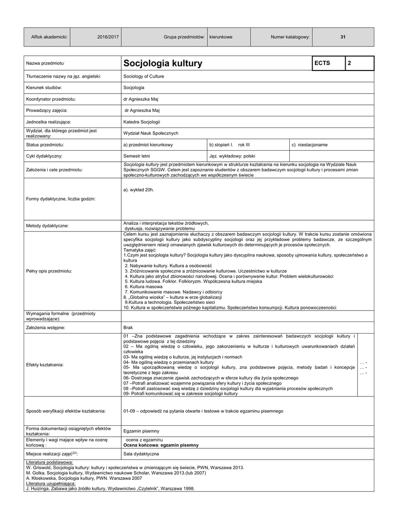 ARok akademicki: Grupa przedmiotów: 2016/2017 kierunkowe 31 Numer katalogowy: Nazwa przedmiotu: Socjologia kultury Tłumaczenie nazwy na jęz. angielski: Sociology of Culture Kierunek studiów: Socjologia Koordynator przedmiotu: dr Agnieszka Maj Prowadzący zajęcia: dr Agnieszka Maj Jednostka realizująca: Katedra Socjologii Wydział, dla którego przedmiot jest realizowany: Wydział Nauk Społecznych Status przedmiotu: a) przedmiot kierunkowy b) stopień I. Cykl dydaktyczny: Semestr letni Jęz. wykładowy: polski Założenia i cele przedmiotu: Socjologia kultury jest przedmiotem kierunkowym w strukturze kształcenia na kierunku socjologia na Wydziale Nauk Społecznych SGGW. Celem jest zapoznanie studentów z obszarem badawczym socjologii kultury i procesami zmian społeczno-kulturowych zachodzących we współczesnym świecie ECTS rok III 2 c) niestacjonarne a). wykład 20h. Formy dydaktyczne, liczba godzin: Metody dydaktyczne: Pełny opis przedmiotu: Analiza i interpretacja tekstów źródłowych, dyskusja, rozwiązywanie problemu Celem kursu jest zaznajomienie słuchaczy z obszarem badawczym socjologii kultury. W trakcie kursu zostanie omówiona specyfika socjologii kultury jako subdyscypliny socjologii oraz jej przykładowe problemy badawcze, ze szczególnym uwzględnieniem relacji omawianych zjawisk kulturowych do determinujących je procesów społecznych. Tematyka zajęć: 1.Czym jest socjologia kultury? Socjologia kultury jako dyscyplina naukowa, sposoby ujmowania kultury, społeczeństwo a kultura 2. Nabywanie kultury. Kultura a osobowość 3. Zróżnicowanie społeczne a zróżnicowanie kulturowe. Uczestnictwo w kulturze 4. Kultura jako atrybut zbiorowości narodowej. Ocena i porównywanie kultur. Problem wielokulturowości 5. Kultura ludowa. Folklor. Folkloryzm. Współczesna kultura miejska 6. Kultura masowa 7. Komunikowanie masowe. Nadawcy i odbiorcy 8. „Globalna wioska” – kultura w erze globalizacji 9.Kultura a technologia. Społeczeństwo sieci 10. Kultura w społeczeństwie późnego kapitalizmu. Społeczeństwo konsumpcji. Kultura ponowoczesności Wymagania formalne (przedmioty wprowadzające): Założenia wstępne: Brak Efekty kształcenia: 01 –Zna podstawowe zagadnienia wchodzące w zakres zainteresowań badawczych socjologii kultury i podstawowe pojęcia z tej dziedziny 02 – Ma ogólną wiedzę o człowieku, jego zakorzenieniu w kulturze i kulturowych uwarunkowaniach działań człowieka 03- Ma ogólną wiedzę o kulturze, jej instytucjach i normach 04- Ma ogólną wiedzę o przemianach kultury 05- Ma uporządkowaną wiedzę o socjologii kultury, zna podstawowe pojęcia, metody badań i koncepcje teoretyczne z tego zakresu 06- Dostrzega znaczenie zjawisk zachodzących w sferze kultury dla życia społecznego 07 –Potrafi analizować wzajemne powiązania sfery kultury i życia społecznego 08 –Potrafi zastosować swą wiedzę z dziedziny socjologii kultury dla wyjaśniania procesów społecznych 09- Potrafi komunikować się w zakresie socjologii kultury Sposób weryfikacji efektów kształcenia: 01-09 – odpowiedź na pytania otwarte i testowe w trakcie egzaminu pisemnego Forma dokumentacji osiągniętych efektów kształcenia: Elementy i wagi mające wpływ na ocenę końcową : Miejsce realizacji zajęć22): Egzamin pisemny ocena z egzaminu Ocena końcowa: egzamin pisemny Sala dydaktyczna Literatura podstawowa: W. Griswold, Socjologia kultury: kultury i społeczeństwa w zmieniającym się świecie, PWN, Warszawa 2013. M. Golka, Socjologia kultury, Wydawnictwo naukowe Scholar, Warszawa 2013.(lub 2007) A. Kłoskowska, Socjologia kultury, PWN. Warszawa 2007 Literatura uzupełniająca: J. Huizinga, Zabawa jako źródło kultury, Wydawnictwo „Czytelnik”, Warszawa 1998. ………- R. Linton, Kulturowe podstawy osobowości, PWN, Warszawa 2000. Z. Freud, Kultura jako źródło cierpień, KR, Warszawa 1995. Raport o stanie i zróżnicowaniach kultury miejskiej w Polsce, Ministerstwo Kultury i Dziedzictwa Narodowego, Warszawa 2009. W. Griswold, Socjologia kultury, PWN, Warszawa 2013. I. Bukraba-Rylska, Socjologia wsi polskiej, PWN, Warszawa 2008. Hasło: „kultura ludowa”, w: Z. Staszczak, Słownik etnologiczny. Terminy ogólne, PWN, Warszawa-Poznań 1987. M. Budyta-Budzyńska, Socjologia narodu i konfliktów etnicznych, PWN, Warszawa 2010. Cz. Miłosz (red.), Kultura masowa, Wydawnictwo Literackie, Kraków 2002. A. Kłoskowska, Kultura masowa: krytyka i obrona, PWN, Warszawa 2005. M. McLuhan, Wybór tekstów, Wydawnictwo Zysk i S-ka, Poznań 2001. Hasło: Komunikowanie masowe, w: Encyklopedia Socjologii, Oficyna Naukowa, Warszawa 1999. A. W. Ziętek (red.), Międzynarodowe stosunki kulturalne, Wydawnictwo Poltext 2010. A. Appadurai, Nowoczesność bez granic. Kulturowe wymiary globalizacji, Wydawnictwo Universitas, Kraków 2005. D. Bell, Kulturowe sprzeczności kapitalizmu, PWN, Warszawa 1998. J. Baudrillard, Społeczeństwo konsumpcyjne, jego mity i struktury, Wydawnictwo Sic! 2006. M. Castells, Galaktyka Internetu, Dom Wydawniczy Rebis 2003. A. Maj. Polskie wzory cielesności. Przemiany stosunku do ciała w kulturze ponowoczesnej, Wydawnictwo SGGW, Warszawa 2013. UWAGI24): Syllabusy szczegółowe studenci otrzymują drogą elektroniczną Wskaźniki ilościowe charakteryzujące moduł/przedmiot25) : Szacunkowa sumaryczna liczba godzin pracy studenta (kontaktowych i pracy własnej) niezbędna dla osiągnięcia zakładanych efektów kształcenia18) - na tej podstawie należy wypełnić pole ECTS2: 50 h Łączna liczba punktów ECTS, którą student uzyskuje na zajęciach wymagających bezpośredniego udziału nauczycieli akademickich: 0,8 ECTS Łączna liczba punktów ECTS, którą student uzyskuje w ramach zajęć o charakterze praktycznym, takich jak zajęcia laboratoryjne, projektowe, itp.: ECTS Tabela zgodności kierunkowych efektów kształcenia efektami przedmiotu Nr /symbol efektu 01 26) Wymienione w wierszu efekty kształcenia: Odniesienie do e