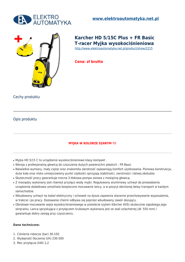 www.elektroautomatyka.net.pl Karcher HD 5/15C Plus + FR Basic T-racer Myjka wysokociśnieniowa http://www.elektroautomatyka.net.pl/product/show/2215 Cena: zł brutto Cechy produktu Opis produktu MYJKA W KOLORZE SZARYM !!! ● ● ● ● ● ● ● Myjka HD 5/15 C to urządzenie wysokociśnieniowe klasy kompakt . Wersja z profesjonalną głowicą do czszczenia dużych powierzchni płaskich - FR Basic Niewielkie wymiary, mały ciężar oraz znakomita zwrotność zapewniają komfort użytkowania. Pionowa konstrukcja, duże koła oraz nisko umiejscowiony punkt ciężkości sprzyjają stabilności, zwrotności i łatwej obsłudze. Skuteczność pracy gwarantuje mocna 3-tłokowa pompa osiowa z mosiężną głowicą. Z mosiądzu wykonany jest również przyłącz wody myjki. Regulowany aluminiowy uchwyt do prowadzenia urządzenia dodatkowo umożliwia bezpieczne mocowanie lancy, a w pozycji obniżonej łatwy transport w każdym samochodzie. Wbudowany uchwyt na kabel elektryczny i schowek na dysze zapewnia staranne przechowywanie wyposażenia, w trakcie i po pracy. Dozowanie chemii odbywa się poprzez wbudowany zawór dozujący. Obrotowe mocowanie węża wysokociśnieniowego w pistolecie (sytem Kärcher AVS) skutecznie zapobiega jego skręcaniu. Lanca spryskująca z przyłączem śrubowym wykonana jest ze stali szlachetnej (dł. 550 mm) i gwarantuje dobry zasięg przy czyszczeniu. Dane techniczne: 1. Ciśnienie robocze (bar) 30-150 2. Wydajność tłoczenia (l/h) 230-500 3. Moc przyłącza (kW) 2,2 4. 5. 6. 7. 8. Max temp. doprow.wody (º C) 60 Napięcie (V/Hz) 1~230/50 Ciężar (kg) 25 Wymiary (dł x szer x wys - mm) 375 x 360 x 935 nr kat. 1.514-508.0 Wyposażenie: ● ● ● ● ● ● 10 m wąż wysokociśnieniowy, 450 mm przedłużony pistolet, 550 mm lanca, dysza trójstopniowa (0/25/40), dysza rotacyjna, głowica do czyszczenia powierzchni płaskich FR Basic ELEKTRO-AUTOMATYKA Sprzedaż elektronarzędzi, urządzeń spawalniczych, maszyn budowlanych, pneumatyki, narzędzi warsztatowych, firmowych ubrań roboczych oraz maszyn ogrodowo leśnych. Sklep Bochnia ul. Brzeska 50 32-700 Bochnia Sklep Brzesko ul. Szarych Szeregów 23 32-800 Brzesko Serwis, Magazyn ul. Św. Brata Alberta 4 32-800 Brzesko tel. 691 572 333 e-mail: [email protected] tel. 609 523 230 e-mail: [email protected] tel. 609 523 645 e-mail: [email protected]