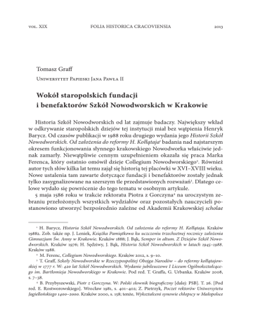 vol. XIX FOLIA HISTORICA CRACOVIENSIA 2013 Tomasz Graff Uniwersytet Papieski Jana Pawła II Wokół staropolskich fundacji i benefaktorów Szkół Nowodworskich w Krakowie Historia Szkół Nowodworskich od lat zajmuje badaczy. Największy wkład w odkrywanie staropolskich dziejów tej instytucji miał bez wątpienia Henryk Barycz. Od czasów publikacji w 1988 roku drugiego wydania jego Historii Szkół Nowodworskich. Od założenia do reformy H. Kołłątaja1 badania nad najstarszym okresem funkcjonowania słynnego krakowskiego Nowodworka właściwie jednak zamarły. Niewątpliwie cennym uzupełnieniem okazała się praca Marka Ferenca, który ostatnio omówił dzieje Collegium Nowodworskiego2. Również autor tych słów kilka lat temu zajął się historią tej placówki w XVI–XVIII wieku. Nowe ustalenia tam zawarte dotyczące fundacji i benefaktorów zostały jednak tylko zasygnalizowane na szerszym tle przedstawionych rozważań3. Dlatego celowe wydało się powrócenie do tego tematu w osobnym artykule. 5 maja 1586 roku w trakcie rektoratu Piotra z Gorczyna4 na uroczystym zebraniu przełożonych wszystkich wydziałów oraz pozostałych nauczycieli postanowiono utworzyć bezpośrednio zależne od Akademii Krakowskiej scholae H. Barycz, Historia Szkół Nowodworskich. Od założenia do reformy H. Kołłątaja. Kraków 19882. Zob. także np. J. Leniek, Książka Pamiątkowa ku uczczeniu trzechsetnej rocznicy założenia Gimnazjum Św. Anny w Krakowie. Kraków 1888; J. Bąk, Semper in altum. Z Dziejów Szkół Nowodworskich. Kraków 1976; H. Sędziwy, J. Bąk, Historia Szkół Nowodworskich w latach 1945–1988. Kraków 1988. 2 M. Ferenc, Collegium Nowodworskiego. Kraków 2012, s. 9–10. 3 T. Graff, Szkoły Nowodworskie w Rzeczypospolitej Obojga Narodów – do reformy kołłątajowskiej w 1777 r. W: 420 lat Szkół Nowodworskich. Wydanie jubileuszowe I Liceum Ogólnokształcącego im. Bartłomieja Nowodworskiego w Krakowie. Pod red. T. Graffa, G. Urbanka. Kraków 2008, s. 7–38. 4 B. Przybyszewski, Piotr z Gorczyna. W: Polski słownik biograficzny [dalej: PSB]. T. 26. [Pod red. E. Rostworowskiego]. Wrocław 1981, s. 401–402; Z. Pietrzyk, Poczet rektorów Uniwersytetu Jagiellońskiego 1400–2000. Kraków 2000, s. 158; tenże, Wykształceni synowie chłopscy w Małopolsce 1 160 Tomasz Graff privatae5. Znając treść tego aktu, możemy pokusić się o ustalenie motywacji zebranych. Profesorowie pragnęli, aby studenci słuchali wykładów według stopnia własnego zaawansowania i dojrzałości, co pozwoliłoby uniknąć wielu nieporozumień, często zdarzających się dotychczas w tej materii. Inną motywacją było zmierzenie się z lenistwem, rozprzężeniem, lekceważeniem obowiązków i marnotrawieniem przez studentów pieniędzy swoich rodziców czy dobrodziejów. Wobec powyższego postanowiono zreformować dotychczasowy system edukacji poprzez powołanie prywatnych szkół. „Postulowano mianowicie, aby uczeń przechodzący do wyższego poziomu nauczania, nie mógł już bez respektowania jakichkolwiek zasad i bez osądu jakiejś znamienitszej osobistości, dotyczącego jego postępów w nauce, wybierać dla siebie profesora, którego tylko by sobie życzył. Zamiast tego powinien zostać przydzielony przez egzaminatora, po odbytym egzaminie, z uwzględnieniem poczynionych przez niego postępów w nauce, do szkoły i do nauczyciela dlań najbardziej odpowiedniego. Ustalono również, że nauczyciele, którzy uczą w szkołach prywatnych, nie będą musieli przyjmować do swoich szkół każdego ucznia – bez możliwości dokonania wyboru – ale jedynie tych, którzy zostali uznani przez przełożonego szkoły za uczniów na to zasługujących”6. W dotychczasowej literaturze zwrócono uwagę, że przyczyn powstania nowych szkół mogło być kilka: zagrożenie szkolnictwem jezuickim, rozwój szkół różnowierczych, chęć dostosowania się do nowych trendów płynących z Zachodu, czy troska o poziom nauczania w murach wszechnicy krakowskiej7. W świetle przytoczonego dokumentu, tylko ten ostatni element został mocno zaakcentowany. Profesorowie nie napisali o zagrożeniu jezuickim czy różnowierczym. Nie powoływali się także na wzory zachodnie, ale bardzo konkretnie wskazali wady ówczesnego systemu i równie konkretnie postanowili temu zaradzić, przez powołanie szkół prywatnych, wraz z określeniem ścisłych zasad indywidualnego toku nauczania. Ponieważ uchwała ta nie została zrealizowana w trybie natychmiastowym, powrócono do niej w kwietniu 1588 roku8 dzięki inicjatywie w epoce późnego Odrodzenia. Kraków 1993, s. 165–169; H. Barycz, Historia Szkół Nowodworskich…, s. 54. 5 M. Ferenc, Collegium Nowodworskiego…, s. 9 błędnie podaje datę 5 maja 1585 roku. 6 Archiwum UJ, rkps 33, s. 363–364. Tekst polski uchwał z 1586 i 1588 roku podaję na podstawie T. Graff, Szkoły Nowodworskie…, s. 31–33 z niewielkimi korektami. Tekst łaciński zob. J. Leniek, Książka Pamiątkowa…, s. 1–3. 7 H. Barycz, Historia Szkół Nowodworskich…, s. 24–25. 8 Archiwum UJ, rkps 33, s. 378. Wokół staropolskich fundacji i benefaktorów Szkół Nowodworskich… 161 rektora Marcina Glicjusza z Pilzna9. Już w czerwcu, w trakcie rektoratu jego następcy Stanisława Pika Zawadzkiego10 na wniosek doktorów i nauczycieli współpracujących z uczelnią na walnym zgromadzeniu wszystkich wydziałów profesorowie podjęli nową uchwałę. Tutaj jako powód wymieniono dbałość o zdolności uczniów, które winny być stymulowane przez odpowiednie ćwiczenia. Poza tym zatroszczono się o jakość pracy samych profesorów. Wykładowcy uniwersyteccy nie powinni bowiem zaniedbywać swoich obowiązków poprzez praktykowane dotychczas prywatne dokształcanie krakowskich żaków. Poza tym postanowiono, „aby wszystko, co podjęto i o czym zadecydowano do tej pory w kwestii powołania szkół, zostało sfinalizowane, a dzięki temu, by po zniesieniu kar cielesnych i