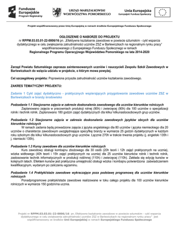 Projekt współfinansowany przez Unię Europejską w ramach środków Europejskiego Funduszu Społecznego OGŁOSZENIE O NABORZE DO PROJEKTU nr RPPM.03.03.01-22-0006/16 pn. „Efektywne kształcenie zawodowe w powiecie sztumskim - cykl wsparcia dydaktycznego w celu zwiększenia zatrudnialności uczniów ZSZ w Barlewiczkach na regionalnym rynku pracy” współfinansowanego z Europejskiego Funduszu Społecznego w ramach Regionalnego Programu Operacyjnego Województwa Pomorskiego na lata 2014-2020 Zarząd Powiatu Sztumskiego zaprasza zainteresowanych uczniów i nauczycieli Zespołu Szkół Zawodowych w Barlewiczkach do wzięcia udziału w projekcie, o którym mowa powyżej. Cel szczegółowy projektu: Poprawiona przyszła zatrudnialność uczniów kształcenia zawodowego. ZAKRES TEMATYCZNY PROJEKTU: Zadanie 1 Cykl zajęć dydaktyczno - praktycznych wspierających przygotowanie zawodowe uczniów ZSZ w Barlewiczkach w branży środowisko Podzadanie 1.1 Stacjonarne zajęcia w zakresie doskonalenia zawodowego dla uczniów kierunków rolniczych Zaplanowano zajęcia w pracowniach produkcji rolnej (90h) i zwierzęcej (90h) dla 100 uczniów o specjalizacji rolnik i technik rolnik. Zaplanowano 180 godzin zajęć dydaktycznych dla kilku/ kilkunastoosobowych grup uczniów. Podzadanie 1.2 Stacjonarne zajęcia w zakresie doskonalenia zawodowych języków obcych dla uczniów kierunków rolniczych W ramach zadania będą prowadzone zajęcia z języka angielskiego dla 80 uczniów i języka niemieckiego dla 20 uczniów o charakterze zawodowym uwzględniające specyfikę branży w wymiarze 25 godzin dydaktycznych w każdym roku szkolnym dla kilku/ kilkunastoosobowych grup uczniów. Łącznie 270h w trakcie trwania projektu (j. angielski 135h i j. niemiecki 135h). Podzadanie 1.3 Kursy zawodowe dla uczniów kierunków rolniczych Kurs zawodowy obsługi kombajnu zbożowego dla 30 osób (20h teorii i 12h zajęć praktycznych na ucznia), wózka widłowego (40h teorii i 15h zajęć praktycznych na ucznia) dla 25 uczniów kierunków rolnik i technik rolnik, zastosowanie technik informatycznych w produkcji roślinnej (110h) i zwierzęcej (110h). Zakłada się edycję kursów w kolejnych latach. Efektem kursów jest praktyczna umiejętność obsługi wózka i kombajnu potwierdzona zaświadczeniem kwalifikacyjnym, wydanym po zaliczeniu egzaminu. Podzadanie 1.4 Praktyki/staże zawodowe wykraczające poza podstawę programową dla uczniów kierunków rolniczych Ponadprogramowe praktyki/staże zawodowe realizowane w toku całego projektu dla 100 uczniów kierunków rolniczych w wymiarze 150 godzin/na ucznia. Projekt nr RPPM.03.03.01-22-0006/16 pn. Efektywne kształcenie zawodowe w powiecie sztumskim - cykl wsparcia dydaktycznego w celu zwiększenia zatrudnialności uczniów ZSZ w Barlewiczkach na regionalnym rynku pracy” jest współfinansowany ze środków Unii Europejskiej w ramach Europejskiego Funduszu Społecznego Zadanie 2 Cykl zajęć dydaktyczno - praktycznych wspierających przygotowanie zawodowe uczniów ZSZ w Barlewiczkach w branży ICT i elektronika Podzadanie 2.1 Stacjonarne zajęcia w zakresie doskonalenia zawodowego dla uczniów kierunku technik informatyk Zaplanowano zajęcia dla 30 uczniów o specjalności technik informatyk, które obejmą następujące bloki dydaktyczne: prototypowanie układów elektronicznych i programowanie sterowników PLC (80h), optymalizacja i bezpieczeństwo transferu danych z uwzględnieniem mediów przewodowych i bezprzewodowych (80h), realizacja HMI za pomocą interfejsów stron internetowych i interfejsów tekstowych (70h), programowanie robotów (20h szkoleniowych), Projektowanie i budowa robotów (110h), montaż podzespołów w technologii PTH i SMT (55h). Łącznie zaplanowano 395 godzin zajęć dydaktycznych oraz 20h zajęć szkoleniowych dla kilku/ kilkunastoosobowych grup uczniów. Podzadanie 2.2 Stacjonarne zajęcia w zakresie doskonalenia zawodowych języków obcych dla uczniów kierunku technik informatyk W ramach zadania będą prowadzone zajęcia z języka angielskiego o charakterze zawodowym uwzględniające specyfikę branży dla 30 uczniów w wymiarze 25 godzin dydaktycznych w każdym roku szkolnym dla kilku/ kilkunastoosobowych grup uczniów. Łącznie 135h w toku realizacji projektu. Podzadanie 2.3 Staże zawodowe wykraczające poza podstawę programową dla uczniów kierunku technik informatyk Ponadprogramowe staże zawodowe dla 30 uczniów kierunku technik informatyk w wymiarze 150 godzin/ucznia. Zadanie 3 Cykl zajęć dydaktyczno - praktycznych wspierających przygotowanie zawodowe uczniów ZSZ w Barlewiczkach w branży transport, logistyka i motoryzacja Podzadanie 3.1 Stacjonarne zajęcia w zakresie doskonalenia zawodowego dla uczniów kierunków branży transport logistyka i motoryzacja Zaplanowano zajęcia dla 30 uczniów w zakresie następujących bloków dydaktycznych: zajęcia w pracowni metrologii z obróbką ręczną (60h), zajęcia w pracowni metrologii z obróbką maszynową toczeniem (60), zajęcia w pracowni metrologii z obróbką maszynową frezowaniem (60h), zajęcia w pracowni diagnostyki pojazdów samochodowych (60h), diagnostyka z wykorzystaniem przyrządu KTS (60), serwis ogumienia samochodowego (60). Łącznie zaplanowano 360 godzin zajęć dydaktycznych dla kilku/kilkunastoosobowych grup uczniów. Podzadanie 3.2 Stacjonarne zajęcia w zakresie doskonalenia zawodowych języków obcych dla uczniów kierunków branży transport, logistyka i motoryzacja W ramach zadania będą prowadzone zajęcia z języka angielskiego dla 22 uczniów i języka niemieckiego dla 8 uczniów o charakterze zawodowym uwzględniające specyfikę branży w wymiarze 25 godzin dydaktycznych w każdym roku szkolnym dla kilku/kilkunastoosobowych grup uczniów. Łącznie 270h w trakcie trwania projektu (j. angielski 135h i j. niemiecki 135h). Rekrutacja na zajęcia z języków zawodowych rozpocznie się w 2016r, zaś zajęcia w styczniu 2017r. Podzadanie 3.3 Kursy zaw