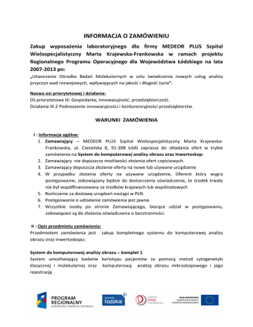 INFORMACJA O ZAMÓWIENIU Zakup wyposażenia laboratoryjnego dla firmy MEDEOR PLUS Szpital Wielospecjalistyczny Marta Krajewska-Frankowska w ramach projektu Regionalnego Programu Operacyjnego dla Województwa Łódzkiego na lata 2007-2013 pn: „Utworzenie Ośrodka Badań Molekularnych w celu świadczenia nowych usług analizy przyczyn wad rozwojowych, wpływających na jakość i długość życia”. Nazwa osi priorytetowej i działania: Oś priorytetowa III: Gospodarka, innowacyjność, przedsiębiorczość. Działanie III.2 Podnoszenie innowacyjności i konkurencyjności przedsiębiorstw. WARUNKI ZAMÓWIENIA I : Informacje ogólne: 1. Zamawiający – MEDEOR PLUS Szpital Wielospecjalistyczny Marta KrajewskaFrankowska, ul. Ciesielska 8, 91-308 Łódź zaprasza do składania ofert w trybie zamówienia na System do komputerowej analizy obrazu oraz Inwertoskop: 2. Zamawiający nie dopuszcza możliwości złożenia ofert częściowych. 3. Zamawiający dopuszcza złożenie oferty na nowe lub używane urządzenie 4. W przypadku złożenia oferty na używane urządzenie, Oferent który wygra postępowanie, zobowiązany będzie do dostarczenia oświadczenia, że środek trwały nie był współfinansowany ze środków krajowych lub wspólnotowych 5. Rozliczenie za dostawę urządzeń nastąpi w PLN. 6. Postępowanie o udzielenie zamówienia jest jawne. 7. Wszystkie osoby po stronie Zamawiającego, biorące udział w postępowaniu, zobowiązani są do złożenia oświadczenia o bezstronności. II : Opis przedmiotu zamówienia: Przedmiotem zamówienia jest zakup kompletnego systemu do komputerowej analizy obrazu oraz inwertoskopu: System do komputerowej analizy obrazu – komplet 1 System umożliwiający badanie kariotypu pacjentów za pomocą metod cytogenetyki klasycznej i molekularnej oraz komputerową analizę obrazu mikroskopowego i jego rejestrację Minimalne parametry techniczne: • nowoczesny binokularowy mikroskop badawczy, z możliwością pracy we fluorescencji, z obiektywem do fluorescencji (100x) i co najmniej dwoma wysokiej jakości obiektywami (10x i 100x) zwykłymi oraz kamerą umożliwiającą przesyłanie obrazu o wysokiej jakości z mikroskopu do komputera w celu jego obróbki i rejestracji. Mikroskop powinien być wyposażony w zestaw filtrów umożliwiających odczyt i rejestrację sygnałów z poszczególnych znaczników fluorescencyjnych (DAPI, DEAC/Spectrum Aqua, Texas Red, Spectrum Orange, FITC/Spectrum Green, Cy5).Powinien umożliwiać pracę w kontraście fazowym. Okulary mikroskopu powinny być regulowane w dwóch osiach. • nowoczesny binokularowy mikroskop badawczy z dwoma obiektywami (10x i 100x) i kamerą umożliwiającą przesyłanie wysokiej jakości obrazu do komputera w celu jego obróbki i rejestracji. Okulary regulowane w dwóch osiach. • oprogramowanie (z pełną licencją) do zbierania, obróbki i dokumentacji obrazu podczas badania kariotypu • oprogramowanie (z pełną licencją) do zbierania, obróbki i dokumentacji obrazu uzyskanego techniką fluorescencyjnej hybrydyzacji in situ (FISH) Każde stanowisko mikroskopowe powinno być wyposażone w osobny komputer i monitor do niezależnej pracy. Komputery przy mikroskopach powinny być połączone z komputerem zawierającym bazy danych, umożliwiające prowadzenie dokumentacji wyników badań. Inwertoskop – szt. 1 Minimalne parametry techniczne: (mikroskop odwrócony) – górnostolikowy, stosowany podczas obserwacji próbek i hodowli komórkowych przy powiększeniach od 10x do 100x. III: Opis warunków udziału w postępowaniu: 1. Warunkiem udziału w postępowaniu, jest udzielenie gwarancji na zakupione urządzenie na minimum 12 miesięcy, co deklaruje Dostawca w formularzu ofertowym. 2. Zapewnienie odpowiedniej jakości urządzenia, serwisu w miejscu realizacji projektu oraz terminu realizacji zamówienia. 3. urządzenie musi spełniać normy CE IV: Sposób obliczenia ceny ofertowej: 1. Cena ofertowa powinna zawierać wszelkie koszty związane z zakupem urządzenia. 2. Cenę należy podać cyfrowo i słownie, wykazując kwotę netto, stawkę i kwotę podatku VAT oraz cenę brutto. V: Kryteria oceny ofert oraz ich opis: 1. Przy wyborze oferty zamawiający będzie się kierował kryterium : - cena – 80% - gwarancja – 20% 2. Punkty obliczone zostaną wg następującego wzoru: cena Pb(C) = (Cn : Cb) x 80% - opis: Pb(C) - ilość punktów Cn - cena oferty najniższej Cb - cena oferty badanej Gdzie: 1% odpowiada jednemu punktowi przyjętemu do oceny. gwarancja Gwarancja do 12 m-cy - 10 pkt Gwarancja powyżej 12 m-cy – 20 pkt 3. Do oceny przyjmuje się całkowitą cenę zamówienia brutto. VI: Termin wykonania zamówienia: 1. Dostawa urządzenia powinna nastąpić nie później niż do końca września 2015 roku VII: Sposób przygotowania ofert: 1. Ofertę na poszczególne urządzenia należy złożyć na załączonym formularzu ofertowym stanowiącym Załącznik nr 1 z zastosowaniem informacji zawartych w „informacji o zamówieniu”. 2. Oferta musi być złożona w języku polskim lub angielskim 3. Oferta musi posiadać logotypy, które zamieszczone są w Załączniku nr 1. 4. Oferta musi być podpisana przez osoby reprezentujące firmę, zgodnie z dokumentem rejestrowym i przepisami prawa. 5. Kserokopie dokumentów załączonych do oferty, muszą być podpisane za zgodność z oryginałem w sposób czytelny. 6. W przypadku dołączenia do oferty nieczytelnej kopii, Zamawiający może zażądać przedstawienia oryginału dokumentu. 7. oferty składane w walutach obcych zostaną przeliczone na PLN wg kursu sprzedaży NBP na dzień otwarcia ofert na potrzeby wyboru oferenta. Dla potrzeb fakturowania na dzień ich wystawienia. VIII: Miejsce i termin składania ofert oraz termin ich otwarcia: 1. Oferty należy składać osobiście w siedzibie firmy MEDEOR PLUS Szpital Wielospecjalistyczny Marta Krajewska-Frankowska, ul. Ciesielska 8, 91-308 Łódź do dnia 10.07.2015 r. do godz. 16.00, pocztą (li