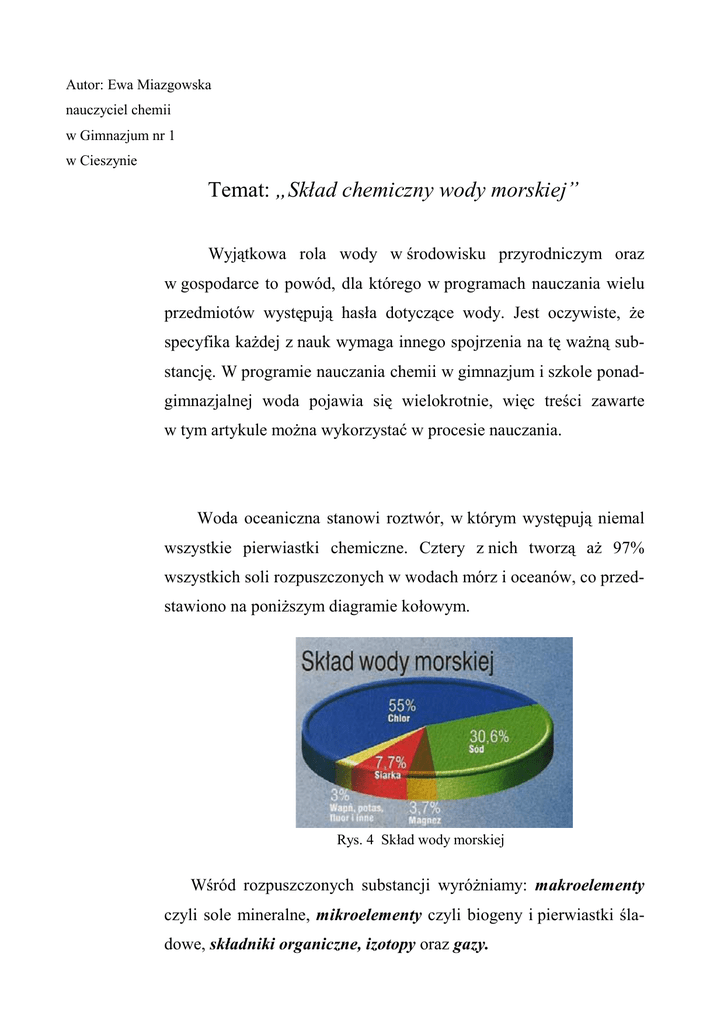 Autor: Ewa Miazgowska nauczyciel chemii w Gimnazjum nr 1 w Cieszynie Temat: „Skład chemiczny wody morskiej” Wyjątkowa rola wody w środowisku przyrodniczym oraz w gospodarce to powód, dla którego w programach nauczania wielu przedmiotów występują hasła dotyczące wody. Jest oczywiste, że specyfika każdej z nauk wymaga innego spojrzenia na tę ważną substancję. W programie nauczania chemii w gimnazjum i szkole ponadgimnazjalnej woda pojawia się wielokrotnie, więc treści zawarte w tym artykule można wykorzystać w procesie nauczania. Woda oceaniczna stanowi roztwór, w którym występują niemal wszystkie pierwiastki chemiczne. Cztery z nich tworzą aż 97% wszystkich soli rozpuszczonych w wodach mórz i oceanów, co przedstawiono na poniższym diagramie kołowym. Rys. 4 Skład wody morskiej Wśród rozpuszczonych substancji wyróżniamy: makroelementy czyli sole mineralne, mikroelementy czyli biogeny i pierwiastki śladowe, składniki organiczne, izotopy oraz gazy. 2 Makroelementy Makroelementy to składniki wody decydujące o jej zasoleniu. Typowy skład soli zawartych w wodzie morskiej przedstawiono w tabeli nr 2: Tabela nr 2. Skład chemiczny wody morskiej1 Nazwa soli Zawartość w g/kg Zawartość % Chlorki 88,7 NaCl MgCl2 27,213 77,8 3,807 10,9 Siarczany (VI) 10,8 MgSO4 1,658 4,7 CaSO4 1,260 3,6 K2SO4 0,863 2,5 Węglany 0,3 CaCO3 0,123 0,3 Pozostałe sole, w tym MgBr2 0,076 0,2 35,000 100,0 Ogółem W rzeczywistości woda morska jest roztworem a zawarte w niej sole występują w formie rozpuszczonej. Słuszne jest zatem przedstawienie ich składu w postaci jonowej. Jonowy skład wody morskiej przedstawia tabela nr 3 Tabela nr 3. Procentowy udział wybranych jonów w wodzie morskiej2 Zawartość procentowa Nazwa i wzór jonu wynikająca z zawartości w g/kg 1. anion chlorkowy 2. kation sodu 2 Na 55,04 + 30,61 3. anion siarczanowy (VI) SO4 2- 7,68 4. kation magnezu Mg2+ 3,69 2+ 5 .kation wapnia Ca 1,16 6. kation potasu K+ 1,10 Razem 1 Cl - 99,28 Por. Z. Różańska, Ekologia środowiska morskiego, Wydawnictwo ART, Olsztyn 1999 Ibidem, 3 Analizując dane z tabeli można zadać pytanie: „Skąd wzięły się te olbrzymie zasoby soli w oceanach?” Ich ilość szacuje się na 5 • 1016 ton. Mogłaby ona pokryć powierzchnię zajętą przez wszechocean warstwą grubości 62 m, a powierzchnię całej kuli ziemskiej warstwą grubości 47,5 m. Należy przypuszczać, że zasoby soli są zapewne tak stare jak wszechocean. Dostały się one do wody oceanicznej równocześnie z jej powstaniem. Przeciętne zasolenie wody morskiej wynosi 35 promili, co oznacza, że 35 g soli rozpuszczonych jest w 1 kg wody. W roku 1884 angielski chemik C. R. Dittmar, badając próbki wody przywiezione przez wyprawę badawczą statku „Challenger”, dokonał zadziwiającego odkrycia. Stwierdził, że w przebadanych oceanach i morzach otwartych woda zawiera te same sole i w takim samym stosunku procentowym. W związku ze stałością wzajemnych stosunków głównych składników wody morskiej jest oczywiste, że miara stężenia jednego z nich w próbce badanej może być wskaźnikiem zasolenia. Dawniej określano zasolenie, mierząc metodą chemiczną zawartość chlorków. Metoda ta polega na miareczkowaniu wody morskiej azotanem (V) srebra w obecności chromianu potasu K2CrO4 jako wskaźnika. Zachodzi wówczas reakcja opisana równaniem: Ag+ + Cl- AgCl Po dodaniu znikomego nadmiaru jonów Ag+ i po wyczerpaniu się jonów chlorkowych w miareczkowanym roztworze zachodzi reakcja jonów CrO42- z jonami Ag+, w czasie której wytrąca się brunatnoczerwony osad chromianu srebra. 4 Reakcja zachodzi zgodnie z równaniem: 2Ag+ + CrO42- Ag2CrO4 Związek między zawartością chlorków a zasoleniem jest następujący: zasolenie = 1, 80655 • równowartość chlorkowa gdzie: równowartość chlorkowa to ilość chlorków w g przypadająca na 1 000 g wody morskiej. W ostatnich latach stosuje się metodę obliczania słoności wody na podstawie pomiarów przewodnictwa elektrycznego za pomocą tzw. salinometru. W metodzie tej wykorzystuje się fakt, że roztwór soli jest elektrolitem i im większe zasolenie przy danej temperaturze, tym wyższe przewodnictwo. 5 Mikroelementy Mikroelementy to substancje występujące w wodzie morskiej w minimalnych ilościach. Należą do nich tzw. biogeny oraz pierwiastki śladowe. Biogeny stanowią niezbędny warunek „żyzności” wody morskiej i decydują o podstawowej produkcji mórz i oceanów. Są to takie substancje jak: fosfor, azot i krzem. Pierwiastki te dostępne są w oceanach w postaci rozpuszczonych fosforanów, azotanów i krzemianów. Biogeny zużywane są w górnej warstwie oceanu, gdyż właśnie tam przenika światło słoneczne i odbywa się proces fotosyntezy. W głębszych warstwach morza bakterie rozkładają martwe szczątki organiczne i dzięki krążeniu wody w oceanie biogeny docierają ponownie do górnych warstw wody. Zawartość tych mikroelementów w wodzie morskiej waha się w bardzo szerokich granicach, np. dla azot 1-700 mg/m3, dla fosforu 1-170 mg/m3. Średnia zawartość związków krzemu w 1 m3 wody morskiej o zasoleniu 35 promili wynosi ok. 500 mg. Pierwiastki śladowe występują w wodzie morskiej w minimalnych, śladowych ilościach. Niektóre z nich, np. żelazo, miedź, kobalt spełniają ważną katalityczną rolę w rozwoju fitoplanktonu oraz wywierają istotny wpływ na tempo procesów fotosyntezy. Miedź, związana z białkiem jako tzw. hemocjanina, w krwi mięczaków, głowonogów i skorupiaków odgrywa przy oddychaniu podobną rolę jak zawierająca żelazo hemoglobina kręgowców. Wiele organizmów morskich posiada zdolność absorbowania i koncentracji pierwiastków śladowych dla potrzeb fizjologicznych i biochemicznych, np. homary i omułki koncentrują kobalt, strzykwy – wanad, niektóre meduzy – cynk, cynę i ołów, promienice – stront, morszczyny i listownice – glin. Bioakumulacja jest ważna nie tylko dl