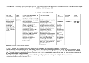 Zarząd Powiatu Kraśnickiego ogłasza przetargi na sprzedaż nieruchomości położonych w Gościeradowie obręb Gościeradów Folwark oznaczonych jako działki nr 40/1, 40/2 oraz nr 38/3 III przetarg - ustny nieograniczony: Oznaczenie nieruchomości Powierzchnia Przeznaczenie nieruchomości w planie miejscowym zagospodarowania przestrzennego Opis nieruchomości Działki nr 40/1 i 40/2 położona w Gościeradowie Folwark Obręb Gościeradów Folwark Nr KW LU1K/00049954/7 KW Nr LU1K/000 49953/0 4,6300 ha Gmina Gościeradów nie posiada miejscowego planu zagospodarowania przestrzennego. Zgodnie z obowiązującym studium Uwarunkowań i Kierunków Zagospodarowania Przestrzennego Gminy Gościeradów działka nr 40/1 położona jest na terenach zabudowy rekreacyjnej natomiast część działki nr 40/2 częściowo położona jest na terenach zabudowy rekreacyjnej a pozostała część na terenie zbiorników wodnych – projektowanych. Działki tworzą zwarty kompleks gruntów o kształcie przylegających do siebie wielokątów. Teren w większości jest nieużytkowany, na części znajdują się sztuczne urządzone zbiorniki wodne. Część terenu zadrzewiona ( drzewa o zróżnicowanym składzie gatunkowym). Przez przedmiotowe działki przebiega napowietrzna sieć energetyczna. Sieć Wodociągowa przebiega przez teren nieruchomości sąsiedniej. Po działce 40/2 przeprowadzana jest kanalizacja deszczowa. Klasa bonitacyjna gruntu Bz- zabudowa rekreacyjna. Cena wywoławcza Wysokość Wadium Termin przetargu 230 000,00zł 23 000,00 zł 06.09.2016r. godz. 10.00 na dzień ogłoszenia przetargu sprzedaż nieruchomości zwolniona jest od podatku VAT, stosownie do art. 43 ust. 1 pkt. 9 ustawy o podatku od towarów i usług Nieruchomość została przeznaczona do sprzedaży. 1 Przetarg odbędzie się w siedzibie Starostwa Powiatowego w Kraśniku przy Al. Niepodległości 20 , sala nr 303 (III piętro) 2.W przetargu mogą brać udział osoby fizyczne, osoby prawne i jednostki organizacyjne nie posiadające osobowości prawnej, ale posiadające zdolność prawną, które wpłacą wadium, (wadium winno być wpłacone w pieniądzu ) przelewem na konto Starostwa Powiatowego w Kraśniku Nr 71 8717 0009 2001 0000 0055 0005 z adnotacją „ Przetarg na sprzedaż nieruchomości oznaczonej nr 40/1 i 40/2 .„ najpóźniej do dnia 31.08.2016 roku. Za datę wniesienia wadium uważa się datę wpływu środków na powyższe konto. 3.O wysokości postąpienia decydują uczestnicy przetargu jednakże wysokość postąpienia nie może wynosić mniej niż 1% ceny wywoławczej z zaokrągleniem w górę do pełnych dziesiątek złotych. 4.Cudzoziemiec chcący wziąć udział w przetargu powinien posiadać pisemne zezwolenie Ministra Spraw Wewnętrznych i Administracji na nabycie przedmiotowej nieruchomości,chyba , ze odrębne przepisy stanowią inaczej. 5.W przypadku zamiaru nabycia nieruchomości w ramach wspólnoty ustawowej małżeńskiej do przetargu winni przystąpić oboje małżonkowie, chyba że zostanie przedłożone przez jedno z nich stosowne pełnomocnictwo notarialne. Wadium również winno być wniesione przez oboje małżonków. - Przed otwarciem przetargu należy przedłożyć komisji przetargowej: - dowód wpłaty wadium, - dowód tożsamości – w przypadku osób fizycznych, aktualny wypis z właściwego rejestru, stosowne pełnomocnictwa, dowody tożsamości osób reprezentujących podmiot – w przypadku osób prawnych oraz innych osób nie posiadających osobowości prawnej. 6.Wadium wpłacone przez uczestnika, który przetarg wygra zalicza się na poczet ceny nabycia, a pozostałym uczestnikom zwraca się niezwłocznie po odwołaniu albo zamknięciu przetargu, jednak nie dłużej niż trzy dni od jego zamknięcia. 7.Ceny nabycia nieruchomości płatne są jednorazowo przed zawarciem umowy notarialnej. 8.Koszt sporządzenia umowy w formie aktu notarialnego, opłaty sądowe oraz ewentualnie inne opłaty ponosi nabywca. 9. Udział w przetargu jest równoczesny z akceptacją Regulaminu przetargu oraz akceptacją stanu prawnego i faktycznego nieruchomości. 10. Jeżeli podmiot ustalony jako nabywca nieruchomości nie przystąpi bez usprawiedliwienia do zawarcia umowy w oznaczonym w zawiadomieniu terminie i miejscu, Zarząd Powiatu Kraśnickiego może odstąpić od zawarcia umowy, a wpłacone wadium nie podlega zwrotowi. 11.Zarząd Powiatu Kraśnickiego może z uzasadnionej przyczyny unieważnić lub odwołać ogłoszony przetarg. Pierwszy przetarg ustny nieograniczony odbył się 06.05. 2016r., drugi przetargu ustny nieograniczony odbył się 30.06.2016r. Przetargi te zakończyły się wynikiem negatywnym. Dane na temat nieruchomości można uzyskać pod nr telefonu (81) 826-18-05 lub w siedzibie Starostwa przy al. Niepodległości 20 w Kraśniku w pok. nr. 306, III piętro. oraz IV przetarg - ustny ograniczony na sprzedaż Oznaczenie nieruchomości Działka nr 38/3 położona w Gościeradowie Folwark Obręb Folwark, Nr KW LU1K/00049954/7 Powierzchnia 6,3000 ha Przeznaczenie nieruchomości w planie miejscowym zagospodarowania przestrzennego Opis nieruchomości Przeznaczenie: Gmina Gościeradów nie posiada miejscowego planu zagospodarowania przestrzennego. Zgodnie z obowiązującym Studium Uwarunkowań i Kierunków Zagospodarowania Przestrzennego Gminy Gościeradów działka ta położona jest na terenach zabudowy usługowej i produkcyjnej ozn. symb. PU. Jest to działka niezabudowana, dotychczas użytkowana jako nieruchomość rolna ( kl RIIIb 2,81 ha i kl R IVa 3,49 ha). Ewentualna zabudowa terenu wymagała będzie uzyskania decyzji o warunkach zabudowy oraz decyzji wyłączenia gruntu z produkcji rolnej (zgodnie z ustawą z dnia 3 lutego 1995 r. o ochronie gruntów rolnych i leśnych tj. Dz.U z 2015 poz. 909). Działka nie posiada bezpośredniego dostępu do drogi publicznej - dojazd zapewniony jest poprzez służebność gruntową ustanowioną na rzecz każdoczesnego właściciela działki nr 38/3.