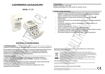 ŁADOWARKA AA/AAA/6LR61 3. Specyfikacja Napięcie wejściowe: 100V~240V Rodzaje akumulatorów: AA, AAA, 6LR61 9V (Ni-MH i Ni-Cd) 1. Informacje ogólne Ładowarka mikroprocesorowa dedykowana do akumulatorów AA i AAA oraz 6LR61 9V WWW Proces ładowania jest w pełni automatyczny za sprawą wbudowanego mikroprocesora który kontroluje stan naładowania akumulatora. Po maksymalnym naładowaniu mikroprocesor automatycznie zmienia tryb pracy na podtrzymywanie ładowania, dodatkowy układ zabezpiecza przed przeładowaniem. 2. Instrukcja obsługi 1. Włożyć akumulatorki wymagające naładowania w odpowiednie miejsce w ładowarce. Akumulatorki wkładać zawsze PARAMI – ładowarka nie naładuje jednego akumulatora lub 3. 2. Włożyć ładowarkę go gniazdka sieciowego. Rozpoczęcie procesu ładowania jest sygnalizowane poprzez zaświecenie się czerwonej diody. 3. Po pełnym naładowaniu ładowarka automatycznie przełącza się w tryb doładowywania impulsowego. PL ONIX. .ALLTR INSTRUKCJA UŻYTKOWANIA 4. Uwagi i środki ostrożności • Ładowarka służy WYŁĄCZNIE do ładowania akumulatorków AA/AAA/9V NiMH/Ni-Cd , ładowanie innych typów może spowodować wybuch, porażenie prądem, obrażenia ciała i inne poważne zdarzenia. • Baterie różniące się pojemnością i wielkością nie mogą być ładowane jednocześnie. • Grzanie się ładowarki oraz akumulatorków jest podczas ładowania zjawiskiem normalnym. • Przechowuj urządzenie z dala od źródła wilgoci, w suchym i wolnym od zanieczyszczeń miejscu. • Używać w temperaturze 0 - 40 st. C. • Czyść urządzenie za pomocą suchej, delikatnej szmatki. • Nie otwierać urządzenia, gdyż spowoduje to utratę gwarancji. Może to również spowodować pożar lub uszkodzenia mienia osobistego. • Nie narażaj urządzenia na ekstremalnie niskie i wysokie temperatury. WWW .ALLTR ONIX. PL MODEL: FL-05