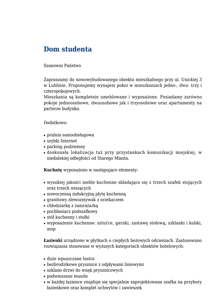 Dom studenta Szanowni Państwo Zapraszamy do nowowybudowanego obiektu mieszkalnego przy ul. Unickiej 3 w Lublinie. Proponujemy wynajem pokoi w mieszkaniach jedno-, dwu- trzy i czteropokojowych. Mieszkania są kompletnie umeblowane i wyposażone. Posiadamy zarówno pokoje jednoosobowe, dwuosobowe jak i trzyosobowe oraz apartamenty na parterze budynku. Dodatkowo: ● ● ● ● pralnia samoobsługowa szybki Internet parking podziemny doskonała lokalizacja tuż przy przystankach komunikacji miejskiej, w niedalekiej odległości od Starego Miasta. Kuchnię wyposażono w następujące elementy: ● ● ● ● ● ● ● wysokiej jakości meble kuchenne składające się z trzech szafek stojących oraz trzech wiszących nowoczesną indukcyjną płytę kuchenną granitowy zlewozmywak z ociekaczem chłodziarkę z zamrażarką pochłaniacz podszafkowy stół kuchenny i stołki wyposażenie kuchenne: sztućce, garnki, zastawę stołową, szklanki i kubki, mop Łazienki urządzone w płytkach o ciepłych beżowych odcieniach. Zastosowano rozwiązania stosowane w wyższych kategoriach obiektów hotelowych: ● ● ● ● ● duże wpuszczane lustra bezbrodzikowe prysznice z odpływami liniowymi szklane drzwi do wnęk prysznicowych podwieszane muszle w każdej łazience znajduje się specjalnie zaprojektowana szafka na przybory łazienkowe oraz komplet uchwytów i zawieszek W pokojach proponujemy: ● ● ● ● ● ● wygodne, wzmocnione i solidnie wykonane łóżko z tapicerowanym wezgłowiem i skrzynią na pościel szafę ubraniową z wieszakami, półkami oraz nadstawką wysoki regał z regulowaną wysokością półek funkcjonalne biurko wraz z szafką i fotelem obrotowym stolik nocny podwójną półkę wiszącą Pokoje wykończone są wysokiej klasy materiałami, w oknach zastosowano funkcjonalne roletki. Do każdego łóżka proponujemy komplet pościeli oraz bielizny pościelowej. Obiekt jest monitorowany za pomocą kilkunastu kamer z zapisem cyfrowym. Kamery umieszczono zarówno na zewnątrz budynku jak w klatkach i windach. W godzinach dziennych czynna jest administracja, która służy pomocą wszystkim mieszkańcom, po godzinach pracy administracji w budynku przebywają pracownicy ochrony. Dla osób zmotoryzowanych istnieje możliwość skorzystania z parkingu podziemnego. Na parterze urządzono dostępną dla mieszkańców pralnię z pralnicami i suszarkami profesjonalnymi znanej marki. Opłaty: Studenci WSEI: Pokój 1 osobowy – 500 zł brutto + media Pokój 2 osobowy – 350 zł brutto + media Pokój 3 osobowy – 300 zł brutto + media Studenci innych Uczelni: Pokój 1 osobowy 650 zł + media Pokój 2 osobowy 540 zł brutto + media Apartament: 1400 zł netto + media Do czynszu za wynajem doliczane są opłaty za media: energię elektryczną, ogrzewanie i wodę, zgodnie ze wskazaniami liczników. KAUCJA – celem zabezpieczenia ewentualnych strat i zniszczeń pobierana jest kaucja w wysokości jednomiesięcznego czynszu lub 2 miesięcznego czynszu w części komercyjnej. Kaucja płatna jest przed zakwaterowaniem. Opłata rezerwacyjna wynosi 200 zł i w przypadku rezygnacji nie podlega zwrotowi. Szczegółowe informacje: tel. 508 245 780 e-mail: [email protected] Broszura - dom studenta pobierz Broszura - dom studenta w j.ang pobierz Dom studenta
