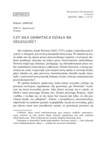 ARTYKUŁY Zagadnienia Filozoficzne w Nauce XXXVII / 2005, s. 15–31∗ Robert JANUSZ WSF–P „Ignatianum” Kraków CZY SIŁA GRAWITACJI DZIAŁA NA ODLEGŁOŚĆ? Jak wiadomo, Izaak Newton (1642–1727), jeden z największych fizyków w dziejach, jest twórcą mechaniki klasycznej. W ramach tej teorii udało mu się opisać prawo powszechnego ciążenia i rozwiązać niektóre problemy stawiane od stuleci przez obserwatorów nieboskłonu. Newton mógł tego dokonać, posługując się sformułowanym przez siebie rachunkiem różniczkowo–całkowym. Dzieła Newtona, z teorią grawitacji na czele, rozpoczęły tym samym nową epokę w rozwoju fizyki, gdyż właśnie on, jako pierwszy, konsekwentnie określił zasady dynamiki i zastosował nową metodę badania świata, tworząc matematyczne przyrodoznawstwo1 . W ogólnej kulturze społecznej, która mimo wszystko cechuje się pewnym rozwojem, zagadnienie siły grawitacji „po Newtonie” wydawać się może trywialnie proste. Jako dzieci uczymy się w szkole, że Słońce (tam) przyciąga Ziemię (tu), Ziemia przyciąga Księżyc, ludzi i jabłka, i wydaje się, że nie może być inaczej jak tylko, że siła grawitacji działa „na odległość”. Zatem, z perspektywy newtonowskiej, odpowiedź na tytułowe pytanie wyglądałaby raczej na trywialną, gdyż już dawno temu nasi przodkowie uznali, że grawitacja przenosi się UWAGA: Tekst został zrekonstruowany przy pomocy środków automatycznych; możliwe są więc pewne błędy, których sygnalizacja jest mile widziana ([email protected]). Tekst elektroniczny posiada odrębną numerację stron. 1 Pomijamy tu doniosłość badań poprzedników Newtona, którzy — choć dokonali wielu fundamentalnych odkryć — jednak nie stworzyli mechaniki. ∗ 2 Robert JANUSZ przez pustą przestrzeń, a planety nie potrzebują specjalnych „sfer”, po których mogłyby się toczyć, ani „lin”, które by je w ruchu krzywoliniowym utrzymywały. Jednakże, wbrew tej prostocie, w tytule naszego artykułu zawartych jest kilka ważnych pytań, na które będziemy się starać odpowiedzieć: co to znaczy, że grawitacja działa?, co znaczy, że działa na odległość? i czy w ogóle grawitacja jest siłą? Zanim zaczniemy odpowiadać na pytania dotyczące powszechnego ciążenia, skupimy uwagę na pojęciu siły, wprowadzonym do fizyki przez Newtona. Następnie spróbujemy — w ramach jego teorii — sprawdzić, czy rzeczywiście grawitacja nie przejawia, jako siła, jakichś trudności. W końcu zobaczymy, co nowego wprowadził do teorii grawitacji A. Einstein. 1. POJĘCIE SIŁY W MECHANICE KLASYCZNEJ Mechanika klasyczna Newtona jest teorią ruchu punktów materialnych. Zagadnienie ruchu stanowiło od zarania dziejów jeden z głównych problemów, także filozoficznych. Do czasów Newtona zrozumienie ruchu (zmiany) związane było z potocznymi intuicjami lub pojęciami jakościowymi. Chociaż już przed Newtonem wyrażano odległości przestrzenne i przedziały czasowe w formie liczbowej, to jednak nie umiano trafnie określić, czym jest zmiana położenia w czasie. Dopiero dzięki matematycznemu pojęciu pochodnej funkcji można było wypracować pojęcie zmiany w taki sposób, że wyjaśniło ono dotychczasowe nieścisłości oraz zapoczątkowało samodzielny rozwój zmatematyzowanego pojęcia ruchu. Pochodna opisuje bowiem, co dzieje się lokalnie, w małym otoczeniu poruszającego się punktu — jest styczną do jego toru. Właśnie poprzez pochodną funkcji Newton opisał prędkość (jako zmianę położenia: v = s′ )2 i przyspieszenie (jako zmianę prędkości: a = v′ = s′′ ) punktowego ciała, którego jedyną wewnętrzną charakterystyką fizyczną — wymaganą przez teorię — 2 Pochodną względem czasu, na potrzeby naszego artykułu, oznaczamy primem (′ ), pochodną pochodnej — ′′ . Pomijamy tu techniczny problem, że położenie, prędkość itd. są wielkościami wektorowymi. CZY SIŁA GRAWITACJI DZIAŁA NA ODLEGŁOŚĆ? 3 była masa. W ten sposób Newton rozpoczął budowę swojej dynamiki, która wyjaśniła ruchy ciał poruszających się pod wpływem działania na nie różnych sił. Jeśli tylko będzie nam znana matematyczna formuła na działającą siłę, to — dzięki zasadom dynamiki — będzie można obliczyć tor ruchu (położenie w czasie) interesującego nas punktu materialnego. Jednak pojęcie siły, jakie występuje w teorii Newtona, ma swoje specyficzne, niespotykane dotychczas, znaczenie. Newton przejął od Galileusza (1564–1642) zasadę bezwładności, która mówi, co dzieje się z ciałem fizycznym, gdy nie działa na nie żadna siła: ciało takie pozostaje w spoczynku lub porusza się jednostajnie prostoliniowo w układzie inercjalnym3 . Trzeba było następnie odkryć, co dzieje się w tym układzie z takim ciałem fizycznym, gdy działa na nie jakaś siła4 . Właśnie druga zasada, odkryta przez Newtona, odpowiada na to pytanie, tłumacząc jednocześnie zasadę bezwładności Galileusza (gdy F = 0). W myśl drugiego prawa Newtona, siła działająca na ciało powoduje zmianę jego pędu: F = p′ , gdzie pęd jest określony jako iloczyn masy i prędkości: p = mv. W ten sposób, po dodaniu trzeciej zasady: akcja = −reakcja, ogólne zasady dynamiki zostały sformułowane tak, że znając działającą siłę, można rozwiązać układ równań różniczkowych (są to równania zawierające pochodne) opisujący ruch. Zauważmy, że zasady mechaniki obowiązują jedynie w układach inercjalnych, określonych przez niedziałanie nań żadnej siły; aby wskazać układ inercjalny, musimy wiedzieć, co to jest siła — gdy chcemy ją zmierzyć, potrzebujemy układu inercjalnego. Widzimy zatem, że kłopoty z koncepcją siły, będące jednocześnie kłopotami z koncepcją inercjalnego układu odniesienia (i na odwrót), będą dotyczyć samych fundamentów mechaniki Newtona. Ponadto, wszystkie pojęcia, zdefiniowane przez Newto