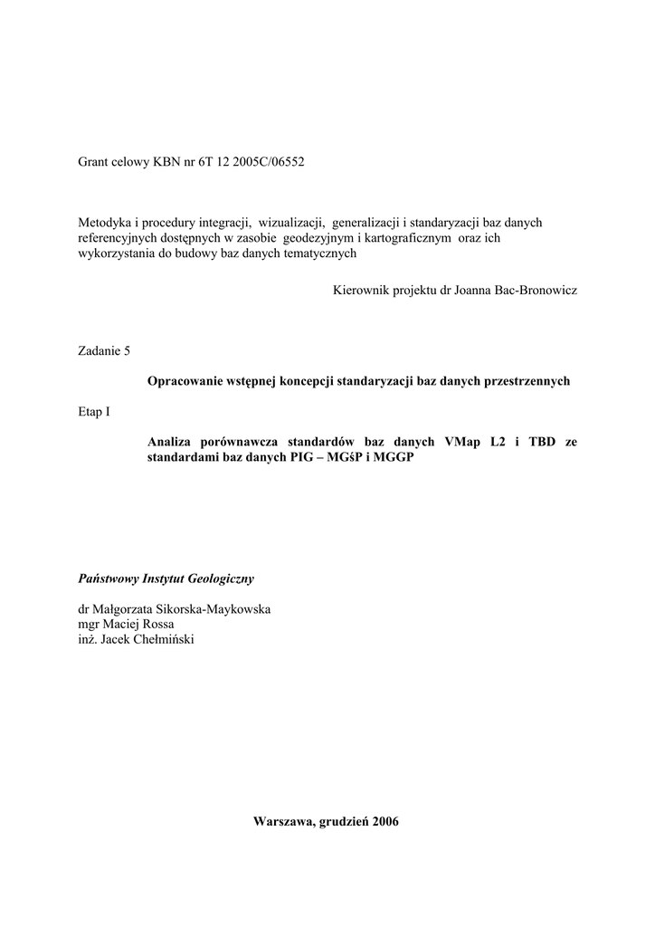 Grant celowy KBN nr 6T 12 2005C/06552 Metodyka i procedury integracji, wizualizacji, generalizacji i standaryzacji baz danych referencyjnych dostępnych w zasobie geodezyjnym i kartograficznym oraz ich wykorzystania do budowy baz danych tematycznych Kierownik projektu dr Joanna Bac-Bronowicz Zadanie 5 Opracowanie wstępnej koncepcji standaryzacji baz danych przestrzennych Etap I Analiza porównawcza standardów baz danych VMap L2 i TBD ze standardami baz danych PIG – MGśP i MGGP Państwowy Instytut Geologiczny dr Małgorzata Sikorska-Maykowska mgr Maciej Rossa inż. Jacek Chełmiński Warszawa, grudzień 2006 Spis treści 1. Wstęp 2. Zadania Zespołu PIG 3. Bazy danych przestrzennych PIG – ogólna charakterystyka, przegląd i specyfika 4. Technologia MGśP 5. Zastosowana metodyka 6. Charakterystyka baz MGŚP i MGGP 7. Wnioski i podsumowanie 8. Spis załączników 2 1. Wstęp Prezentowane opracowanie stanowi podsumowanie pierwszego etapu prac realizowanych w 2006 roku przez Zespół Państwowego Instytutu Geologicznego w składzie: dr Małgorzata Sikorska-Maykowska, mgr Maciej Rossa i inż. Jacek Chełmiński, w ramach części Zadania 5 „Opracowanie wstępnej koncepcji standaryzacji baz danych przestrzennych” grantu celowego KBN nr 6T 12 2005C/06552 pt. „Metodyka i procedury integracji, wizualizacji, generalizacji i standaryzacji baz danych referencyjnych dostępnych w państwowym zasobie geodezyjnym i kartograficznym oraz ich wykorzystania do budowy baz danych tematycznych”. Służba geodezyjna i kartograficzna jest obecnie na etapie definiowania Infrastruktury Danych Przestrzennych w Polsce. W tym kontekście istniejące w Polsce bazy danych przestrzennych: BDT, VMAP L2 i BDO należy traktować jako dane referencyjne, które powinny ulec uspójnieniu w możliwie szerokim zakresie i stanowić osnowę dla specjalistycznych opracowań tematycznych. Opracowanie racjonalnej koncepcji SDI w Polsce wymaga nie tylko opracowania wiarygodnych baz referencyjnych, lecz także harmonizacji opracowywanych przez różne instytucje baz tematycznych. Bazy danych tematycznych realizowane na zlecenie Głównego Urzędu Geodezji i Kartografii sozologiczna (SOZO) i hydrograficzna (HYDRO) mają swoje „odpowiedniki” w bazach wykonywanych w Państwowym Instytucie Geologicznym: Mapie geośrodowiskowej Polski (MGśP) i Mapie hydrogeologicznej Polski (MHP), a w Instytucie Meteorologii i Gospodarki Wodnej: w Mapie Podziału Hydrograficznego Polski (MPHP). Mimo podobnych nazw bazy te bardzo różnią się między sobą nie tylko treścią ale i strukturą. Np.: bazy MGśP i SOZO przedstawiane w formie kartograficznej jako mapy: geośrodowiskowa i sozologiczna, mimo niemal identycznych tytułów i podobnie brzmiących 3 warstw/poziomów informacyjnych, przedstawiają informacje w znaczący sposób różniące się od siebie, inaczej zdefiniowane, inaczej interpretowane. Z punktu widzenia użytkownika danych tematycznych istotna jest możliwość integracji danych przestrzennych pochodzących z wielu źródeł zewnętrznych. Zastosowanie odmiennych źródeł bazowych danych topograficznych lub też zastosowanie odmiennych technik wektoryzacji map analogowych sprawia obecnie, iż obiekty geometryczne w bazach danych przestrzennych GUGiK, PIG i IMiGW różnią się istotnie. Bezpośrednia integracja tych danych jest praktycznie niemożliwa. Opracowanie spójnej w skali kraju bazy referencyjnej i przyjęcie jej jako źródła danych topograficznych pozwoli na rozwiązanie tego problemu. Częściowa przynajmniej harmonizacja modeli pojęciowych baz danych tematycznych opracowywanych przez ww. instytucje pozwoliłaby na łączne przetwarzanie danych tematycznych zgromadzonych w bazach danych GUGiK i PIG oraz powiązanie ich z danymi referencyjnymi projektowanej Wielopoziomowej Bazy Danych Topograficznych (WBDT). Podejście to pozwoli nie tylko na znaczące ułatwienie w przetwarzaniu danych, lecz także – w przyszłości, na znaczące obniżenie kosztów aktualizacji poszczególnych opracowań tematycznych. 2. Zadania Zespołu PIG W ramach realizacji zadania 5 – „Opracowanie wstępnej koncepcji standaryzacji baz danych przestrzennych” w etapie I zatytułowanym: „Analiza porównawcza standardów baz danych VMap L2 drugiej edycji i TBD ze standardami baz danych PIG – MGśP i MGGP” zajęto się problemem wykorzystania przy tworzeniu map tematycznych, jako warstwy referencyjne, baz zgromadzonych w zasobie CODGiK. W etapie II (2007 r.) przewiduje się, że w ramach tematu 2: „Harmonizacja baz danych tematycznych i opracowanie koncepcji wykorzystania WBDT jako modelu referencyjnego dla opracowań tematycznych” zostanie przedstawiona analiza szczegółowa baz HYDRO i SOZO w odniesieniu do baz MHP i MGP. Głównym zadaniem Zespołu PIG, w ramach omawianego projektu jest przeprowadzenie szczegółowej analizy możliwości integracji wybranych baz danych PIG z bazami TBD i VMap Level2 drugiej edycji oraz opracowanie wstępnej propozycji sposobu harmonizacji baz danych PIG (geologicznych, hydrogeologicznych i geośrodowiskowych) z przyszłą WBDT. 4 W 2006 roku realizowany był pierwszy etap zadań Zespołu PIG, który obejmował przeprowadzenie szczegółowej analizy porównawczej geośrodowiskowych baz danych PIG (MGśP i MGGP) z bazami TBD i VMapL2 edycja 2 w zakresie tematycznym jaki reprezentuje baza MGśP, a co w przyszłości mogłoby zasilać bazę danych o stanie i zasobach środowiska przyrodniczego Polski pod ogólną nazwą - ŚRODOWISKO. Drugi etap prac, realizowany w 2007 r. obejmował będzie analogiczną analizę w zakresie tematycznym zawężonym do zagadnień: hydrograficznych, hydrogeologicznych i hydrologicznych, umownie nazwanych warstwą tematyczną WODY, która wchodziłaby w skład bazy danych ŚRODOWISKO. Szczegółowej analizie poddane zostaną bazy danych PIG: MHP, Bank HYDRO, oraz elementy dotyczące hydrologii i hydrogeologii z baz geośrodowiskowych MGśP i MGGP (cha