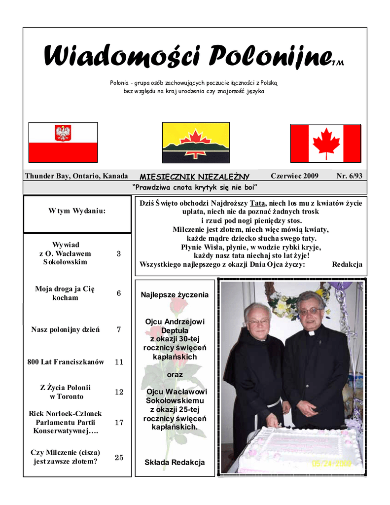 Wiadomosci Polonijne TM Polonia - grupa osób zachowujących poczucie łączności z Polską bez względu na kraj urodzenia czy znajomość języka Thunder Bay, Ontario, Kanada MIESIĘCZNIK NIEZALEŻNY Czerwiec 2009 Nr. 6/93 “Prawdziwa cnota krytyk się nie boi” W tym Wydaniu: Wywiad z O. Wacławem S okołowskim 3 Moja droga ja Cię kocham 6 Nasz polonijny dzień 7 800 Lat Franciszkanów 11 Dziś Ś więto obchodzi Najdroższy Tata, niech los mu z kwiatów życie uplata, niech nie da poznać żadnych trosk i rzuci pod nogi pieniędzy stos. Milczenie jest złotem, niech więc mówią kwiaty, każde mądre dziecko słucha swego taty. Płynie Wisła, płynie, w wodzie rybki kryje, każdy nasz tata niechaj sto lat żyje! Wszystkiego najlepszego z okazji Dnia Ojca życzy: Redakcja Najlepsze życzenia Ojcu Andrzejowi Deptuła z okazji 30-tej rocznicy święceń kapłańskich oraz Z Życia Polonii w Toronto 12 Rick Norlock-Członek Parlamentu Partii Konserwatywnej…. 17 Czy Milczenie (cisza) jest zawsze złotem? 25 Ojcu Wacławowi Sokołowskiemu z okazji 25-tej rocznicy święceń kapłańskich. Składa Redakcja Wiadomości Polonijne 2 Redaguje Zespół: Lucy Michalak Tadeusz Michalak Agnieszka Reszkows ka-Kania Robert Kania Korespondenci: Joanna Adamik Agnieszka Buda-Rodriguez A. Cooke B. Ejbich I.. Giżewski A. Siwiak Waldi Opracowanie: Lucy Michalak Wy dawca: Wiadomości Polonijne 236 Masters Street. Thunder Bay , Ont. P7B 6L5 e-mail: [email protected] Redakcj a zastrzega sobie prawo skracani a i edycji nadesł anych tekst ów. Wyrażone w tekstach opinie należą do autorów i nie zawsze odzwierciedlają stanowisko redakcji. Za treść ogłoszeń i reklam redakcja nie ponosi odpowiedzialności. Wiadomości Polonijne są pismem całkowici e bezpłatnym. Wszelkie koszty związane z druki em są pokrywane z dotacji. Każda pomoc finansowa jest mile widziana. Czerwiec 2009 WIADOMOŚCI Z POLSKI-Tadeusz Michalak Rząd zaproponował reformę sądów, mającą usprawnić zarządzanie nimi. Proponuje m.in. okresowe oceny sędziów, zmniejszeni e uprawnień samorządu sędziowskiego i KRS, większe uprawnienia dyrektorów sądów. Środowisko sędziowskie chce wręcz odwrotnie, wzmacni ać s amorząd i zabrać ministerstwu nadzoru nad sądami. A pomysły ministerstwa uważaj ą za wypowi edzenie im wojny. Uniwersytecie Stefana Wyszyńskiego, a już mamy na Wydziale Prawa UW konferencje `Prawa osobom homoseksualnych do życia w rodzinie'. A w Wysokich Obcasach pewna pani doktor tłumaczy, że wszyscy są trochę bi, a kobiety nawet bardziej. Inflacja w kwietniu wzrosła, według GUS, do 4%. Odwrotnie niż w innych krajach. Na wzrost inflacji wpływ mają m.in. słaba złotówka (drożeją towary importowane) oraz wzrost cen żywnoś ci. Prezydent chce odtąd osobiście rozmawi ać z kandydatami na ambasadorów, żeby poznać ich poglądy. Minister Sikorski już zadekl arował, że bardzo cieszy się z tej inicjatywy i będzie wręcz zachęcał. I zaznaczył t eż, że s am pogl ądów politycznych kandydatów na ambasadorów nie zna i o nie, nie pyta. Oświ adczeni e Sikorski ego zaskoczyło zapewne Kancelarie Prezydenta, która wcześni ej włożyła dużo wysiłku w uzasadniani e, dlaczego to prezydent ma prawo przesłuchiwać i że to żadna formalna zmiana procedury. Był skandal, i nic go nie naprawi Gdy siedem lat temu oskarżono szefów S toczni S zczeci ńs ki ej o rzekom e malwersacje i doprowadzenie do upadku stoczni. Teraz, po siedmiu latach, Sąd Apelacyjny ostatecznie orzekł, że oskarżeni są niewinni i działali nie tylko w ramach prawa, ale wręcz w interesie Stoczni. Były wiceprezes, były wojewoda, i kilku współpracowników stracili przez te lata dobre imię i zdrowie. Wszelkiego rodzaju ogloszeni a i ży c z eni a d o “ W i adom o ś ci P ol oni j ych” przyj m uj e Lucy Jes zcze o `trójstronnym' pakcie Michalak tel. 767-4200 antykryzysowym Naj ważni ejs ze post anowi enie, o tej Wzory reklam zaprojektowanych gwarantowanej płacy minimalnej dla przez Wiadomości Polonijne” są pracowników firm w kłopotach, nie własnością wydawnictwa. pociągnie za sobą obowiązku późni ejszego Kopiowanie i ich publikowanie bez zwrotu rządowej pomocy. Będą tez zmiany zgody redakcji jest nielegalne. um ożli wi aj ące bardzi ej el as tyczne rozliczanie czasu pracy (w skali 12 Redakcja “ Wiadomości miesięcznej i w skali dobowej ). Chodzi o to, Polonijnych” zapras za wszystkich by w czasie gorszym można było pracować Czytelników do przysyłania własnej np. tylko 6 godzin, a jak się poprawi twórczoś ci. Mogą to być zarówno odrabiać przez większą liczbę godzin, bez wiersze jak i proza. konieczności płacenia za nadgodziny. Dwa inne postulaty: zniesienia ograni czeń pł ac Termin nadsyłania materiałów do dla menadżerów w firmach państwowych i gazety upływa 15-go każdego podniesienia realnej płacy minimalnej, nie zostały przyjęte do realizacji w tym roku. miesiąca. Premier czyni nadzieje na wejście ustaw w życie w czasie wakacji. Rząd przyjął projekt ustawy o państwowej pomocy w spłacie kredytów dla osób, które utraciły prace. Pomoc niezbyt wysoka, wypłacana, co najwyżej przez rok, i do zwrotu, tyle że bez odsetek. Sąd orzekł, że kierowca miał prawo odmówić opłaty za przejazd autostradą w remoncie. W konkretnym rozpatrywanym przypadku kierowca odmówił zapłacenia za przejazd, bo na autostradzie czynny był tylko jeden pas ruchu, a pokonanie 30km zajęło mu ponad godzinę. Został przez zarządcę autostrady oskarżony o wyłudzenie kwoty 6.50 zł. Sąd uznał, że klient ma prawo do kwestionowania jakości usług. To nowość, wcześniej sądy w takiej sytuacji nakazywały kierowcom płacenie. Gorbacz ow: Jan Paweł II na ołtarze Były prezydent ZSRR Michaił Gorbaczow wyznał, że pragnie, aby papież Jan Paweł II został wyniesiony na ołtarze. Przysłowie miesiąca Gdy czerwiec chłodem i wodą szafluje, to zwykle 