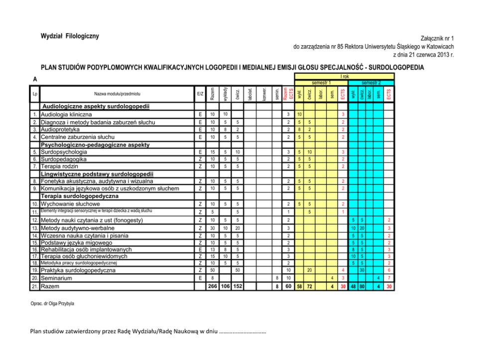 Wydział Filologiczny Załącznik nr 1 do zarządzenia nr 85 Rektora Uniwersytetu Śląskiego w Katowicach z dnia 21 czerwca 2013 r. PLAN STUDIÓW PODYPLOMOWYCH KWALIFIKACYJNYCH LOGOPEDII I MEDIALNEJ EMISJI GŁOSU SPECJALNOŚĆ - SURDOLOGOPEDIA I rok A wykł. 10 5 2 5 5 2 10 8 2 2 8 2 2 10 5 5 2 5 5 2 E Z Z 15 5 10 3 5 10 3 10 5 5 2 5 5 2 10 5 5 2 5 5 2 Z Z 10 5 5 2 5 5 2 10 5 5 2 5 5 2 Z 10 5 5 2 5 5 2 5 1 5 5 2 13. 14. 15. 16. 17. 18. 19. 20. Z Z Z E Z Z Z E 30 10 20 3 10 20 3 10 10 13 15 10 5 5 8 10 5 5 5 5 5 5 2 2 3 3 2 5 5 8 10 5 2 2 3 3 2 Metody audytywno-werbalne Wczesna nauka czytania i pisania Podstawy języka migowego Rehabilitacja osób implantowanych Terapia osób głuchoniewidomych Metodyka pracy surdologopedycznej Praktyka surdologopedyczna Seminarium 21. Razem 50 50 8 266 106 152 Oprac. dr Olga Przybyla Plan studiów zatwierdzony przez Radę Wydziału/Radę Naukową w dniu ………....……………… 10 8 10 8 60 3 20 58 ECTS 2 sem. 5 labor. wykł. ćwicz. 1 5 10. ECTS 5 10 8. 9. sem. 5 Z 5. 6. 7. Audiologiczne aspekty surdologopedii Audiologia kliniczna Diagnoza i metody badania zaburzeń słuchu Audioprotetyka Centralne zaburzenia słuchu Psychologiczno-pedagogiczne aspekty Surdopsychologia Surdopedagogika Terapia rodzin Lingwistyczne podstawy surdologopedii Fonetyka akustyczna, audytywna i wizualna Komunikacja językowa osób z uszkodzonym słuchem Terapia surdologopedyczna Wychowanie słuchowe E/Z labor. Z 12. Metody nauki czytania z ust (fonogesty) 1. 2. 3. 4. Nazwa modułu/przedmiotu ćwicz. Razem ECTS 3 5 semin. 10 10 konwer. 10 labolat. E E E E 11. Elementy integracji sensorycznej w terapii dziecka z wadą słuchu Lp ćwicz. wykłady semestr 2 Razem semestr 1 72 4 4 3 4 30 5 5 5 5 5 30 48 80 6 4 7 4 30