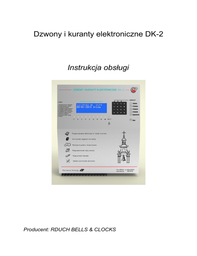 Dzwony i kuranty elektroniczne DK-2 Instrukcja obsługi Producent: RDUCH BELLS & CLOCKS - strona 2 - ZEGAR STERUJĄCY R-5002 - Spis treści I. Informacje ogólne..........................................................................................................3 II. Ręczne załączanie dzwonów .........................................................................................5 III. Ręczne załączanie kurantów..........................................................................................5 IV. Aktywacja programu blokowego...................................................................................5 V. Opis funkcji.....................................................................................................................6 VI. Priorytety programów....................................................................................................6 VII. Znaczenie programów...................................................................................................7 VIII. Struktura menu..............................................................................................................8 IX. Programy zegara sterującego........................................................................................9 1. Programowanie dzwonów...........................................................................................9 2. Programowanie melodii............................................................................................14 3. Programy blokowe....................................................................................................16 4. Przegląd i edycja dzwonów.......................................................................................16 5. Przegląd i edycja melodii..........................................................................................18 6. Przegląd i edycja programów blokowych.................................................................18 7. Aktywne programy dnia............................................................................................18 8. Blokada wybijania.....................................................................................................19 9. Ustawianie daty i czasu.............................................................................................20 X. Uwagi końcowe..........................................................................................................20 XI. Spis świąt liturgicznych.............................................................................................21 XII. Karta gwarancyjna....................................................................................................22 XIII. Schemat połączeń.....................................................................................................23 - strona 3 - ZEGAR STERUJĄCY R-5002 I. Informacje ogólne Zegar sterujący R-5001 jest najnowszym sterownikiem firmy RDUCH, służącym do automatycznego sterowania dzwonami, kurantami, zegarem wieżowym oraz gongami kwadransowymi i godzinowymi. Komputer jest synchronizowany sygnałem radiowym DCF lub satelitarnym GPS. Dzięki temu wskazuje idealny czas, automatycznie przełącza się na czas letni / zimowy i odwrotnie. W stosunku do poprzednich wersji zaszły w nim istotne zmiany: ● zastosowano duży, czytelny alfanumeryczny wyświetlacz LCD ● wprowadzono kalendarz liturgiczny umożliwiający zaprogramowanie komputera w święta kościelne zarówno stałe jak i zmienne ● wprowadzono tzw. Programy blokowe, które to umożliwiają szybkie i łatwe wprowadzenie dzwonienia świątecznego ( niedzielnego) w dowolnym dniu tygodnia. ● wprowadzono automatyczne wybijanie gongów w noc sylwestrową ● zastosowano bardzo dokładny zegar czasowy amerykańskiej firmy ( w przypadku długotrwałego braku synchronizacji z DCF zegar chodzi nadal bardzo dokładnie) ● zastosowano nowoczesną superpłaską obudowę z tworzywa typu ABS produkcji niemieckiej Mikroprocesorowy sterownik dzwonów i melodii R – 5001 realizuje następujące funkcje: wskazuje aktualny czas w systemie rocznym i datę ze wskazaniem dnia tygodnia; steruje automatycznie pracą elektrycznych napędów dzwonów zgodnie z programem zapisanym przez użytkownika; steruje automatycznie urządzeniem do wygrywania melodii zgodnie z programem zapisanym przez użytkownika; nadzoruje w sposób ciągły pracę zegara wieżowego poprzez wysyłanie impulsów minutowych i dwukrotne w ciągu doby porównywanie jego wskazań z czasem rzeczywistym; steruje wybijaniem kurantów oznaczających pełne godziny i kwadranse w systemie 12-godzinnym z możliwością ich zablokowania w dowolnym przedziale czasu; umożliwia okazjonalne uruchomienie melodii lub dzwonów w określonym przez użytkownika przedziale czasu i samoczynne skasowanie tego programu po wykonaniu; realizuje dzwonienie i wygrywanie melodii w trybie samokasującym w określonym przez użytkownika dniu, po czym ulega samoczynnemu skasowaniu; umożliwia doraźne włączenie za pomocą klawiatury pracą dowolnej kombinacji dzwonów i ich wyłączenie ( w przypadku pozostawienia urządzenia bez nadzoru po włączeniu dzwonów następuje ich samoczynne wyłączenie po czasie wpisanym wcześniej do pamięci, a określonym w dalszej części instrukcji jako czas dzwonienia); umożliwia doraźne włączenie dowolnej melodii (po jej zakończeniu sterownik samoczynnie przechodzi w funkcję oczekiwania na rozkazy użytkownika). - strona 4 - ZEGAR STERUJĄCY R-5002 Sterownik R – 5001 umożliwia wykonywanie programów z krokiem 10 sekund, co oznacza, że możemy określić z taką dokładnością czas rozpoczęcia wykonywanego rozkazu i czas jego trwania (w przypadku melodii czas wykonywania rozkazu jest związany z długością zapisu muzycznego). Wykonywane rozkazy wykonywane są w cyklu tygodniowym lub rocznym według programu użytkownika. Program roczny powtarzany jest we wskazany