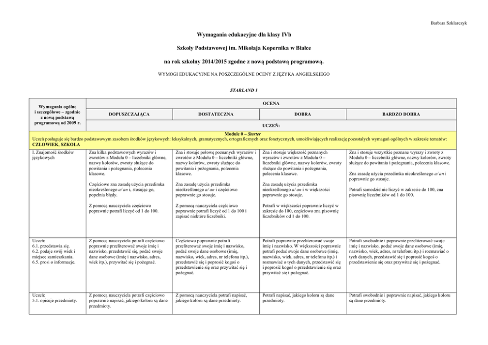 Barbara Szklarczyk Wymagania edukacyjne dla klasy IVb Szkoły Podstawowej im. Mikołaja Kopernika w Białce na rok szkolny 2014/2015 zgodne z nową podstawą programową. WYMOGI EDUKACYJNE NA POSZCZEGÓLNE OCENY Z JĘZYKA ANGIELSKIEGO STARLAND 1 Wymagania ogólne i szczegółowe – zgodnie z nową podstawą programową od 2009 r. OCENA DOPUSZCZAJĄCA DOSTATECZNA DOBRA BARDZO DOBRA UCZEŃ: Module 0 – Starter Uczeń posługuje się bardzo podstawowym zasobem środków językowych: leksykalnych, gramatycznych, ortograficznych oraz fonetycznych, umożliwiających realizację pozostałych wymagań ogólnych w zakresie tematów: CZŁOWIEK, SZKOŁA I. Znajomość środków językowych Zna kilka podstawowych wyrazów i zwrotów z Modułu 0 – liczebniki główne, nazwy kolorów, zwroty służące do powitania i pożegnania, polecenia klasowe. Zna i stosuje połowę poznanych wyrazów i zwrotów z Modułu 0 – liczebniki główne, nazwy kolorów, zwroty służące do powitania i pożegnania, polecenia klasowe. Zna i stosuje większość poznanych wyrazów i zwrotów z Modułu 0 – liczebniki główne, nazwy kolorów, zwroty służące do powitania i pożegnania, polecenia klasowe. Częściowo zna zasadę użycia przedimka nieokreślonego a/ an i, stosując go, popełnia błędy. Zna zasadę użycia przedimka nieokreślonego a/ an i częściowo poprawnie go stosuje. Zna zasadę użycia przedimka nieokreślonego a/ an i w większości poprawnie go stosuje. Z pomocą nauczyciela częściowo poprawnie potrafi liczyć od 1 do 100. Z pomocą nauczyciela częściowo poprawnie potrafi liczyć od 1 do 100 i zapisać niektóre liczebniki. Potrafi w większości poprawnie liczyć w zakresie do 100, częściowo zna pisownię liczebników od 1 do 100. Uczeń: 6.1. przedstawia się. 6.2. podaje swój wiek i miejsce zamieszkania. 6.5. prosi o informacje. Z pomocą nauczyciela potrafi częściowo poprawnie przeliterować swoje imię i nazwisko, przedstawić się, podać swoje dane osobowe (imię i nazwisko, adres, wiek itp.), przywitać się i pożegnać. Częściowo poprawnie potrafi przeliterować swoje imię i nazwisko, podać swoje dane osobowe (imię, nazwisko, wiek, adres, nr telefonu itp.), przedstawić się i poprosić kogoś o przedstawienie się oraz przywitać się i pożegnać. Potrafi poprawnie przeliterować swoje imię i nazwisko. W większości poprawnie potrafi podać swoje dane osobowe (imię, nazwisko, wiek, adres, nr telefonu itp.) i rozmawiać o tych danych, przedstawić się i poprosić kogoś o przedstawienie się oraz przywitać się i pożegnać. Potrafi swobodnie i poprawnie przeliterować swoje imię i nazwisko, podać swoje dane osobowe (imię, nazwisko, wiek, adres, nr telefonu itp.) i rozmawiać o tych danych, przedstawić się i poprosić kogoś o przedstawienie się oraz przywitać się i pożegnać. Uczeń: 5.1. opisuje przedmioty. Z pomocą nauczyciela potrafi częściowo poprawnie napisać, jakiego koloru są dane przedmioty. Z pomocą nauczyciela potrafi napisać, jakiego koloru są dane przedmioty. Potrafi napisać, jakiego koloru są dane przedmioty. Potrafi swobodnie i poprawnie napisać, jakiego koloru są dane przedmioty. Zna i stosuje wszystkie poznane wyrazy i zwroty z Modułu 0 – liczebniki główne, nazwy kolorów, zwroty służące do powitania i pożegnania, polecenia klasowe. Zna zasadę użycia przedimka nieokreślonego a/ an i poprawnie go stosuje. Potrafi samodzielnie liczyć w zakresie do 100, zna pisownię liczebników od 1 do 100. Barbara Szklarczyk Wymagania ogólne i szczegółowe – zgodnie z nową podstawą programową od 2009 r. OCENA DOPUSZCZAJĄCA DOSTATECZNA DOBRA BARDZO DOBRA UCZEŃ: Module 1 – School days Uczeń posługuje się bardzo podstawowym zasobem środków językowych: leksykalnych, gramatycznych, ortograficznych oraz fonetycznych, umożliwiających realizację pozostałych wymagań ogólnych w zakresie tematów: SZKOŁA, PODRÓŻOWANIE I TURYSTYKA, SPORT Zna kilka podstawowych wyrazów i Zna i stosuje połowę poznanych wyrazów i Zna i stosuje większość poznanych Zna i stosuje wszystkie poznane wyrazy i zwroty z UNITS 1a – 1c: I. Znajomość środków zwrotów z Modułu 1 – przedmioty zwrotów z Modułu 1 – przedmioty wyrazów i zwrotów z Modułu 1 – Modułu 1 – przedmioty szkolne, nazwy państw i językowych. szkolne, nazwy państw i narodowości, szkolne, nazwy państw i narodowości, przedmioty szkolne, nazwy państw i narodowości, dyscypliny sportowe. dyscypliny sportowe. dyscypliny sportowe. narodowości, dyscypliny sportowe. Poprawnie stosuje formy czasownika to be w mowie i Z pomocą nauczyciela potrafi częściowo Potrafi odmienić czasownik to be oraz W większości poprawnie stosuje formy piśmie w zdaniach twierdzących, przeczących i poprawnie odmienić czasownik to be i uzupełnić zdania jego odpowiednią formą. czasownika to be w mowie i piśmie w pytających. uzupełnić zdania jego odpowiednią formą. Poprawnie stosuje formy czasownika to be zdaniach twierdzących, przeczących i w zdaniach twierdzących. pytających. Zna i poprawnie stosuje zaimki osobowe w funkcji Zna niektóre zaimki osobowe w funkcji Zna zaimki osobowe w funkcji podmiotu i podmiotu i dopełnienia w mowie i piśmie. podmiotu i dopełnienia. Prawidłowo dopełnienia. Częściowo prawidłowo Zna zaimki osobowe w funkcji podmiotu i stosuje formy I oraz me. stosuje je w zdaniach. dopełnienia. W większości prawidłowo stosuje je w mowie i piśmie. Zna i poprawnie stosuje w mowie i piśmie zaimki Zna zaimki pytające who, what, where i Zna zaimki pytające who, what, where i pytające who, what, where i how old. how old. Z pomocą nauczyciela częściowo how old. Częściowo poprawnie tworzy Zna zaimki pytające who, what, where i potrafi utworzyć pytania. pytania. how old. W większości poprawnie tworzy pytania. Uczeń: 2.3. i 3.1. rozumie ogólny sens tekstu słuchanego i czytanego. 3.2. wyszukuje proste informacje szczegó
