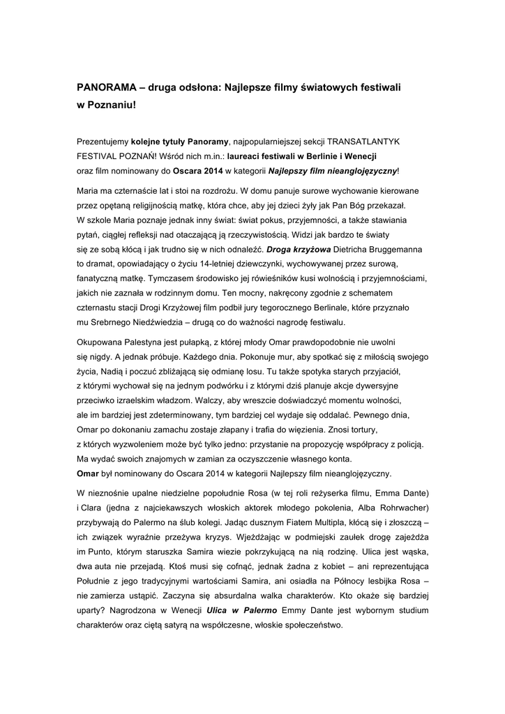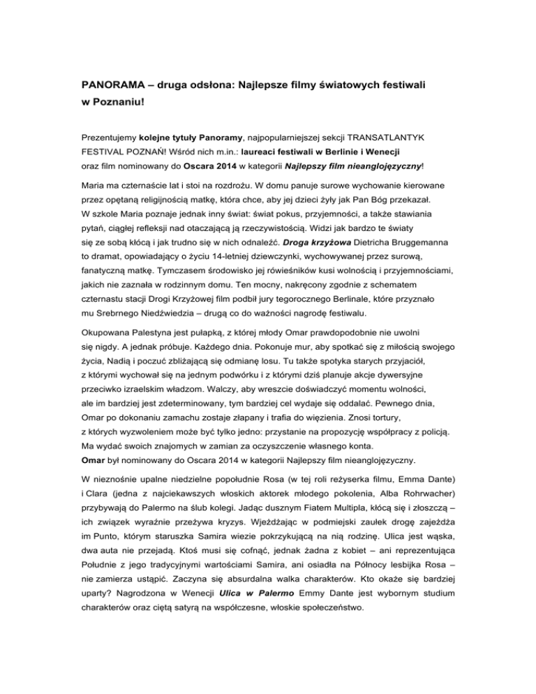PANORAMA – druga odsłona: Najlepsze filmy światowych festiwali w Poznaniu! Prezentujemy kolejne tytuły Panoramy, najpopularniejszej sekcji TRANSATLANTYK FESTIVAL POZNAŃ! Wśród nich m.in.: laureaci festiwali w Berlinie i Wenecji oraz film nominowany do Oscara 2014 w kategorii Najlepszy film nieanglojęzyczny! Maria ma czternaście lat i stoi na rozdrożu. W domu panuje surowe wychowanie kierowane przez opętaną religijnością matkę, która chce, aby jej dzieci żyły jak Pan Bóg przekazał. W szkole Maria poznaje jednak inny świat: świat pokus, przyjemności, a także stawiania pytań, ciągłej refleksji nad otaczającą ją rzeczywistością. Widzi jak bardzo te światy się ze sobą kłócą i jak trudno się w nich odnaleźć. Droga krzyżowa Dietricha Bruggemanna to dramat, opowiadający o życiu 14-letniej dziewczynki, wychowywanej przez surową, fanatyczną matkę. Tymczasem środowisko jej rówieśników kusi wolnością i przyjemnościami, jakich nie zaznała w rodzinnym domu. Ten mocny, nakręcony zgodnie z schematem czternastu stacji Drogi Krzyżowej film podbił jury tegorocznego Berlinale, które przyznało mu Srebrnego Niedźwiedzia – drugą co do ważności nagrodę festiwalu. Okupowana Palestyna jest pułapką, z której młody Omar prawdopodobnie nie uwolni się nigdy. A jednak próbuje. Każdego dnia. Pokonuje mur, aby spotkać się z miłością swojego życia, Nadią i poczuć zbliżającą się odmianę losu. Tu także spotyka starych przyjaciół, z którymi wychował się na jednym podwórku i z którymi dziś planuje akcje dywersyjne przeciwko izraelskim władzom. Walczy, aby wreszcie doświadczyć momentu wolności, ale im bardziej jest zdeterminowany, tym bardziej cel wydaje się oddalać. Pewnego dnia, Omar po dokonaniu zamachu zostaje złapany i trafia do więzienia. Znosi tortury, z których wyzwoleniem może być tylko jedno: przystanie na propozycję współpracy z policją. Ma wydać swoich znajomych w zamian za oczyszczenie własnego konta. Omar był nominowany do Oscara 2014 w kategorii Najlepszy film nieanglojęzyczny. W nieznośnie upalne niedzielne popołudnie Rosa (w tej roli reżyserka filmu, Emma Dante) i Clara (jedna z najciekawszych włoskich aktorek młodego pokolenia, Alba Rohrwacher) przybywają do Palermo na ślub kolegi. Jadąc dusznym Fiatem Multipla, kłócą się i złoszczą – ich związek wyraźnie przeżywa kryzys. Wjeżdżając w podmiejski zaułek drogę zajeżdża im Punto, którym staruszka Samira wiezie pokrzykującą na nią rodzinę. Ulica jest wąska, dwa auta nie przejadą. Ktoś musi się cofnąć, jednak żadna z kobiet – ani reprezentująca Południe z jego tradycyjnymi wartościami Samira, ani osiadła na Północy lesbijka Rosa – nie zamierza ustąpić. Zaczyna się absurdalna walka charakterów. Kto okaże się bardziej uparty? Nagrodzona w Wenecji Ulica w Palermo Emmy Dante jest wybornym studium charakterów oraz ciętą satyrą na współczesne, włoskie społeczeństwo. Film drogi? Kino o dojrzewaniu? A może brutalny dramat? Wszystko naraz! Juan, Sara i Chauk mają po kilkanaście lat, odwagę, spryt i świadomość, że w ojczyźnie nie mają żadnych perspektyw przetrwania. Postanawiają dłużej nie czekać, aż pochłonie ich gwatemalskie piekło, w którym przyszło im się urodzić i planują nielegalnie przedostać się do Stanów Zjednoczonych. Choć historia wydaje się jedną z tych, które wielokrotnie widzieliśmy, to „Złota klatka” wcale nie stara się wkraść do naszego serca drogą na skróty. Nie ma tu eksponowania nędzy życia dzieci w ich ojczyźnie, nie ma młodocianych ludzi zdanych na los. Jest perfekcyjny plan ucieczki, który zderza się z surową rzeczywistością. Szwajcarski film "Rosie" (reż. Marcel Gisler) opowiada o wszelkich chyba odcieniach miłości. Oto młody Lorenzo powraca do rodzinnego domu, zamieszkałego przez niestabilną psychicznie siostrę i matkę alkoholiczkę. Czuje się dorosłym człowiekiem, lecz stopniowo zauważa, że jego osobowość nie jest wcale w pełni ukształtowana. Kiedy bezradnie poszukuje stabilizacji, w jego otoczeniu pojawia się pewien fascynujący mężczyzna. Wraz z lekcją życia w rodzinie, w której trzeba sobie radzić z nieprzewidywalnością jej członków, pojawia się w codzienności Lorenza Mario, mężczyzna, który staje się dla niego kimś więcej niż przygodą na jedną noc. To wnosi w rzeczywistość mężczyzny wiele napięć, a przede wszystkim przerażenie przez zmianami, które go czekają i przyszłością, która teraz nie jest już pod jego kontrolą. Festiwal odbędzie się w dniach 8 - 14 sierpnia w Poznaniu i w Rozbitku. Kolejne filmowe sekcje tegorocznej edycji przedstawimy już wkrótce.