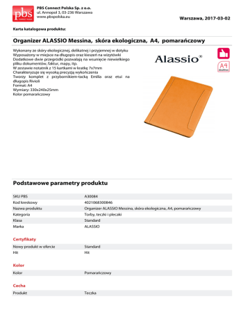 PBS Connect Polska Sp. z o.o. ul. Annopol 3, 03-236 Warszawa www.pbspolska.eu Warszawa, 2017-03-02 Karta katalogowa produktu: Organizer ALASSIO Messina, skóra ekologiczna, A4, pomarańczowy Wykonany ze skóry ekologicznej, delikatnej i przyjemnej w dotyku Wyposażony w miejsce na długopis oraz kieszeń na wizytówki Dodatkowe dwie przegródki pozwalają na wsunięcie niewielkiego pliku dokumentów, faktur, mapy, itp. W zestawie notatnik z 15 kartkami w kratkę 7x7mm Charakteryzuje się wysoką precyzją wykończenia Tworzy komplet z przybornikiem-tacką Emilia oraz etui na długopis Rivioli Format: A4 Wymiary: 330x240x25mm Kolor pomarańczowy Podstawowe parametry produktu SKU PBS A30084 Kod kreskowy 4021068300846 Nazwa produktu Organizer ALASSIO Messina, skóra ekologiczna, A4, pomarańczowy Kategoria Torby, teczki i plecaki Klasa Standard Marka ALASSIO Certyfikaty Nowy produkt w ofercie Standard Hit Hit Kolor Kolor Pomarańczowy Cecha Produkt Teczka PBS Connect Polska Sp. z o.o. ul. Annopol 3, 03-236 Warszawa www.pbspolska.eu Warszawa, 2017-03-02 Karta katalogowa produktu cd. Organizer ALASSIO Messina, skóra ekologiczna, A4, pomarańczowy Podstawowe parametry produktu Typ Organizer Kieszenie Na wizytówki Materiał Ekoskóra Przegrody 1 W ofercie od 2013-01 Wymiary Wymiary (mm) 330x240x25 Format A4 Wspólny słownik zamówień CPV 22817000-0 Terminarze lub organizery osobiste