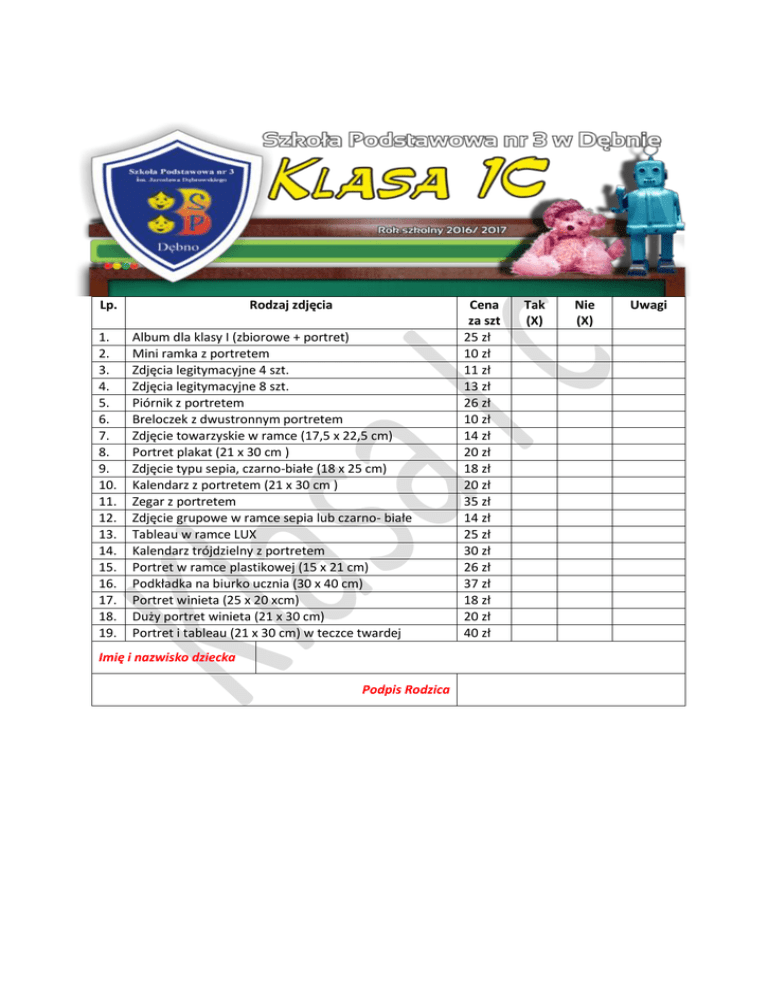Lp. 1. 2. 3. 4. 5. 6. 7. 8. 9. 10. 11. 12. 13. 14. 15. 16. 17. 18. 19. Rodzaj zdjęcia Album dla klasy I (zbiorowe + portret) Mini ramka z portretem Zdjęcia legitymacyjne 4 szt. Zdjęcia legitymacyjne 8 szt. Piórnik z portretem Breloczek z dwustronnym portretem Zdjęcie towarzyskie w ramce (17,5 x 22,5 cm) Portret plakat (21 x 30 cm ) Zdjęcie typu sepia, czarno-białe (18 x 25 cm) Kalendarz z portretem (21 x 30 cm ) Zegar z portretem Zdjęcie grupowe w ramce sepia lub czarno- białe Tableau w ramce LUX Kalendarz trójdzielny z portretem Portret w ramce plastikowej (15 x 21 cm) Podkładka na biurko ucznia (30 x 40 cm) Portret winieta (25 x 20 xcm) Duży portret winieta (21 x 30 cm) Portret i tableau (21 x 30 cm) w teczce twardej Imię i nazwisko dziecka Podpis Rodzica Cena za szt 25 zł 10 zł 11 zł 13 zł 26 zł 10 zł 14 zł 20 zł 18 zł 20 zł 35 zł 14 zł 25 zł 30 zł 26 zł 37 zł 18 zł 20 zł 40 zł Tak (X) Nie (X) Uwagi
