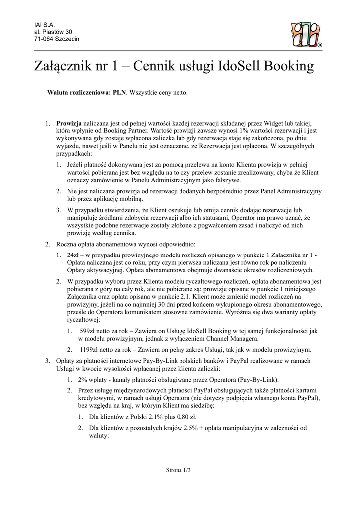 IAI S.A. al. Piastów 30 71-064 Szczecin Załącznik nr 1 – Cennik usługi IdoSell Booking Waluta rozliczeniowa: PLN. Wszystkie ceny netto. 1. Prowizja naliczana jest od pełnej wartości każdej rezerwacji składanej przez Widget lub takiej, która wpłynie od Booking Partner. Wartość prowizji zawsze wynosi 1% wartości rezerwacji i jest wykonywana gdy zostaje wpłacona zaliczka lub gdy rezerwacja staje się zakończona, po dniu wyjazdu, nawet jeśli w Panelu nie jest oznaczone, że Rezerwacja jest opłacona. W szczególnych przypadkach: 1. Jeżeli płatność dokonywana jest za pomocą przelewu na konto Klienta prowizja w pełniej wartości pobierana jest bez względu na to czy przelew zostanie zrealizowany, chyba że Klient oznaczy zamówienie w Panelu Administracyjnym jako fałszywe. 2. Nie jest naliczana prowizja od rezerwacji dodanych bezpośrednio przez Panel Administracyjny lub przez aplikację mobilną. 3. W przypadku stwierdzenia, że Klient oszukuje lub omija cennik dodając rezerwacje lub manipuluje źródłami zdobycia rezerwacji albo ich statusami, Operator ma prawo uznać, że wszystkie podobne rezerwacje zostały złożone z pogwałceniem zasad i naliczyć od nich prowizję według cennika. 2. Roczna opłata abonamentowa wynosi odpowiednio: 1. 24zł – w przypadku prowizyjnego modelu rozliczeń opisanego w punkcie 1 Załącznika nr 1 Opłata naliczana jest co roku, przy czym pierwsza naliczana jest równo rok po naliczeniu Opłaty aktywacyjnej. Opłata abonamentowa obejmuje dwanaście okresów rozliczeniowych. 2. W przypadku wyboru przez Klienta modelu ryczałtowego rozliczeń, opłata abonamentowa jest pobierana z góry na cały rok, ale nie pobierane są: prowizje opisane w punkcie 1 niniejszego Załącznika oraz opłata opisana w punkcie 2.1. Klient może zmienić model rozliczeń na prowizyjny, jeżeli na co najmniej 30 dni przed końcem wykupionego okresu abonamentowego, prześle do Operatora komunikatem stosowne zamówienie. Wyróżnia się dwa warianty opłaty ryczałtowej: 1. 599zł netto za rok – Zawiera on Usługę IdoSell Booking w tej samej funkcjonalności jak w modelu prowizyjnym, jednak z wyłączeniem Channel Managera. 2. 1199zł netto za rok – Zawiera on pełny zakres Usługi, tak jak w modelu prowizyjnym. 3. Opłaty za płatności internetowe Pay-By-Link polskich banków i PayPal realizowane w ramach Usługi w kwocie wysokości wpłacanej przez klienta zaliczki: 1. 2% wpłaty - kanały płatności obsługiwane przez Operatora (Pay-By-Link). 2. Przez usługę międzynarodowych płatności PayPal obsługujących także płatności kartami kredytowymi, w ramach usługi Operatora (nie dotyczy podpięcia własnego konta PayPal), bez względu na kraj, w którym Klient ma siedzibę: 1. Dla klientów z Polski 2.1% plus 0,80 zł. 2. Dla klientów z pozostałych krajów 2.5% + opłata manipulacyjna w zależności od waluty: Strona 1/3 IAI S.A. al. Piastów 30 71-064 Szczecin Nazwa waluty Kwota Argentine Peso: 2.00 ARS Australian Dollar: $0.30 AUD Brazilian Real: R$0.60 BRL Canadian Dollar: $0.30 CAD Czech Koruna: 10.00 CZK Danish Kroner: 2.60 DKK Euro: €0.35 EUR Hong Kong Dollar: $2.35 HKD Hungarian Forint: 90.00 HUF Israeli New Shekel: 1.20 ILS Japanese Yen: ¥40.00 JPY Malaysian Ringgit: 2.00 MYR Mexican Peso: 4.00 MXN New Zealand Dollar: $0.45 NZD Norwegian Krone: 2.80 NOK Philippine Peso: 15.00 PHP Polish Zloty: 0.80 PLN Russian Ruble: 10.00 RUB Singapore Dollar: $0.50 SGD Swedish Krona: 3.25 SEK Swiss Franc: 0.55 CHF New Taiwan Dollar: $10.00 TWD Thai Baht: 11.00 THB Turkish Lira: 0.45 TRY U.K. Pounds Sterling: £0.20 GBP U.S. Dollar: $0.30 USD Strona 2/3 IAI S.A. al. Piastów 30 71-064 Szczecin 4. Prowizja Booking Partner - według jej cennika – Prowizja naliczana przez pośrednika w zdobyciu zamówienia po wcześniejszej akceptacji przez Klienta wysokości dodatkowej prowizji dla danego serwisu. 5. Opłata aktywacyjna – 24zł Pobierana jednorazowo po zakończeniu okresu rozruchowego. 6. Cesja – 25zł 7. Kompleksowa konfiguracja usługi – 250zł Obejmuje wprowadzenie w imieniu i na zlecenie Klienta stosownych ustawień w Panelu Administracyjnym uwzględniają możliwości Usługi, opisów miejsc noclegowych w języku polskim na podstawie dostarczonych przez Klienta informacji, konfigurację strony Wizytówki oraz zamieszczenie przycisku rezerwacji na stronie internetowej Klienta i fanpage'u na portalu Facebook.com (po dostarczeniu odpowiednich danych do logowania się na stronie internetowej i Facebook.com). 8. Zwrot nadpłaty salda – 20zł - Istnieje możliwość dokonania nadwyżki Salda. Opłata zawiera koszty manipulacyjne operacji wystawienia i wysłania faktury korygującej, a po jej odesłaniu wykonania przelewu na wskazane przez klienta konto bankowe prowadzone w polskim banku lub przez system płatności internetowych w którym odbiorca płatności ponosi koszt opłaty prowizyjnej. 9. Przesyłka listowa na terenie Europy– 15zł Obejmuje wysłanie dowolnej przesyłki do Klienta, w postaci materialnej np. papierowy duplikat faktury o wadze do 350 gram w przypadku gdy Klientowi nie wystarczy dokument dostarczony elektronicznie z kwalifikowanym podpisem cyfrowym. Koszt obejmuje wysłanie przesyłki listem poleconym na terytorium Europy (łącznie z Cyprem, całej Rosji i Izraela). 10. Opłata za wypłatę środków zgromadzonych w BOK na wskazany rachunek bankowy prowadzony w Polsce– 1zł 11. Opłata za transfer środków zgromadzonych w BOK na Saldo – 0zł 12. Opłata za wpłatę na Saldo rozliczeń z IAI z wykorzystaniem natychmiastowych płatności PayPal – zgodna z prowizją pobieraną przez PayPal Inc. Opłata naliczana, gdy Klient zdecyduje się na wpłatę na Saldo rozliczeń z IAI S.A. zamiast w postaci przelewu bankowego, systemem płatności elektronicznych z natychmiastowym księgowaniem wpłat PayPal. Opłata przerzucona na płacącego poprzez odjęcie środków od Salda w odrębnej transakcji od zasilenia. 13. O