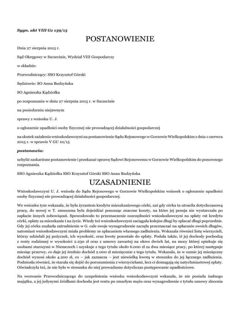 Sygn. akt VIII Gz 139/15 POSTANOWIENIE Dnia 27 sierpnia 2015 r. Sąd Okręgowy w Szczecinie, Wydział VIII Gospodarczy w składzie: Przewodniczący: SSO Krzysztof Górski Sędziowie: SO Anna Budzyńska SO Agnieszka Kądziołka po rozpoznaniu w dniu 27 sierpnia 2015 r. w Szczecinie na posiedzeniu niejawnym sprawy z wniosku U. J. o ogłoszenie upadłości osoby fizycznej nie prowadzącej działalności gospodarczej na skutek zażalenia wnioskodawczyni na postanowienie Sądu Rejonowego w Gorzowie Wielkopolskim z dnia 1 czerwca 2015 r. w sprawie V GU 10/15 postanawia: uchylić zaskarżone postanowienie i przekazać sprawę Sądowi Rejonowemu w Gorzowie Wielkopolskim do ponownego rozpoznania. SSO Agnieszka Kądziołka SSO Krzysztof Górski SSO Anna Budzyńska UZASADNIENIE Wnioskodawczyni U. J. wniosła do Sądu Rejonowego w Gorzowie Wielkopolskim wniosek o ogłoszenie upadłości osoby fizycznej nie prowadzącej działalności gospodarczej. We wniosku tym wskazała, że była żyrantem kredytu mieszkaniowego córki, zaś gdy córka ta utraciła dotychczasową pracę, do nowej w T. zmuszona była dojeżdżać ponosząc znaczne koszty, na które jej pensja nie wystarczała po zapłacie innych zobowiązań. Spowodowało to przeznaczenie oszczędności wnioskodawczyni na spłaty rat kredytu córki, opłaty za mieszkanie i na życie. Wtedy też wnioskodawczyni zaciągała kolejne długi by spłacać długi poprzednie. Gdy jej córka znalazła zatrudnienie w G. całe swoje wynagrodzenie zaczęła przeznaczać na spłacanie swoich długów, natomiast wnioskodawczyni miała problemy ze spłacaniem własnego zadłużenia. Wskazała również listę wierzycieli, którzy udzielali jej pożyczek, ich wysokość, oraz kwoty pozostałe do spłaty. Podała także, iż jej dochody pochodzą z renty rodzinnej w wysokości 2.230 zł oraz z umowy zawartej na okres dwóch lat, na mocy której opiekuje się osobami starszymi w Niemczech i uzyskuje z tego tytułu około 6.000 zł za dwa miesiące pracy, po której następuje miesiąc przerwy, co daje jej średnio dochód 2.000 zł miesięcznie z tego tytułu. Wskazała, że w sumie jej miesięczny dochód wynosi około 4.200 zł, co – jak zaznacza – jest niewielką kwotą w stosunku do jej łącznego zadłużenia. Podniosła również, że starała się dojść do porozumienia z wierzycielami, lecz ci domagają się natychmiastowej spłaty. Oświadczyła też, że nie było w stosunku do niej prowadzone dotychczas postępowanie upadłościowe. Na wezwanie Przewodniczącego do uzupełnienia wniosku wnioskodawczyni wskazała, że nie posiada żadnego majątku, a jej jedynymi źródłami dochodu jest renta po zmarłym mężu oraz wynagrodzenie z tytułu umowy zlecenia wykonywanej na terenie Niemiec. Jako dowód na wysokość renty przedłożyła decyzję o waloryzacji wojskowej renty rodzinnej oraz umowę zlecenia. Przedłożyła również deklarację podatkową PIT. Wskazała nadto, iż nie posiada żadnych spornych wierzytelności, ani listy zabezpieczeń na jej majątku, wskazała że hipoteka jest ustanowiona na mieszkaniu jej córki, zaś ona jedynie jest poręczycielem. Poinformowała również, że nie ma wystawionych przeciwko niej nakazów zapłaty i innych tytułów egzekucyjnych i wykonawczych przeciwko niej. Nic jej również nie wiadomo o tym, aby toczyły się przeciwko niej postępowania sądowe. Wskazała również, że raty spłaty wierzycieli może uiszczać do 5. dnia każdego miesiąca. Postanowieniem z dnia 1 czerwca 2015 r. Sąd Rejonowy w Gorzowie Wielkopolskim w sprawie V GU 10/15 oddalił wniosek U. J. o ogłoszenie upadłości w stosunku do osoby fizycznej nieprowadzącej działalności gospodarczej. W uzasadnieniu postanowienia Sąd Rejonowy wskazał, że wnioskodawczyni spełnia przesłanki podmiotowe wskazane w art. 4914 ust. 1 ustawy z dnia 28 lutego 2003 r. prawo upadłościowe i naprawcze (Dz. U. z 2015 r., poz. 233) [dalej p.u.n.], tj. jest osobą fizyczną nie prowadzącą działalności gospodarczej i jej upadłości nie można ogłosić zgodnie z przepisami działu II tytułu I części pierwszej p.u.n. Sąd Rejonowy wskazał nadto, że dowody załączone do wniosku potwierdzają, iż wnioskodawczyni ma wymagalne zobowiązania pieniężne, natomiast z jej oświadczenia wynika, że zobowiązania te nie są obecnie regulowane – U. J. jest zatem niewypłacalna w rozumieniu przepisów p.u.n. Jednocześnie Sąd pierwszej instancji wskazał, że w jego ocenie zobowiązania wnioskodawczyni powstały wskutek jej rażącego niedbalstwa (jej niewypłacalność powstała wskutek zależnych od dłużniczki zdarzeń – wpadła w tzw. „spiralę kredytową” spłacając jedne kredyty poprzez zaciąganie drugich), a dane podane we wniosku są niezupełne (nie wskazała miejsc, w których znajduje się jej majątek, ani nie podała gdzie zamieszkuje). Sąd Rejonowy zauważył nadto, że dłużniczka pracuje, a nadto otrzymuje rentę rodzinną, co pozwala uzyskać dochód około 4.740 zł miesięcznie, który pozwala na spłatę części zobowiązań „od ręki”. Sąd pierwszej instancji zwrócił również uwagę, że dłużniczka nie przedstawiła planu spłaty wierzycieli, a jedynie wskazała, że zobowiązania mogłaby spłacać do każdego 5. miesiąca, ale nie podała w jakiej wysokości i jak długo miałaby taka spłata potrwać. Wnioskodawczyni złożyła zażalenie zaskarżając w całości wskazane wyżej postanowienie Sądu Rejonowego w Gorzowie Wielkopolskim. W treści zażalenia podniosła, że jej niewypłacalność powstała wskutek zdarzeń od niej niezależnych, w tym choroby córki i jej rehabilitacji. Podniosła nadto, że otrzymywana przez nią renta wynosi nie 2.700 zł ale 2.259 zł; jej praca w Niemczech to praca po półtora miesiąca, po którym następuje półtora miesiąca, gdy przebywa w Polsce i nie pracuje, niekiedy tylko pracuje przez dwa miesiące, a zatem otrzymywane przez nią wynagrodzenie w wysokoś