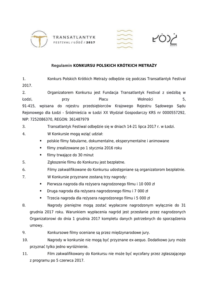 Regulamin KONKURSU POLSKICH KRÓTKICH METRAŻY 1. Konkurs Polskich Krótkich Metraży odbędzie się podczas Transatlantyk Festival 2017. 2. Organizatorem Konkursu jest Fundacja Transatlantyk Festival z siedzibą w Łodzi, 91-415, przy wpisana do rejestru Placu przedsiębiorców Krajowego Wolności Rejestru 5, Sądowego Sądu Rejonowego dla Łodzi - Śródmieścia w Łodzi XX Wydział Gospodarczy KRS nr 0000557292, NIP: 7252086370, REGON: 361487979 3. Transatlantyk Festiwal odbędzie się w dniach 14-21 lipca 2017 r. w Łodzi. 4. W Konkursie mogą wziąć udział: polskie filmy fabularne, dokumentalne, eksperymentalne i animowane filmy zrealizowane po 1 stycznia 2016 roku filmy trwające do 30 minut 5. Zgłoszenie filmu do Konkursu jest bezpłatne. 6. Filmy zakwalifikowane do Konkursu udostępniane są organizatorom bezpłatnie. 7. W Konkursie przyznane zostaną trzy nagrody: Pierwsza nagroda dla reżysera nagrodzonego filmu i 10 000 zł Druga nagroda dla reżysera nagrodzonego filmu i 7 000 zł Trzecia nagroda dla reżysera nagrodzonego filmu i 5 000 zł 8. Nagrody pieniężne mogą zostać wypłacone nagrodzonym wyłącznie do 31 grudnia 2017 roku. Warunkiem wypłacenia nagród jest przesłanie przez nagrodzonych Organizatorowi do dnia 1 grudnia 2017 kompletu danych potrzebnych do sporządzenia umowy. 9. Konkursowe filmy oceniane są przez międzynarodowe jury. 10. Nagrody w konkursie nie mogą być przyznane ex-aequo. Dodatkowo jury może przyznać tylko jedno wyróżnienie. 11. Film zakwalifikowany do Konkursu nie może być wycofany przez zgłaszającego z programu po 5 czerwca 2017. 12. Ostateczny termin nadsyłania zgłoszeń upływa 24 marca 2017 roku. 13. W wyjątkowych przypadkach organizator może odstąpić od wymogów regulaminowych. 14. Warunkiem dopuszczenia do selekcji jest nadesłanie w terminie filmu (preferowany link vimeo lub youtube do filmu, możliwe też dvd) wraz z kompletnie wypełnionym formularzem zgłoszeniowym oraz zestawem obowiązkowych załączników (wśród nich streszczenie filmu, fotosy z filmu, biografię, filmografię i zdjęcie reżysera oraz podstawową listę osób zaangażowanych w produkcję filmu). Drogą mailową materiały należy przesłać na adres: [email protected]. 15. W czasie trwania selekcji hasła do linków nie mogą być zmieniane. Zmiana hasła w trakcie trwania selekcji będzie oznaczała rezygnację przez zgłaszającego z udziału w Konkursie i pominięcie filmu w selekcji konkursowej. 16. O wynikach selekcji zgłaszający zostaną poinformowani mailowo nie później niż 40 dni przed rozpoczęciem Transatlantyk Festival. 17. Organizator nie jest zobligowany do uzasadnienia swoich decyzji selekcyjnych. 18. Nie jest możliwe odwoływanie się od decyzji selekcyjnych. 19. Organizator nie zwraca materiałów (w tym DVD) otrzymanych do selekcji. 20. Każdy z filmów zakwalifikowanych do Konkursu zostanie pokazany na Festiwalu nie więcej niż 3 razy. 21. Terminy pokazów filmu na Festiwalu wyznacza organizator. 22. Filmy w Konkursie mogą być wyświetlane na następujących nośnikach: DCP, Blu-ray. Filmy na innych nośnikach mogą być pokazane wyłącznie po uzyskaniu zgody organizatora. 23. Filmy w Konkursie prezentowane są w oryginalnej wersji językowej z angielskimi (i polskimi, jeśli oryginalna wersja językowa nie jest wersją polską) napisami. Organizator preferuje kopie z angielskimi napisami. Jeżeli taka kopia nie istnieje, zgłaszający zobowiązany jest udostępnić organizatorowi oryginalną listę dialogową, listę angielskich napisów oraz link do filmu lub DVD z angielskimi napisami. 24. Organizator zachęca także do nadsyłania materiałów promocyjnych (plakaty, ulotki, trailery, etc.) zakwalifikowanych do Konkursu filmów. 25. Organizator zastrzega sobie prawo do użycia fragmentów zakwalifikowanych filmów (nie dłuższych niż 3 minuty), a także do umieszczenia informacji o filmie na stronie internetowej Festiwalu oraz we wszystkich innych publikacjach promocyjnych Festiwalu (w tym katalog, program, informacje prasowe, itp.). 26. Organizator może w celach promocyjnych udostępnić mediom (w tym stacjom telewizyjnym oraz portalom internetowym) posiadane materiały o filmie (w tym zdjęcia i fragmenty). 27. Organizator zastrzega sobie prawo do korzystania z materiałów promocyjnych zarówno podczas, jak i po zakończeniu Festiwalu. 28. Kopie zakwalifikowanych do Konkursu filmów powinny zostać dostarczone najpóźniej do 1 lipca 2017 roku na adres: Fundacja Transatlantyk Festival, Plac Wolności 5, 91-415 Łódź. 29. Koszty transportu kopii pokazowych na Festiwal, jeśli nie ustalono inaczej, ponosi zgłaszający. Po Festiwalu kopie filmów odesłane zostaną na wskazany przez zgłaszającego adres na koszt organizatora. Adres, na jaki powinien zostać odesłany film, musi zostać przesłany organizatorowi najpóźniej w dniu rozpoczęcia Festiwalu. 30. Wszystkie filmy prezentowane na Festiwalu zostaną odesłane najpóźniej do 10 sierpnia 2017 roku, pod warunkiem dostarczenia w terminie adresu zwrotnego przez zgłaszającego. 31. Wszystkie kopie filmów prezentowanych na Festiwalu są ubezpieczone przez organizatora od kradzieży, zniszczenia i odpowiedzialności cywilnej od momentu dostarczenia ich do biura Festiwalu do momentu przekazania ich kurierowi w celu odesłania. 32. Odpowiedzialność organizatora za uszkodzenie lub zagubienie kopii jest ograniczona do kosztu wykonania nowej kopii według obowiązujących stawek laboratoryjnych (kopia standardowa). 33. Uszkodzenie kopii filmowej musi być zgłoszone do biura Festiwalu na piśmie w ciągu miesiąca od daty jej zwrotu lub przed następnym pokazem na kolejnym festiwalu (ale nie później niż nastąpi wysyłka niniejszej kopii na kolejny festiwal). 34. Do Konkursu mogą zostać zgłoszone filmy, do których zgłaszający dysponuje prawami, w tym prawami autorskimi i prawami pokrewnymi, umożliwiającymi zgłoszenie filmu na Festiwal oraz w