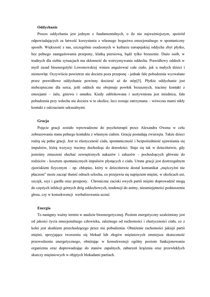 Oddychanie Proces oddychania jest jednym z fundamentalnych, o ile nie najważniejszym, spośród odpowiadających za łatwość korzystania z własnego bogactwa emocjonalnego w spontaniczny sposób. Większość z nas, szczególnie osadzonych w kulturze europejskiej oddycha zbyt płytko, bez pełnego zaangażowania przepony, klatką piersiową, bądź tylko brzusznie. Dużo osób, w trudnych dla siebie sytuacjach ma skłonność do wstrzymywania oddechu. Prawidłowy oddech w myśl zasad bioenergetyki Lowenowskiej winien angażować całe ciało, jak u małych dzieci i niemowląt. Oczywiście powietrze nie dociera poza przeponę - jednak fale pobudzenia wyzwalane przez prawidłowe oddychanie powinny docierać aż do stóp[5]. Płytkie oddychanie jest niebezpieczne dla serca, jeśli oddech nie obejmuje powłok brzusznych, tracimy kontakt z emocjami – żalu, gniewu i smutku. Kiedy zablokowana i usztywniona jest miednica, fala pobudzenia przy wdechu nie dociera w te okolice, lecz zostaje zatrzymana – wówczas mami nikły kontakt z odczuciami seksualnymi. Gracja Pojęcie gracji zostało wprowadzone do psychoterapii przez Alexandra Owena w celu zobrazowania stanu pełnego kontaktu z własnym ciałem. Grację posiadają zwierzęta. Także dzieci rodzą się pełne gracji. Jest to elastyczność ciała, spontaniczność i bezpośredniość ujawniania się impulsów, którą wszyscy tracimy dochodząc do dorosłości. Staje się tak w dzieciństwie, gdy jesteśmy zmuszeni słuchać zewnętrznych nakazów i zakazów - pochodzących głównie do rodziców - kosztem spontanicznych impulsów płynących z ciała. Utrata gracji jest dostrzegalnym zjawiskiem fizycznym – np. chłopiec, który w dzieciństwie dostał komunikat „mężczyźni nie płaczom” może zacząć tłumić odruch szlochu, co przejawia się napięciem mięśni, w okolicach ust, szczęk, szyi i gardła oraz przepony. Chroniczne zaciski owych partii mięśni doprowadzić mogą do częstych infekcji górnych dróg oddechowych, tendencji do astmy, nieumiejętności podnoszenia głosu, czy w konsekwencji werbalizowania uczuć. Energia To następny ważny termin w analizie bioenergetycznej. Poziom energetyczny uzależniony jest od jakości życia emocjonalnego człowieka, zależnego od ruchomości i elastyczności ciała, co z kolei jest skutkiem przechodzącego przez nie pobudzenia. Obniżenie ruchomości jakiejś partii mięśni, sprzyjające tworzeniu się blokad lub złogów mięśniowych zmniejsza skuteczność przewodzenia energetycznego, obniżając w konsekwencji ogólny poziom funkcjonowania organizmu oraz doprowadzając do stanów zapalnych, zaburzeń krążenia oraz przewlekłych skurczy mięśniowych w objętych blokadami partiach. Ugruntowanie (grounding) Ugruntowanie to następne ważne pojęcie analizy bioenergetycznej. Opisuje ono jakość połączenia jednostki z ziemią. Chodzi tutaj ściśle o poczucie tożsamości, określenie siebie w otaczającym świecie, stosunku do rzeczywistości. Pewne, pełne stanie na własnych nogach, niezależnie od okoliczności – daje możliwość kontaktu ze swoimi uczuciami, obiektywnymi realiami, innymi ludźmi. Mocne ugruntowanie to także umiejętność opierania się naciskom z zewnątrz. Jednostka dobrze ugruntowana jest elastyczna i sprężysta w ruchach, również elastyczna i potrafiąca reagować w dojrzały sposób, z głęboką znajomością siebie i swoich potrzeb. Brak należytego ugruntowania wiąże się z bazalnym zaburzeniem poczucia bezpieczeństwa, pierwotnie w relacji z osobą znaczącą (matką). Fizycznie odczuwane jest wtedy zmniejszenie czucia w stopach i łydkach (zaburzenie krążenia, męczliwość), blokowanie i usztywnianie kolan. Brak poczucia bezpieczeństwa może być maskowany – rozwija się wtedy nadmierna muskulatura, kolana są lekko ugięte – jak w pozycji ataku u boksera. Stres zgodnie z zasadami dostosowania ciała do grawitacji przenosi się wtedy na dolne partie kręgosłupa, doprowadzając do bólu tej okolicy. Ugruntowanie przyrównywane jest przez Lowena do ukorzenienia drzewa lub uziemienia przewodu elektrycznego. Depresja To najczęstsza przypadłość z którą borykają się obecnie ludzie kultury zachodu. Wśród jej objawów wymienić można: obniżony nastrój, spowolnienie psycho- ruchowe, apatię, niski poziom energii, zaburzenia oddychania. Analiza bioenergetyczna poszukuje wytłumaczenia depresji w niezaspokojeniu przez matkę potrzeb dziecka, we wczesnym dzieciństwie, co dziecko odebrać może jako utratę jej miłości. Matka interpretuje potrzeby dziecka, zamiast patrzeć i słuchać, reaguje automatycznie, standardowo. Skomplikowanie tej znaczącej więzi wynika z tego, że matka nie chce, bądź nie potrafi widzieć dziecka jako odrębnej osoby, traktuje je przedmiotowo dla zaspokojenia własnych potrzeb. Dziecko zależne emocjonalnie od matki traci poczucie bezpieczeństwa także wtedy, gdy reaguje ona nieadekwatnie na jego komunikaty. Odczucie utraty miłości znaczącego dorosłego manifestuje się jako chroniczny ucisk w piersi, skurczenie się i „opancerzenie” klatki piersiowej (sztywnienie mięśni, zmniejszenie elastyczności przepony). W dorosłym życiu próby uzyskania miłości, władzy, sukcesu, czy uznania (jako rekompensaty za utratę znaczącego obiektu) wiążą się ze zwiększeniem aktywności, nagłą euforią, staraniem się – przy błędnym założeniu, że na miłość trzeba zasłużyć. Lowen widział powiązanie między takim zwiększeniem aktywności i nadmiarem starań – a wzorem zachowania typu A( typ zachowań zdrowotnych A – duża ambicja, rywalizacyjność, życie bardzo szybkim tempem- cechy zachowania jednocześnie kojarzone z pewnymi chorobami – zaburzeniami krążenia – zawałami, nadciśnieniem i wrzodami żołądka lub dwunastnicy).