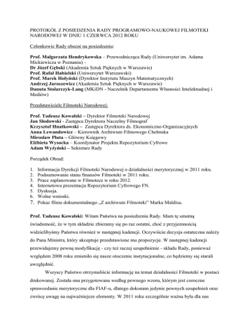 PROTOKÓŁ Z POSIEDZENIA RADY PROGRAMOWO-NAUKOWEJ FILMOTEKI NARODOWEJ W DNIU 1 CZERWCA 2012 ROKU Członkowie Rady obecni na posiedzeniu: Prof. Małgorzata Hendrykowska – Przewodnicząca Rady (Uniwersytet im. Adama Mickiewicza w Poznaniu) Dr Józef Gębski (Akademia Sztuk Pięknych w Warszawie) Prof. Rafał Habielski (Uniwersytet Warszawski) Prof. Marek Hołyński (Dyrektor Instytutu Maszyn Matematycznych) Andrzej Jaroszewicz (Akademia Sztuk Pięknych w Warszawie) Danuta Stolarczyk-Lang (MKiDN - Naczelnik Departamentu Własności Intelektualnej i Mediów) Przedstawiciele Filmoteki Narodowej: Prof. Tadeusz Kowalski – Dyrektor Filmoteki Narodowej Jan Słodowski - Zastępca Dyrektora Naczelny Filmograf Krzysztof Hnatkowski – Zastępca Dyrektora ds. Ekonomiczno-Organizacyjnych Anna Lewandowicz – Kierownik Archiwum Filmowego Chełmska Mirosław Pluta – Główny Księgowy Elżbieta Wysocka – Koordynator Projektu Repozytorium Cyfrowe Adam Wyżyński – Sekretarz Rady Porządek Obrad: Informacja Dyrekcji Filmoteki Narodowej o działalności merytorycznej w 2011 roku. Podsumowanie stanu finansów Filmoteki w 2011 roku. Prace zaplanowane w Filmotece w roku 2012. Internetowa prezentacja Repozytorium Cyfrowego FN. Dyskusja. Wolne wnioski. 7. Pokaz filmu dokumentalnego „Z archiwum Filmoteki” Marka Maldisa. 1. 2. 3. 4. 5. 6. Prof. Tadeusz Kowalski: Witam Państwa na posiedzeniu Rady. Mam tę smutną świadomość, że w tym składzie zbieramy się po raz ostatni, choć z przyjemnością widzielibyśmy Państwa również w następnej kadencji. Oczywiście decyzja ostateczna należy do Pana Ministra, który akceptuje przedstawione mu propozycje. W następnej kadencji przewidujemy pewną modyfikację - czy też raczej uzupełnienie - składu Rady, ponieważ względem 2008 roku zmieniło się nasze otoczenie instytucjonalne, co będziemy się starali uwzględnić. Wszyscy Państwo otrzymaliście informację na temat działalności Filmoteki w postaci drukowanej. Została ona przygotowana według pewnego wzoru, którym jest coroczne sprawozdanie merytoryczne dla FIAF-u, dlatego dokonam jedynie pewnych uzupełnień oraz zwrócę uwagę na najważniejsze elementy. W 2011 roku szczególnie ważna była dla nas realizacja projektu kulturalnego w ramach polskiej prezydencji, czyli przygotowanie premiery, a później międzynarodowego tourneé filmu „Mania. Historia pracownicy fabryki papierosów” z Polą Negri. Był to wielki sukces organizacyjny i merytoryczny, który przełożył się na autentyczne uznanie międzynarodowe oraz spotkał się z dużą sympatią w Polsce. Wyrazem tego jest statuetka stojąca po lewej stronie. Jest to piąty medal w historii Lipnowskiego Towarzystwa Kulturalnego. Został on przyznany właśnie Filmotece. W Lipnie także odbył się pokaz „Mani”, choć nie z muzyką na żywo, ponieważ tamtejsze kino nie ma na to warunków. Jedynie mistrz Maksymiuk improwizował do romansu. Zatem w sensie merytorycznym był to dla nas projekt wiodący, a jednocześnie stał się świetną popularyzacją funduszy europejskich, z których był realizowany. Dostaliśmy również nagrodę w postaci statuetki od Ministerstwa Rozwoju Regionalnego za najbardziej kompleksowy projekt promocyjny projektu europejskiego. Przejdę teraz do samego funkcjonowania Filmoteki. Zacznę od krótkiej informacji o zbiorach, ale będę się starał podnieść aspekt merytoryczny oraz programowy z nimi związany. Przybyły nam 333 sztuki kopii filmowych, ponadto przejęliśmy 2605 kopii po Filmie Polskim i kilkadziesiąt filmów dostaliśmy do zabezpieczenia od dystrybutorów (komercyjni nie są już do tego zobowiązani, ale jednak przekazali nam swoje kopie). Ponadto wzbogaciliśmy się o taśmy BETA i DVD. Wiąże się z tym pewien problem, o którym powiem. Otóż Filmoteka otrzymała 8 dysków DCP z filmami, które obecnie sprawdzamy. Niestety większość z nich jest zakodowana i nieczytelna, a zatem bezwartościowa jeśli chodzi o zachowanie ich na przyszłość. Są to dyski wytwarzane przez studia filmowe oraz prywatnych dystrybutorów, które mają za zadanie wypełnić formalnie wymóg deponowania, natomiast dla Filmoteki są one zupełnie bezużyteczne, ponieważ nie możemy sprawdzić, czy zapis jest poprawny. Tym bardziej nie możemy ponosić odpowiedzialności za to, gdyby coś się z tym zapisem działo, ponieważ tego zbioru po prostu nie możemy otworzyć, gdyż zawiera on zaszyfrowane klucze i prawdopodobnie do 2025 będzie zamknięty. Takie traktowanie instytucji publicznej jest niedopuszczalne, o czym chciałem otwarcie powiedzieć, ponieważ wydatkuje się poważne środki publiczne na digitalizację filmów, lecz nic z tego nie wynika dla przyrostu narodowych zasobów archiwalnych. Filmoteka nigdy nie dała pretekstu do przypuszczenia, że narusza czyjeś prawa. Naszym obowiązkiem jest chronić zbiory, również zbiór cyfrowy, który został nam powierzony i który podlega takiej samej ochronie jak taśma filmowa. Natomiast niedopuszczalna jest sytuacja, w której dostajemy coś, co ma spełniać wymóg formalny, a tak naprawdę dla nas jest bezwartościowe. To jest ważny problem, który powinien zostać rozwiązany przez wszystkie instytucje publiczne, które angażują się w tego typu projekty. W 2011 roku realizowaliśmy także projekt Nitrofilmu, który bardzo dobrze się rozwija. Osiągamy coraz wyższe poziomy wiedzy i kompetencji w tym zakresie. Projekt w ramach Kultury + obejmuje restaurację i digitalizację filmów animowanych krakowskiego studia animacji. W rezultacie zamierzamy ich zdigitalizować 38. Jest to zagadnienie niezwykle ciekawe również od strony merytorycznej. Razem z obecną tutaj panią Elżbietą Wysocką uczestniczyliśmy w kongresie archiwów FIAF w Pekinie, gdzie zaprezentowaliśmy nasz projekt na przykładzie twórczości Józefa Antonisza i Jerzego Kuci. Opowiedzieliśmy o pewnych problemach konserwatorskich, co wzbudziło zainteresowani