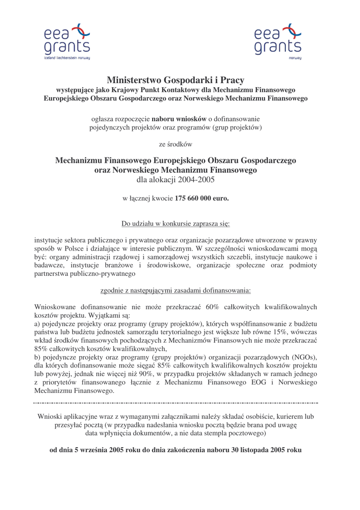 Ministerstwo Gospodarki i Pracy wyst puj ce jako Krajowy Punkt Kontaktowy dla Mechanizmu Finansowego Europejskiego Obszaru Gospodarczego oraz Norweskiego Mechanizmu Finansowego ogłasza rozpocz cie naboru wniosków o dofinansowanie pojedynczych projektów oraz programów (grup projektów) ze rodków Mechanizmu Finansowego Europejskiego Obszaru Gospodarczego oraz Norweskiego Mechanizmu Finansowego dla alokacji 2004-2005 w ł cznej kwocie 175 660 000 euro. Do udziału w konkursie zaprasza si : instytucje sektora publicznego i prywatnego oraz organizacje pozarz dowe utworzone w prawny sposób w Polsce i działaj ce w interesie publicznym. W szczególno ci wnioskodawcami mog by : organy administracji rz dowej i samorz dowej wszystkich szczebli, instytucje naukowe i badawcze, instytucje bran owe i rodowiskowe, organizacje społeczne oraz podmioty partnerstwa publiczno-prywatnego zgodnie z nast puj cymi zasadami dofinansowania: Wnioskowane dofinansowanie nie mo e przekracza 60% całkowitych kwalifikowalnych kosztów projektu. Wyj tkami s : a) pojedyncze projekty oraz programy (grupy projektów), których współfinansowanie z bud etu pa stwa lub bud etu jednostek samorz du terytorialnego jest wi ksze lub równe 15%, wówczas wkład rodków finansowych pochodz cych z Mechanizmów Finansowych nie mo e przekracza 85% całkowitych kosztów kwalifikowalnych, b) pojedyncze projekty oraz programy (grupy projektów) organizacji pozarz dowych (NGOs), dla których dofinansowanie mo e si ga 85% całkowitych kwalifikowalnych kosztów projektu lub powy ej, jednak nie wi cej ni 90%, w przypadku projektów składanych w ramach jednego z priorytetów finansowanego ł cznie z Mechanizmu Finansowego EOG i Norweskiego Mechanizmu Finansowego. Wnioski aplikacyjne wraz z wymaganymi zał cznikami nale y składa osobi cie, kurierem lub przesyła poczt (w przypadku nadesłania wniosku poczt b dzie brana pod uwag data wpłyni cia dokumentów, a nie data stempla pocztowego) od dnia 5 wrze nia 2005 roku do dnia zako czenia naboru 30 listopada 2005 roku w zakresie nast puj cych obszarów priorytetowych i rodków finansowych do wskazanych poni ej instytucji: Ochrona rodowiska, w tym rodowiska ludzkiego, poprzez m.in. redukcj zanieczyszcze i promowanie odnawialnych ródeł energii – 36 120 000 euro Lista zał czników do wniosku aplikacyjnego jest dost pna na stronach internetowych www.mos.gov.pl/mfeog, www.nfosigw.gov.pl oraz www.eog.gov.pl w zakładce Dokumenty. Wnioski nale y przesyła poczt na nast puj cy adres: Ministerstwo rodowiska, Departament Instrumentów Ochrony rodowiska, ul. Wawelska 52/54, 00-922 Warszawa, lub składa osobi cie pod ww. adresem w pok. 122 w godz. 8.30 – 16.00. Osoby do kontaktu: El bieta Pietraszko ( tel. 0 22 579 22 13, e-mail: [email protected]), Iwona Siedlecka (tel. 0 22 579 27 79, e-mail: [email protected]) Promowanie zrównowa onego rozwoju poprzez lepsze wykorzystanie i zarz dzanie zasobami – 3 200 000 euro Lista zał czników do wniosku aplikacyjnego jest dost pna na stronach internetowych www.mos.gov.pl/mfeog, www.nfosigw.gov.pl oraz www.eog.gov.pl w zakładce Dokumenty. Wnioski nale y przesyła poczt na nast puj cy adres: Ministerstwo rodowiska, Departament Instrumentów Ochrony rodowiska, ul. Wawelska 52/54, 00-922 Warszawa, lub składa osobi cie pod ww. adresem w pok. 122 w godz. 8.30 – 16.00. Osoby do kontaktu: El bieta Pietraszko ( tel. 0 22 579 22 13, e-mail: [email protected]), Iwona Siedlecka (tel. 0 22 579 27 79, e-mail: [email protected]) Ochrona kulturowego dziedzictwa europejskiego, w tym transport publiczny i odnowa miast - 28 000 000 euro Lista zał czników do wniosku aplikacyjnego jest dost pna na stronach internetowych www.mk.gov.pl/eog oraz www.eog.gov.pl w zakładce Dokumenty. Wnioski nale y przesyła poczt na nast puj cy adres: Ministerstwo Kultury, Departament Strategii Kultury i Spraw Europejskich, ul. Krakowskie Przedmie cie 15/17, 00-071 Warszawa, lub składa osobi cie pod ww. adresem w pok. 117 w godz. 9.00-16.00. Osoby do kontaktu: Dorota Jakubowska (tel. 0 22 421 02 71, e-mail: [email protected]), Magdalena Czarkowska (tel. 0 22 421 02 72, e-mail: [email protected]), Piotr Giemza (tel. 0 22 421 01 05, e-mail: [email protected]), Marcin Skrycki (tel. 0 22 421 05 23, e-mail: [email protected]) _____________________________________________________________________________ Rozwój zasobów ludzkich poprzez m.in. promowanie wykształcenia i szkole , wzmacnianie w samorz dzie i jego instytucjach potencjału z zakresu administracji lub słu by publicznej, a tak e wzmacnianie wspieraj cych go procesów demokratycznych -11 840 000 euro Lista zał czników do wniosku aplikacyjnego jest dost pna na stronach internetowych www.ukie.gov.pl oraz na stronie www.eog.gov.pl w zakładce Dokumenty. Wnioski nale y przesyła poczt na nast puj cy adres: Urz d Komitetu Integracji Europejskiej, Departament Programów Rozwoju Instytucjonalnego ul. Bagatela 14, 00-585 Warszawa lub składa osobi cie pod ww. adresem w pok. 513 w godz. 8.15-16.15. Osoba do kontaktu: Izabela Ptaszy ska (tel. 0 22 455 52 28, e-mail: [email protected]) _____________________________________________________________________________ Opieka zdrowotna i opieka nad dzieckiem – 16 920 000 euro Lista zał czników do wniosku aplikacyjnego jest dost pna na stronach internetowych www.mz.gov.pl, www.bpz.gov.pl w zakładce Współpraca z EOG oraz na www.eog.gov.pl w zakładce Dokumenty. Wnioski nale y przesyła poczt na nast puj cy adres: Biuro do Spraw Zagranicznych Programów Pomocy w Ochronie Zdrowia (Instytucja Wspomagaj ca dla Ministerstwa Zdrowia) Al. Jerozolimskie 155, 02 – 326 Warszawa lub składa osobi cie pod ww. adresem w pok. 111 w godz. 9.00-16.00. Osoby do kontaktu: Joanna Sienkiewicz (tel. 0 22 658 10 88, e-mail: [email protected]), Krystyna Drogo (tel. 0 22 659 85 01, e-mail: [email protected]), Izabela Sendla (tel. 0 22 658 14 58, e-mail: [email protected]). ___________________________________