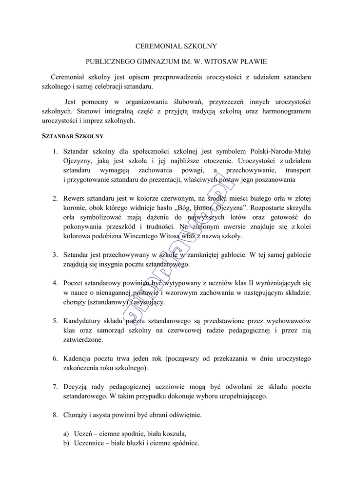 CEREMONIAŁ SZKOLNY PUBLICZNEGO GIMNAZJUM IM. W. WITOSAW PŁAWIE Ceremoniał szkolny jest opisem przeprowadzenia uroczystości z udziałem sztandaru szkolnego i samej celebracji sztandaru. Jest pomocny w organizowaniu ślubowań, przyrzeczeń innych uroczystości szkolnych. Stanowi integralną część z przyjętą tradycją szkolną oraz harmonogramem uroczystości i imprez szkolnych. SZTANDAR SZKOLNY 1. Sztandar szkolny dla społeczności szkolnej jest symbolem Polski-Narodu-Małej Ojczyzny, jaką jest szkoła i jej najbliższe otoczenie. Uroczystości z udziałem sztandaru wymagają zachowania powagi, a przechowywanie, transport i przygotowanie sztandaru do prezentacji, właściwych postaw jego poszanowania 2. Rewers sztandaru jest w kolorze czerwonym, na środku mieści koronie, obok którego widnieje hasło „Bóg, Honor, Ojczyzna”. orła symbolizować mają dążenie do najwyższych lotów pokonywania przeszkód i trudności. Na zielonym awersie kolorowa podobizna Wincentego Witosa wraz z nazwą szkoły. białego orła w złotej Rozpostarte skrzydła oraz gotowość do znajduje się z kolei 3. Sztandar jest przechowywany w szkole w zamkniętej gablocie. W tej samej gablocie znajdują się insygnia pocztu sztandarowego. 4. Poczet sztandarowy powinien być wytypowany z uczniów klas II wyróżniających się w nauce o nienagannej postawie i wzorowym zachowaniu w następującym składzie: chorąży (sztandarowy) i asystujący. 5. Kandydatury składu pocztu sztandarowego są przedstawione przez wychowawców klas oraz samorząd szkolny na czerwcowej radzie pedagogicznej i przez nią zatwierdzone. 6. Kadencja pocztu trwa jeden rok (począwszy od przekazania w dniu uroczystego zakończenia roku szkolnego). 7. Decyzją rady pedagogicznej uczniowie mogą być odwołani ze składu pocztu sztandarowego. W takim przypadku dokonuje wyboru uzupełniającego. 8. Chorąży i asysta powinni być ubrani odświętnie. a) Uczeń – ciemne spodnie, biała koszula, b) Uczennice – białe bluzki i ciemne spódnice. 9. Insygnia pocztu sztandarowego: a) biało-czerwone szarfy przewieszone przez prawe ramię, zwrócone kolorem białym w stronę kołnierza, spięte na lewym biodrze, b) białe rękawiczki. 10. Udział sztandaru w uroczystościach na terenie szkoły: a) b) c) d) Uroczyste rozpoczęcie roku szkolnego, Ślubowanie klas pierwszych, Uroczystości rocznicowe: Konstytucja 3 Maja i Święto Niepodległości, Uroczyste zakończenie roku szkolnego. 11. Chwyty sztandaru: e) postawa zasadnicza - Sztandar położony na trzewiku drzewca przy prawej nodze na wysokości czubka buta. Drzewce przytrzymywane prawą ręką na wysokości pasa. Lewa ręka jak w postawie zasadniczej. f) postawa „spocznij” - Sztandar trzymany przy prawej nodze jak w postawie zasadniczej. Chorąży i asysta w postawie „spocznij”. g) postawa „na ramię” - Chorąży prawą ręką (pomagając sobie lewą) kładzie drzewce na prawe ramię i trzyma je pod kątem 45 stopni w stosunku do ramienia. Prawa ręka wyciągnięta wzdłuż drzewca. h) postawa „prezentuj” - Z postawy zasadniczej chorąży podnosi sztandar prawą ręką i pionowo do gór wzdłuż prawego ramienia (dłoń prawej ręki na wysokości barku). Następnie lewą ręką chwyta drzewce sztandaru tuż pod prawą i opuszcza prawą ręką na całej jej długości, obejmując dolną część drzewca. Asysta w postawie zasadniczej. i) salutowanie sztandaru w miejscu - Wykonuje się z postawy „prezentuj”; chorąży robi zwrot w prawo skos z równoczesnym wysunięciem lewej nogi w przód na odległość jednej stopy i pochyla sztandar do przodu pod kątem 45 stopni. Po czasie „salutowania” przenosi sztandar do postawy „prezentuj”. j) salutowanie sztandarem w marszu - Z położenia „na ramię” w taki sam sposób jak przy salutowaniu w miejscu. k) komendy: • „na prawo patrz” – pochyla sztandar; • „baczność – bierze sztandar na ramię. 12. Ceremoniał uroczystości szkolnych z udziałem sztandaru: a) Wprowadzenie sztandaru Lp. Opis sytuacyjny zachowania się uczestników po komendzie uczestnicy powstają przed wyprowadzeniem sztandaru uczestnicy w postawie zasadniczej Komendy i ich kolejność 1. Proszę o powstanie 2. „baczność”, sztandar wyprowadzić Poczet sztandarowy Sztandar Przygotowanie do wyjścia postawa na ramię - wprowadzenie sztandaru - zatrzymanie na ustalonym miejscu - w postawie na ramię w marszu - postawa prezentuj Postawa salutowanie w miejscu - postawa prezentuj - postawa spocznij Postawa spocznij 3. „do hymnu” Jak wyżej Postawa zasadnicza 4. „po hymnie” Uczestnicy w postawie spocznij spocznij 5. Można usiąść Uczestnicy siadają spocznij b) Wyprowadzenie sztandaru Lp. Komendy i ich kolejność 1. proszę o powstanie 2. „baczność”, sztandar wyprowadzić 3. „spocznij” Opis sytuacyjny zachowania się uczestników po komendzie uczestnicy powstają przed wyprowadzeniem sztandaru uczestnicy w postawie zasadniczej Uczestnicy siadają Poczet sztandarowy Sztandar Spocznij Postawa spocznij - postawa zasadnicza - wyprowadzenie sztandaru Postawa zasadnicza Postawa na ramię w marszu 13. Ceremoniał przekazania sztandaru Lp . Komendy i ich kolejność 1. Proszę o powstanie 2. Poczet sztandarowy oraz nowy skład pocztu (lub wytypowani uczniowie kl. II) do przekazania sztandaru wystąp 3. Baczność – sztandar przekazać 4. Baczność ustępujący poczet odmaszerować 5. Baczność sztandar wyprowadzić 6. spocznij Opis sytuacyjny zachowania się uczestników po komendzie uczestnicy powstają przed wyprowadzeniem sztandaru Uczestnicy postawa zasadnicza nowy skład pocztu występuje i ustawia się z przodu sztandaru Uczestnicy postawa zasadnicza Uczestnicy w postawie zasadniczej nagradzają brawami ustępujący poczet, który przechodzi na wyznaczone miejsce Postawa zasadnicza Uczniowie siadają Poczet sztandarowy Sztandar Spocznij Postawa spocznij Postawa zasadnicza Postawa zasadnicza, postawa pre