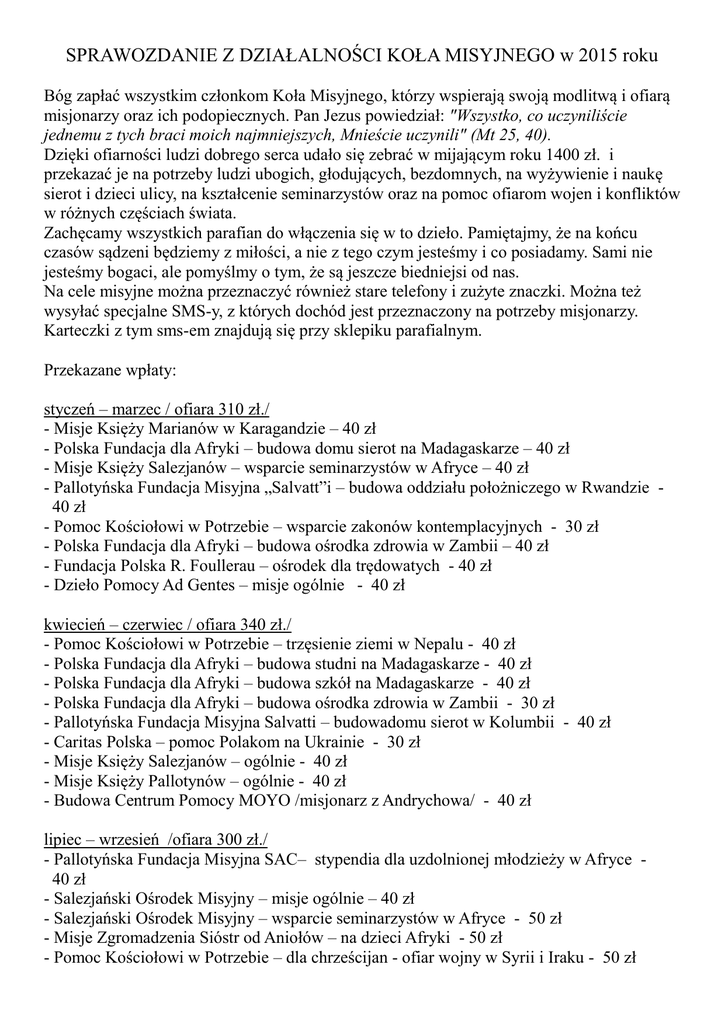 SPRAWOZDANIE Z DZIAŁALNOŚCI KOŁA MISYJNEGO w 2015 roku Bóg zapłać wszystkim członkom Koła Misyjnego, którzy wspierają swoją modlitwą i ofiarą misjonarzy oraz ich podopiecznych. Pan Jezus powiedział: "Wszystko, co uczyniliście jednemu z tych braci moich najmniejszych, Mnieście uczynili" (Mt 25, 40). Dzięki ofiarności ludzi dobrego serca udało się zebrać w mijającym roku 1400 zł. i przekazać je na potrzeby ludzi ubogich, głodujących, bezdomnych, na wyżywienie i naukę sierot i dzieci ulicy, na kształcenie seminarzystów oraz na pomoc ofiarom wojen i konfliktów w różnych częściach świata. Zachęcamy wszystkich parafian do włączenia się w to dzieło. Pamiętajmy, że na końcu czasów sądzeni będziemy z miłości, a nie z tego czym jesteśmy i co posiadamy. Sami nie jesteśmy bogaci, ale pomyślmy o tym, że są jeszcze biedniejsi od nas. Na cele misyjne można przeznaczyć również stare telefony i zużyte znaczki. Można też wysyłać specjalne SMS-y, z których dochód jest przeznaczony na potrzeby misjonarzy. Karteczki z tym sms-em znajdują się przy sklepiku parafialnym. Przekazane wpłaty: styczeń – marzec / ofiara 310 zł./ - Misje Księży Marianów w Karagandzie – 40 zł - Polska Fundacja dla Afryki – budowa domu sierot na Madagaskarze – 40 zł - Misje Księży Salezjanów – wsparcie seminarzystów w Afryce – 40 zł - Pallotyńska Fundacja Misyjna „Salvatt”i – budowa oddziału położniczego w Rwandzie 40 zł - Pomoc Kościołowi w Potrzebie – wsparcie zakonów kontemplacyjnych - 30 zł - Polska Fundacja dla Afryki – budowa ośrodka zdrowia w Zambii – 40 zł - Fundacja Polska R. Foullerau – ośrodek dla trędowatych - 40 zł - Dzieło Pomocy Ad Gentes – misje ogólnie - 40 zł kwiecień – czerwiec / ofiara 340 zł./ - Pomoc Kościołowi w Potrzebie – trzęsienie ziemi w Nepalu - 40 zł - Polska Fundacja dla Afryki – budowa studni na Madagaskarze - 40 zł - Polska Fundacja dla Afryki – budowa szkół na Madagaskarze - 40 zł - Polska Fundacja dla Afryki – budowa ośrodka zdrowia w Zambii - 30 zł - Pallotyńska Fundacja Misyjna Salvatti – budowadomu sierot w Kolumbii - 40 zł - Caritas Polska – pomoc Polakom na Ukrainie - 30 zł - Misje Księży Salezjanów – ogólnie - 40 zł - Misje Księży Pallotynów – ogólnie - 40 zł - Budowa Centrum Pomocy MOYO /misjonarz z Andrychowa/ - 40 zł lipiec – wrzesień /ofiara 300 zł./ - Pallotyńska Fundacja Misyjna SAC– stypendia dla uzdolnionej młodzieży w Afryce 40 zł - Salezjański Ośrodek Misyjny – misje ogólnie – 40 zł - Salezjański Ośrodek Misyjny – wsparcie seminarzystów w Afryce - 50 zł - Misje Zgromadzenia Sióstr od Aniołów – na dzieci Afryki - 50 zł - Pomoc Kościołowi w Potrzebie – dla chrześcijan - ofiar wojny w Syrii i Iraku - 50 zł - Polska Fundacja dla Afryki – 50 zł - wysłano znaczki i stare telefony na misje – opłaty pocztowe – 20 zł październik – grudzień /ofiara 450 zł./ - Polska Fundacja dla Afryki – budowa porodówki – Wybrzeże Kości Słoniowej – 70 zł - Misje Księży Pallotynów – ogólnie - 30 zł - Papieskie Dzieła Misyjne - 30 zł - Salezjański Ośrodek Misyjny – budowa szkoły w Ugandzie - 40 zł - Pomoc Kościołowi w Potrzebie – dla chrześcijan - ofiar wojny w Syrii i Iraku - 90 zł - Misje Zgromadzenia Sióstr od Aniołów – na dzieci Afryki - 40 zł - Pallotyńska Fundacja Misyjna Salvatti – wsparcie seminarzystów w Afryce - 30 zł - Polska Fundacja dla Afryki – budowa szkoły na Madagaskarze - 40 zł - Salezjański Ośrodek Misyjny – budowa przedszkola w Angoli - 40 zł - Salezjański Ośrodek Misyjny – budowa szkoły zawodowej w Ugandzie - 40 zł