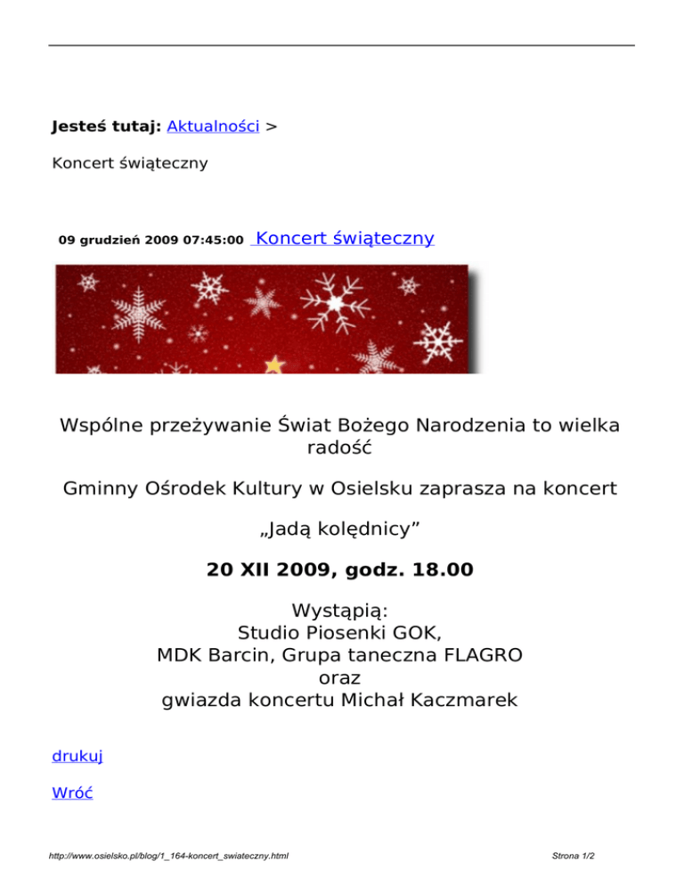 Jesteś tutaj: Aktualności > Koncert świąteczny 09 grudzień 2009 07:45:00 Koncert świąteczny Wspólne przeżywanie Świat Bożego Narodzenia to wielka radość Gminny Ośrodek Kultury w Osielsku zaprasza na koncert „Jadą kolędnicy” 20 XII 2009, godz. 18.00 Wystąpią: Studio Piosenki GOK, MDK Barcin, Grupa taneczna FLAGRO oraz gwiazda koncertu Michał Kaczmarek drukuj Wróć http://www.osielsko.pl/blog/1_164-koncert_swiateczny.html Strona 1/2 http://www.osielsko.pl/blog/1_164-koncert_swiateczny.html Powered by TCPDF (www.tcpdf.org) Strona 2/2