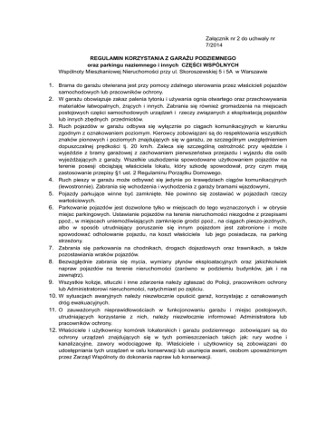 Załącznik nr 2 do uchwały nr 7/2014 REGULAMIN KORZYSTANIA Z GARAŻU PODZIEMNEGO oraz parkingu naziemnego i innych CZĘŚCI WSPÓLNYCH Wspólnoty Mieszkaniowej Nieruchomości przy ul. Skoroszewskiej 5 i 5A w Warszawie 1. Brama do garażu otwierana jest przy pomocy zdalnego sterowania przez właścicieli pojazdów samochodowych lub pracowników ochrony. 2. W garażu obowiązuje zakaz palenia tytoniu i używania ognia otwartego oraz przechowywania materiałów łatwopalnych, żrących i innych. Zabrania się również gromadzenia na miejscach postojowych części samochodowych urządzeń i rzeczy związanych z eksploatacją pojazdów lub innych zbędnych przedmiotów. 3. Ruch pojazdów w garażu odbywa się wyłącznie po ciągach komunikacyjnych w kierunku zgodnym z oznakowaniem poziomym. Kierowcy zobowiązani są do respektowania wszystkich znaków pionowych i poziomych znajdujących się w garażu, ze szczególnym uwzględnieniem dopuszczalnej prędkości tj. 20 km/h. Zaleca się szczególną ostrożność przy wjeździe i wyjeździe z bramy garażowej z zachowaniem pierwszeństwa przejazdu i wyjazdu dla osób wyjeżdżających z garaży. Wszelkie uszkodzenia spowodowane użytkowaniem pojazdów na terenie posesji obciążają właściciela lokalu, który szkodę spowodował, przy czym mają zastosowanie przepisy §1 ust. 2 Regulaminu Porządku Domowego. 4. Ruch pieszy w garażu może odbywać się jedynie po krawędziach ciągów komunikacyjnych (lewostronnie). Zabrania się wchodzenia i wychodzenia z garaży bramami wjazdowymi, 5. Pojazdy parkujące winne być zamknięte. Nie powinno się zostawiać w pojazdach rzeczy wartościowych. 6. Parkowanie pojazdów jest dozwolone tylko w miejscach do tego wyznaczonych i w obrysie miejsc parkingowych. Ustawianie pojazdów na terenie nieruchomości niezgodne z przepisami ppoż., w miejscach uniemożliwiających zamknięcie grodzi ppoż., na ciągach pieszo-jezdnych, albo w sposób utrudniający poruszanie się innym pojazdom jest zabronione i może spowodować odholowanie pojazdu, na koszt właściciela lub jego posiadacza, na parking strzeżony. 7. Zabrania się parkowania na chodnikach, drogach dojazdowych oraz trawnikach, a także pozostawiania wraków pojazdów. 8. Bezwzględnie zabrania się mycia, wymiany płynów eksploatacyjnych oraz jakichkolwiek napraw pojazdów na terenie nieruchomości (zarówno w podziemiu budynków, jak i na zewnątrz). 9. Wszystkie kolizje, stłuczki i inne zdarzenia należy zgłaszać do Policji, pracownikom ochrony lub Administratorowi nieruchomości, natychmiast po zajściu. 10. W sytuacjach awaryjnych należy niezwłocznie opuścić garaż, korzystając z oznakowanych dróg ewakuacyjnych. 11. O zauważonych nieprawidłowościach w funkcjonowaniu garażu i miejsc postojowych, utrudniających korzystanie z nich, należy niezwłocznie informować Administratora lub pracowników ochrony. 12. Właściciele i użytkownicy komórek lokatorskich i garażu podziemnego zobowiązani są do ochrony urządzeń znajdujących się w tych pomieszczeniach takich jak: rury wodne i kanalizacyjne, zawory wodociągowe itp. Właściciele i użytkownicy są zobowiązani do udostępniania tych urządzeń w celu konserwacji lub usunięcia awarii, osobom upoważnionym przez Zarząd Wspólnoty do dokonania napraw lub konserwacji.