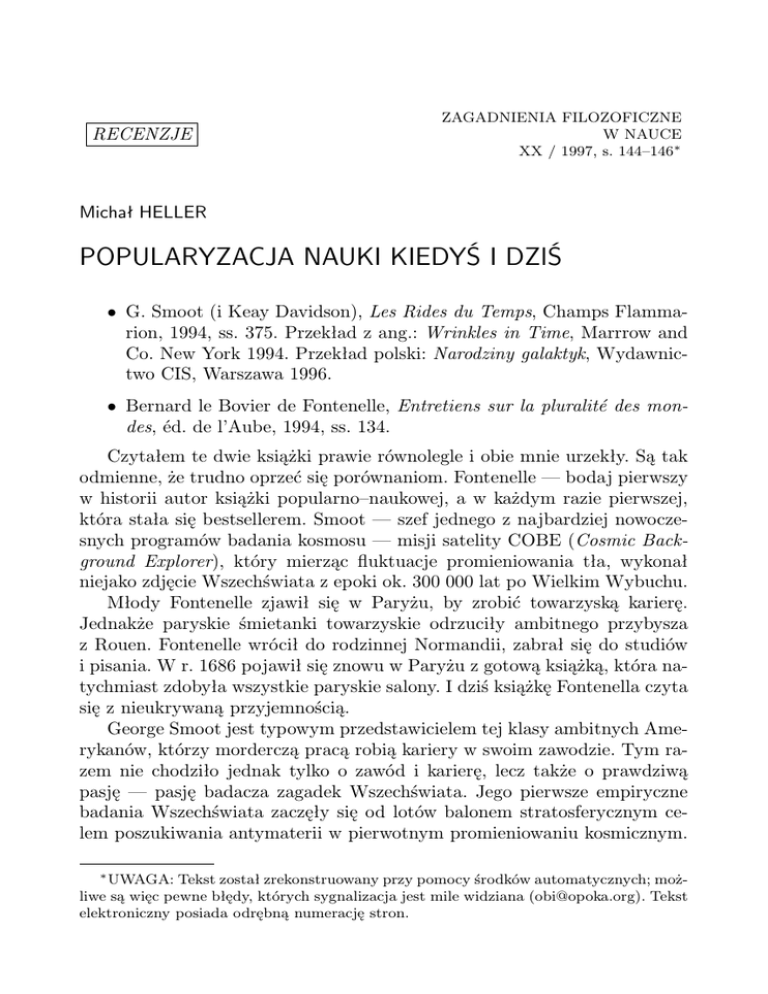 RECENZJE ZAGADNIENIA FILOZOFICZNE W NAUCE XX / 1997, s. 144–146∗ Michał HELLER POPULARYZACJA NAUKI KIEDYŚ I DZIŚ • G. Smoot (i Keay Davidson), Les Rides du Temps, Champs Flammarion, 1994, ss. 375. Przekład z ang.: Wrinkles in Time, Marrrow and Co. New York 1994. Przekład polski: Narodziny galaktyk, Wydawnictwo CIS, Warszawa 1996. • Bernard le Bovier de Fontenelle, Entretiens sur la pluralité des mondes, éd. de l’Aube, 1994, ss. 134. Czytałem te dwie książki prawie równolegle i obie mnie urzekły. Są tak odmienne, że trudno oprzeć się porównaniom. Fontenelle — bodaj pierwszy w historii autor książki popularno–naukowej, a w każdym razie pierwszej, która stała się bestsellerem. Smoot — szef jednego z najbardziej nowoczesnych programów badania kosmosu — misji satelity COBE (Cosmic Background Explorer), który mierząc fluktuacje promieniowania tła, wykonał niejako zdjęcie Wszechświata z epoki ok. 300 000 lat po Wielkim Wybuchu. Młody Fontenelle zjawił się w Paryżu, by zrobić towarzyską karierę. Jednakże paryskie śmietanki towarzyskie odrzuciły ambitnego przybysza z Rouen. Fontenelle wrócił do rodzinnej Normandii, zabrał się do studiów i pisania. W r. 1686 pojawił się znowu w Paryżu z gotową książką, która natychmiast zdobyła wszystkie paryskie salony. I dziś książkę Fontenella czyta się z nieukrywaną przyjemnością. George Smoot jest typowym przedstawicielem tej klasy ambitnych Amerykanów, którzy morderczą pracą robią kariery w swoim zawodzie. Tym razem nie chodziło jednak tylko o zawód i karierę, lecz także o prawdziwą pasję — pasję badacza zagadek Wszechświata. Jego pierwsze empiryczne badania Wszechświata zaczęły się od lotów balonem stratosferycznym celem poszukiwania antymaterii w pierwotnym promieniowaniu kosmicznym. ∗ UWAGA: Tekst został zrekonstruowany przy pomocy środków automatycznych; możliwe są więc pewne błędy, których sygnalizacja jest mile widziana ([email protected]). Tekst elektroniczny posiada odrębną numerację stron. 2 Michał HELLER Ale już następny temat dotyczył promieniowania tła. Samolot szpiegowski U–2 z lat pięćdziesiątych został wypożyczony przez NASA i przeznaczony do wykrycia dipolowej anizotropii promieniowania tła (różnicy temperatur w przeciwległych punktach nieba świadczącej o ruchu Ziemi względem promieniowania). Smoot został kierownikiem programu. Przygodę sportową połączył z przygodą naukową. Pasjonowało go konstruowanie aparatury, praca z zespołem, prowadzenie ogromnej administracji, współpraca z pilotami, przezwyciężanie trudności w przekształcaniu samolotu szpiegowskiego w latające laboratorium i wreszcie same loty na wielkich wysokościach, niedostępnych zwykłym, nawet wojskowym, samolotom. Żmudne, długotrwałe analizy danych uwieńczone zostały odkryciem anizotropii dipolowej. Ale to był dopiero początek. Prawdziwym wyzwaniem stało się zmierzenie pierwotnych fluktuacji w promieniowaniu tła. Znowu sondy balonowe — bez skutku. I wniosek — tylko satelita jest w stanie pomóc. Rozpoczęły się starania w NASA i konstrukcja urządzeń, które pochłonęły kilka lat pracy. I gdy wszystko było wreszcie na dobrej drodze, nastąpiła katastrofa Challengera. NASA wstrzymało cały program (wszystkie loty zostały zawieszone). Ale ekipa Smoota nie poddała się. Poddano pomysł, by wykorzystać rakietę Delta. Trzeba jednak było znacznie zmniejszyć wagę i rozmiary samego satelity, co wymagało znowu gigantycznej pracy — projektowania instrumentów prawie od nowa. 18 XI 1989 r. rakieta Delta została pomyślnie odpalona i satelita COBE został umieszczony na orbicie. 15 lat pracy uwieńczył sukces, ale jeszcze nie natychmiast. Trzeba było kilka lat zbierać dane z satelity. Ażeby odjąć od danych „radiowy szum” naszej Galaktyki, trzeba było zorganizować nową wyprawę na Antarktydę i z bieguna południowego przeprowadzić pomiary (bo COBE także nad biegunem wykonywał swoje obserwacje). I jeszcze zmagania się z redukcją danych i wreszcie... jest! Jedna z szeregu „map” bardzo młodego Wszechświata, ukazująca „zmarszczki” na gładkim polu promieniowania tła, obiegła świat, ukazując się w codziennych gazetach. Książka Smoota (napisana przy pomocy dziennikarza K. Davidsona) stała się bestsellerem. Gdy chciałem kupić drugi egzemplarz, jako prezent dla kogoś, nie było już jej w księgarni. A jakiś czas przedtem leżały całe stosy. Książka Smoota nie jest tylko opowieścią o własnych przygodach naukowych. Jest to również bardzo dobra książka popularno–naukowa. Opowiadanie o własnych pracach badawczych przeplata się z rozdziałami o historii kosmologii, zarówno dawnej, jak i całkiem najnowszej. Zalecam tę książkę POPULARYZACJA NAUKI KIEDYŚ I DZIŚ 3 bardziej niż wiele innych pozycji popularyzujących wprost wiedzę o Wszechświecie. Od Smoota można dowiedzieć się wiele na temat najnowszych osiągnięć kosmologii i będzie to na pewno wiedza z pierwszej ręki. Fontenelle nie potrzebował niczyjej pomocy. Pisał sam z ogromnym pisarskim i popularyzatorskim talentem. Wybrał formę listów, w których relacjonował swoje rozmowy z piękną markizą G. Zaczęło się od wieczornego spaceru po parku wokół pałacu markizy. Księżyc świecił i błyszczały gwiazdy. Markiza inteligentnie słuchała wykładu najnowszych osiągnięć astronomii. Wykład był przyprawiony odrobiną filozofii i odrobiną sensacji. „Wydaje mi się, że nic nie powinno nas interesować bardziej niż zrozumienie, jak powstał świat, który zamieszkujemy, czy istnieją inne światy podobne i czy są także zamieszkałe”. Ale Fontenelle jest uczciwym popularyzatorem. Roztacza przed swoją słuchaczką wizje zamieszkałych planet krążących wokół innych słońc, lecz nie podaje tego za naukowy pewnik. „Nie przysiągłbym, że to jest prawdą, ale utrzymuję, że 