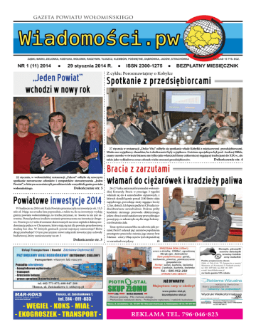 Wiadomości.pw reklama tel. 796-046-823 NR 1 (11) 2014 ● WWW.WIADOMOSCIPW.PL 29 stycznia 2014 R. „Jeden Powiat” wchodzi w nowy rok ● ISSN 2300-1275 ● BEZPŁATNY MIESIĘCZNIK Z cyklu: Porozmawiajmy o Kobyłce Spotkanie z przedsiębiorcami 27 stycznia w restauracji „Dolce Vita” odbyło się spotkanie władz Kobyłki z miejscowymi przedsiębiorcami. Miało ono wyjątkowy charakter, bo i okoliczności były wyjątkowe. Gościem specjalnym był prof. Andrzej Blikle, znany szeroko w świecie biznesu nie tylko jako właściciel firmy cukierniczej sięgającej tradycjami do XIX w., ale także jako wykładowca oraz członek wielu zrzeszeń przedsiębiorców. Dokończenie str. 4 22 stycznia, w wołomińskiej restauracji „Falcon” odbyło się uroczyste spotkanie noworoczne członków i sympatyków stowarzyszenia „Jeden Powiat”, w którym uczestniczyli przedstawiciele wszystkich gmin powiatu wołomińskiego. Dokończenie str. 5 Powiatowe inwestycje 2014 W budżecie na 2014 rok Rada Powiatu przeznaczyła na inwestycje ok. 15,5 mln zł. Mając na uwadze lata poprzednie, a także to, ile na inwestycje wydają gminy powiatu wołomińskiego, to trzeba przyznać, że kwota ta nie jest zawrotna. Ponad połowa środków zostanie przeznaczona na inwestycje drogowe. Prawie po 2,5 mln zł zostanie skierowanych na rzecz szpitala i dalszą modernizację pałacu w Chrzęsnem, który stają się już dla powiatu przysłowiową studnią bez dna. W których gminach powiat najwięcej zainwestuje? Które drogi przebuduje? O tym precyzyjnie mówi załącznik inwestycyjny uchwały budżetowej, który zamieszczamy na str. 3 Dokończenie str. 3 Bracia z zarzutami włamań do ciężarówek i kradzieży paliwa 26 i 27-latka zatrzymali kryminalni wołomińskiej Komendy. Bracia w przeciągu 3 tygodni włamali się do 4 samochodów ciężarowych, z których skradli łącznie ponad 2100 litrów oleju napędowego, powodując straty sięgające kwoty 12 tys. złotych. Ich łupem padły też CB radia i radioodtwarzacze samochodowe. Podczas próby kradzieży ziemnego przewodu elektrycznego, jeden z braci został zaatakowany przez pilnujące posesji psy, co zakończyło się dla niego bolesnymi obrażenia ciała. Teraz oprócz uszczerbku na zdrowiu jaki poniósł, Piotr P. usłyszał pięć zarzutów popełnienia przestępstw przeciwko mieniu, jego starszy brat Mariusz - cztery. Obaj czynów tych dopuścili się w warunkach recydywy. ts reklama tel. 796-046-823 2 Wiadomości.pw CO? GDZIE? KIEDY? reklama tel. 796-046-823 WWW.WIADOMOSCIPW.PL WOŁOMIN: KULTURALNE: ■ 1 lutego godz. 19.00, Miejski Dom Kultury w Wołominie – Brazylijska Noc Karnawałowa. W programie: zabawa taneczna z DJ Kamilem, pokaz tańców brazylijskich, kuchnia egzotyczna, wiele atrakcji w rytmie SAMBY. Cena: 35 zł/WKR 24,50 zł. ■ 2 lutego, godz. 14.00, MDK – kolejny występ grupy Underground w słynnym musicalu METRO. Darmowe wejściówki dostępne w MDK. ■ 9 lutego, godz. 17.00, Hala sportowa przy Szkole Podstawowej nr 7 w Wołominie – Program historyczno – estradowy z okazji 95. rocznicy nadania Praw Miejskich Wołominowi w wykonaniu Reprezentacyjnego Zespołu Artystycznego Wojska Polskiego. Wstęp wolny. ■ 11 lutego. godz. 19.00, MDK hol główny – Wystawa mebli naprawionych i odnowionych przez młodzież gimnazjalną w ramach projektu „Sztuka w recyklingu”. ■ 14 lutego, godz. 19.00, MDK, Kabaret z Konopi - to niewątpliwie ulubieńcy widowni, o czym świadczy fakt nadania kilkudziesięciu nagród przez publiczność na wielu festiwalach i przeglądach kabaretowych w całym kraju, w ciągu niespełna 7 lat działalności kabaretu. 20 zł – przedsprzedaż, 25 zł w dniu imprezy. JADÓW DLA DZIECI I MŁODZIEŻY: ■ 22 lutego 2014, godz. 11.00 – Gminny Ośrodek Kulturalny w Jadowie – Konkurs wokalny dla dzieci i młodzieży, tel.: 25 675 41 07, e-mail: [email protected] . ■ Ferie zimowe w Gminnym Ośrodku Kultury w Jadowie. Zajęcia odbędą się od 17 lutego do 1 marca w godzinach 10.00 – 14.00. Szczegółowy program zajęć na stronie: http://jadow. az.pl/01/ ZĄBKI MARKI DLA DZIECI: ■ 24 – 28 lutego Marecki Ośrodek Kultury - Półkolonie dla dzieci w wieku 7-10 lat – Zima w mieście. Pod patronatem Burmistrza Miasta Marki. W programie m.in. 3 autokarowe wycieczki: do kina, za miasto i do sali zabaw, zajęcia teatralne, taneczne i plastyczne, imprezy rozrywkowe, warsztaty tematyczne, gry i zabawy. Zajęcia odbywać się będą w godz. 8.00 – 16.30. Koszt 190 zł. KULTURALNE: ■ MOK, sobota, 01.02.2014, godzina 17:00 - 11 Prezentacje Plastyki Mareckiej PODSUMOWANIE. SPOTKANIE AUTORÓW Z KRYTYKIEM SZTUKI JAROSŁAWEM DASZKIEWICZEM ZDROWOTNE: ■ 5 lutego, godz. 9.00 – 17.00 – parking przy Urzędzie Miasta Marki, bezpłatne badania w mammobusie dla pań w wieku 50 – 69 lat. Wymagana wcześniejsza rejestracja. Rejestracja pod numerami telefonów w godz. 8.00 - 20.00 (85) 676 03 32 LUB (85) 676 13 22 DĄBRÓWKA ■ 2 lutego godz. 14.00, Hala sportowa przy Publicznym Gimnazjum im. Tadeusza Kościuszki w Dąbrówce - XVI Turniej Tenisa Stołowego o Puchar Wójta Gminy Dąbrówka. Urząd Gminy Dąbrówka i Publiczne Gimnazjum im. Tadeusza Kościuszki w Dąbrówce zapraszają wszystkich chętnych do udziału w XVI Turnieju Tenisa Stołowego o Puchar Wójta Gminy Dąbrówka. Gwarantujemy wspaniałą zabawę, sportowe emocje oraz nagrody dla zwycięzców. ■ 9 lutego, godz. 14.00, Hala sportowa przy Publicznym Gimnazjum im. Tadeusza Kościuszki w Dąbrówce - Turniej Piłki Siatkowej Kobiet o Puchar Wójta Gminy Dąbrówka. TŁUSZCZ STRACHÓWKA CHARYTATYWNE: ■ 1 lutego 2014r. w Sali OSP Strachówka o godz. 20.00. Będzie się działo! „SPEŁNIAMY MARZENIA” ■ przyjdź ■ pomóż ■ pobaw się ■ Zapisy i wszystkie informacje na temat naszego celu pod nr. tel. 602 592 815 LUB 500 547 827 KOBYŁKA KULTURALNE: ■ 31 stycznia, godz. 19.00, Miejski Ośrodek Kultury w Kobyłce, Karnawałowy Wiec