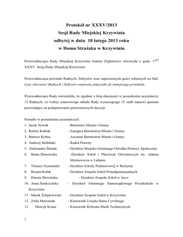 Protokół nr XXXV/2013 Sesji Rady Miejskiej Krzywinia odbytej w dniu 18 lutego 2013 roku w Domu Strażaka w Krzywiniu Przewodnicząca Rady Miejskiej Krzywinia Joanna Ziętkiewicz otworzyła o godz. 1700 XXXV Sesję Rady Miejskiej Krzywinia. Przewodnicząca powitała Radnych, Sołtysów oraz zaproszonych gości zebranych na Sali. Listy obecności Radnych i Sołtysów stanowią załączniki do niniejszego protokołu. Przewodnicząca Rady stwierdziła, że zgodnie z listą obecności w posiedzeniu uczestniczy 15 Radnych, co wobec ustawowego składu Rady wynoszącego 15 osób stanowi quorum pozwalające na podejmowanie prawomocnych decyzji. Ponadto w posiedzeniu uczestniczyli: 1. Jacek Nowak - Burmistrz Miasta i Gminy 2. Robert Kubiak - Zastępca Burmistrza Miasta i Gminy 3. Bartosz Kobus - Asystent Burmistrza Miasta i Gminy 4. Andrzej Skibiński - Radca Prawny 5. Aleksandra Ślotała - Dyrektor Miejsko-Gminnego Ośrodka Pomocy Społecznej 6. Beata Zborowska -Dyrektor Szkół i Placówek Oświatowych im. Adama Mickiewicza w Lubiniu 7. Tomasz Szymański - Dyrektor Szkoły Podstawowej w Bieżyniu 8. Renata Kołak - Dyrektor Zespołu Szkół Ponadgimnazjalnych 9. Dorota Słowińska 10. Anna Szułczyńska - Dyrektor Zespołu Szkół w Jerce - Dyrektor Gminnego Samorządowego Przedszkola w Krzywiniu 11. Marek Żołędziewski - Dyrektor Zespołu Szkół w Krzywiniu 12. Zofia Marciniak - Kierownik Urzędu Stanu Cywilnego 13. - Kierownik Referatu Służb Technicznych 1 Henryk Kolan Przewodnicząca Rady stwierdziła, że wraz z zawiadomieniem o terminie i miejscu posiedzenia XXXV Sesji Rady Miejskiej Krzywinia Radni otrzymali porządek obrad, projekty uchwał i materiały związane z problematyką posiedzenia. Przewodnicząca Rady zwróciła się z zapytaniem czy są wnioski o zmianę porządku obrad. Radna Krystyna Motławska miała wątpliwość co do procedury przyjmowania dokumentów opracowanych przez Komisję Rewizyjną. Radna powiedziała, że plan pracy na rok 2013 jest przyjmowany w formie uchwały, natomiast sprawozdanie za rok 2012 jest tylko w formie przedstawienia. Podczas gdy jeden i drugi temat jest uregulowany w ustawie o samorządzie gminnym. Radna złożyła wniosek o wprowadzenie do porządku obrad uchwały o przyjęciu sprawozdania z działalności Komisji Rewizyjnej Rady Miejskiej Krzywinia z a rok 2012. Radca Prawny Andrzej Skibiński powiedział, że sprawozdanie z działalności Komisji Rewizyjnej może być w formie odrębnej uchwały, ale nie musi. Przewodnicząca Rady zgłosiła wniosek, aby porządek obrad pozostawić bez zmian. Radny Roman Majorczyk zadał pytanie czy w innych samorządach sprawozdania z Komisji Rewizyjnej są przyjmowane w formie uchwał. Radca Prawny Andrzej Skibiński odpowiedział, że też jest taka praktyka, że uchwałą przyjmuje się zarówno plan pacy jak i sprawozdanie z prac Komisji Rewizyjnej. Radny Roman Majorczyk zapytał, czy sprawozdania i plany pacy innych Komisji też powinny być przyjmowane przez Radę w formie uchwały. Radca Prawny Andrzej Skibiński powiedział, że może być w formie uchwały, ale jeżeli takiej praktyki nie było w Gminie Krzywiń lepiej pozostawić to bez zmian. Przewodnicząca Rady poddała wniosek Radnej Krystyny Motawskiej o wprowadzenie do porządku obrad uchwały o przyjęciu sprawozdania z działalności Komisji Rewizyjnej Rady Miejskiej Krzywinia z a rok 2012 pod głosowanie. 2 Rada Miejska Krzywinia (za -6, przeciw- 1, wstrzymało się-8) odrzuciła wniosek Radnej Krystyny Motławskiej, ponieważ nie uzyskał bezwzględnej większości ustawowego składu rady. Radny Andrzej Gubański złożył wniosek o wprowadzenie do porządku obrad projektu uchwały w sprawie wyrażenia woli nawiązania współpracy z Powiatem kościańskim i gminą Śrem w zakresie przygotowania inwestycji pn: „Wzrost spójności komunikacyjnej oraz poprawa bezpieczeństwa ruchu drogowego przez budowę i przebudowę ciągów drogowych na odcinku Lubiń-Bieżyń- Mościszki-Dalewo” planowanej do dofinansowania ze środków „Narodowego Programu Przebudowy Dróg Lokalnych-Etap II Bezpieczeństwo-Dostępność-Rozwój”. Radna Magdalena Mielczarek zapytała jaką opinię wyraził Burmistrz Śremu oraz czy Burmistrz Miasta i Gminy Krzywiń zadeklarował już chęć pomocy Staroście Kościańskiemu w tej sprawie. Radny Roman Majorczyk powiedział, że w piśmie, które Radni otrzymali od Starosty Kościańskiego widnieje zapis, że Burmistrz Miasta i Gminy Śrem wyraził gotowość uczestniczenia w realizacji tej inwestycji. Starostwo musi przygotować projekt, dlatego taka deklaracja w formie pisemnej jest deklaracją „na poważnie”. Burmistrz Miasta i Gminy Krzywiń powiedział, że poinformował już Radnych na wspólnym spotkaniu o tym, że przekaże informację osobiście Staroście o gotowości uczestnictwa w tym projekcie. Burmistrz uważa, że podejmowanie uchwały w tym zakresie jest zbędne. Radny Jerzy Nowak powiedział, że w porównaniu do Powiatu Śremskiego i Powiatu Kościańskiego jesteśmy małą Gminą, a mamy pokryć około 45% tej inwestycji. Dla Gminy Krzywiń priorytetem jest budowa kanalizacji sanitarnej w Krzywiniu, dlatego Radny uważa, że należy się nad tą kwestią głęboko zastanowić. 3 Radny Roman Majorczyk powiedział, że ta uchwała nie rodzi żadnych skutków finansowych. Radny uważa, że Rada Miejska Krzywinia powinna podjąć dzisiaj tą uchwałę. Zdaniem Radnego byłby to duży skrót do Miasta Śrem. Przewodnicząca Rady poddała pod głosowanie wniosek Radnego Andrzeja Gubańskiego: „wprowadzić do porządku obrad projekt uchwały w sprawie wyrażenia woli nawiązania współpracy z Powiatem kościańskim i gminą Śrem w zakresie przygotowania inwestycji pn: „Wzrost spójności komunikacyjnej oraz poprawa bezpieczeństwa ruchu drogowego przez budowę i przebudowę ciągów drogowych na odcinku Lubiń-Bieżyń- MościszkiDalewo” planowanej do dofinansowania ze środków „N