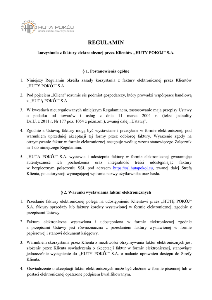 REGULAMIN korzystania z faktury elektronicznej przez Klientów „HUTY POKÓJ” S.A. § 1. Postanowienia ogólne 1. Niniejszy Regulamin określa zasady korzystania z faktury elektronicznej przez Klientów „HUTY POKÓJ” S.A. 2. Pod pojęciem „Klient” rozumie się podmiot gospodarczy, który prowadzi współpracę handlową z „HUTĄ POKÓJ” S.A. 3. W kwestiach nieuregulowanych niniejszym Regulaminem, zastosowanie mają przepisy Ustawy o podatku od towarów i usług z dnia 11 marca 2004 r. (tekst jednolity Dz.U. z 2011 r. Nr 177 poz. 1054 z późn.zm.), zwanej dalej „Ustawą”. 4. Zgodnie z Ustawą, faktury mogą być wystawiane i przesyłane w formie elektronicznej, pod warunkiem uprzedniej akceptacji tej formy przez odbiorcę faktury. Wyrażenie zgody na otrzymywanie faktur w formie elektronicznej następuje według wzoru stanowiącego Załącznik nr 1 do niniejszego Regulaminu. 5. „HUTA POKÓJ” S.A. wystawia i udostępnia faktury w formie elektronicznej gwarantując autentyczność ich pochodzenia oraz integralność treści udostępniając faktury w bezpiecznym połączeniu SSL pod adresem https://ssl.hutapokoj.eu, zwanej dalej Strefą Klienta, po autoryzacji wymagającej wpisania nazwy użytkownika oraz hasła. § 2. Warunki wystawiania faktur elektronicznych 1. Przesłanie faktury elektronicznej polega na udostępnieniu Klientowi przez „HUTĘ POKÓJ” S.A. faktury sprzedaży lub faktury korekty wystawionej w formie elektronicznej, zgodnie z przepisami Ustawy. 2. Faktura elektroniczna wystawiona i udostępniona w formie elektronicznej zgodnie z przepisami Ustawy jest równoznaczna z przesłaniem faktury wystawionej w formie papierowej i stanowi dokument księgowy. 3. Warunkiem skorzystania przez Klienta z możliwości otrzymywania faktur elektronicznych jest złożenie przez Klienta oświadczenia o akceptacji faktur w formie elektronicznej, stanowiące jednocześnie wystąpienie do „HUTY POKÓJ” S.A. o nadanie uprawnień dostępu do Strefy Klienta. 4. Oświadczenie o akceptacji faktur elektronicznych może być złożone w formie pisemnej lub w postaci elektronicznej opatrzone podpisem kwalifikowanym. 5. Na życzenie Klienta udostępnione faktury mogą być opatrzone podpisem kwalifikowanym. 6. Faktury elektroniczne są udostępniane w internetowej Strefie Klienta od godziny 20.00 tego samego dnia. 7. Oświadczenie Klienta o akceptacji faktur w formie elektronicznej nie pozbawia „HUTY POKÓJ” S.A. prawa do wystawiania i przesyłania faktur, duplikatów faktur i faktur korygujących w formie papierowej w przypadkach przewidzianych przez prawo. 8. Faktury przesłane drogą elektroniczną są przechowywane zgodnie z pkt. 8.1. w sposób zapewniający: a) autentyczność pochodzenia, integralność treści i czytelność tych faktur od momentu ich wystawienia do czasu upływu terminu przedawnienia zobowiązania podatkowego; b) łatwe ich odszukanie; c) bezzwłoczny dostęp do faktur, ich pobór i przetwarzanie danych (Art. 112 i 112a ust. 4 Ustawy) przez organ podatkowy lub organ kontroli skarbowej, na ich żądanie, zgodnie z odrębnymi przepisami. 8.1. Faktury elektroniczne przechowywane są cyklu miesięcznym w następujący sposób: a) w folderach, na serwerach w Wydziale Informatyki, Automatyki i Łączności – W8, objętych cyklem tworzenia kopii zapasowych oraz dodatkowo zapisywane są na drugim serwerze znajdującym się w Budynku Zarządu Spółki, b) na płytach CD/DVD przechowywanych i Łączności – W8 w szafie ogniotrwałej. w Wydziale Informatyki, Automatyki 9. Faktury elektroniczne są dostępne w Strefie Klienta przez okres 3 (trzech) miesięcy, po tym okresie na żądanie Klienta „HUTA POKÓJ” S.A. wystawi duplikat pierwotnej faktury elektronicznej przesyłając ją Klientowi w formie pliku PDF. Faktury elektroniczne po upływie wskazanych 3 (trzech) miesięcy przekazuje się do przechowania we właściwym im archiwum. § 3. Rezygnacja z faktury elektronicznej 1. Rezygnacji z możliwości wystawiania i otrzymywania faktur elektronicznych można dokonać w formie pisemnej przy wykorzystaniu wzoru stanowiącego Załącznik nr 2 do niniejszego Regulaminu. 2. Ponowna aktywacja możliwości otrzymywania faktur elektronicznych wymaga ponownego złożenia oświadczenia, o którym mowa w § 2 ust.3 niniejszego Regulaminu. § 4 Postanowienia końcowe 1. „HUTA POKÓJ” S.A. zastrzega sobie prawo zmiany niniejszego Regulaminu. Wszelkie zmiany będą publikowane na stronie internetowej https://ssl.hutapokoj.eu. 2. Regulamin i wszelkie jego zmiany wchodzą w życie z dniem opublikowania na stronie internetowej https://ssl.hutapokoj.eu.